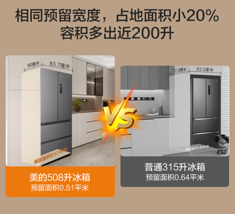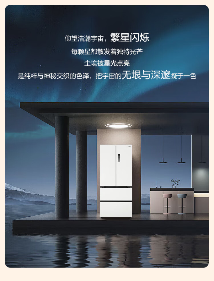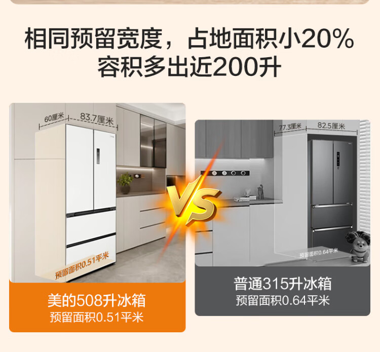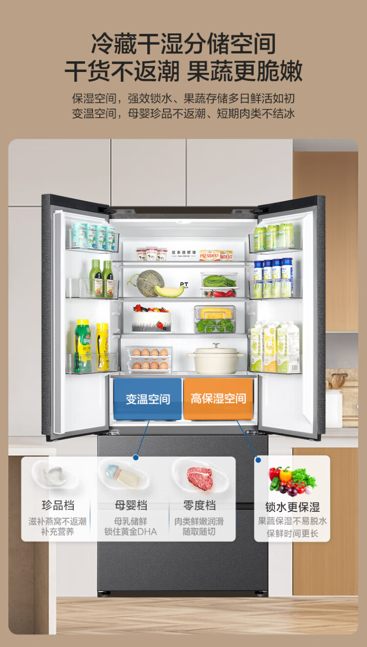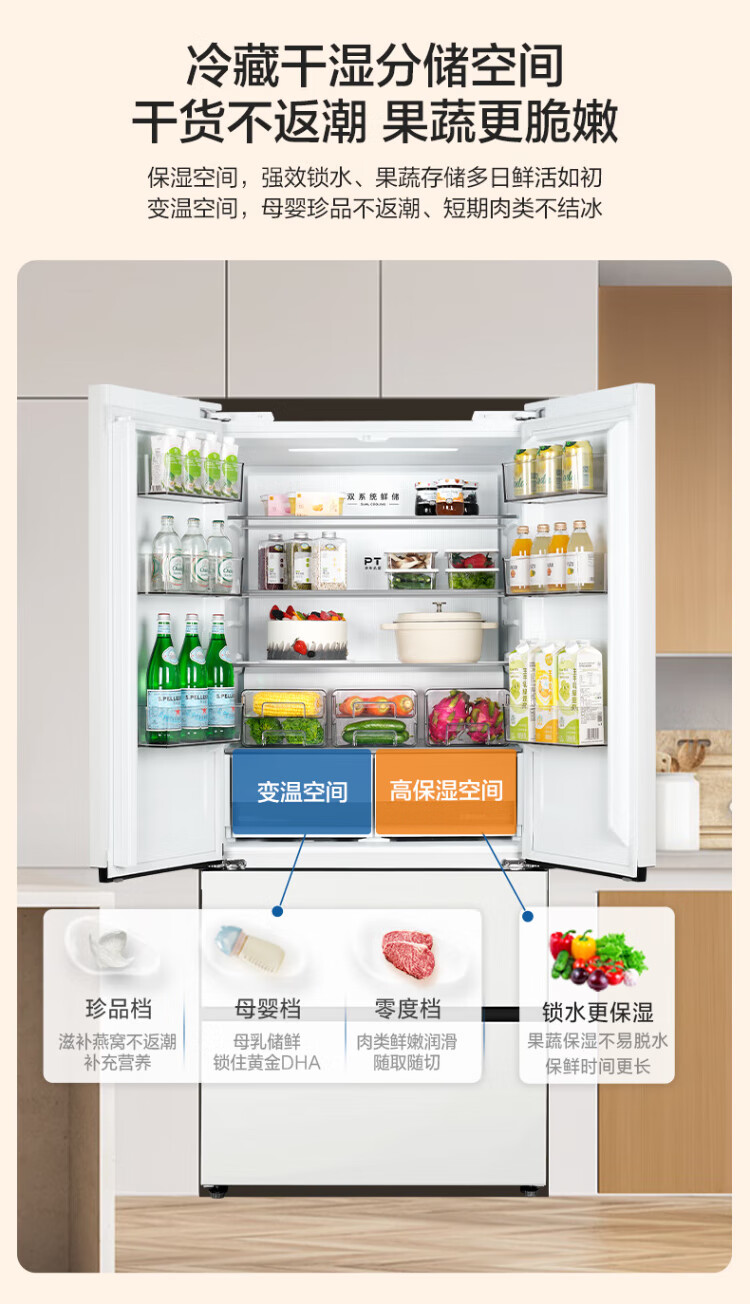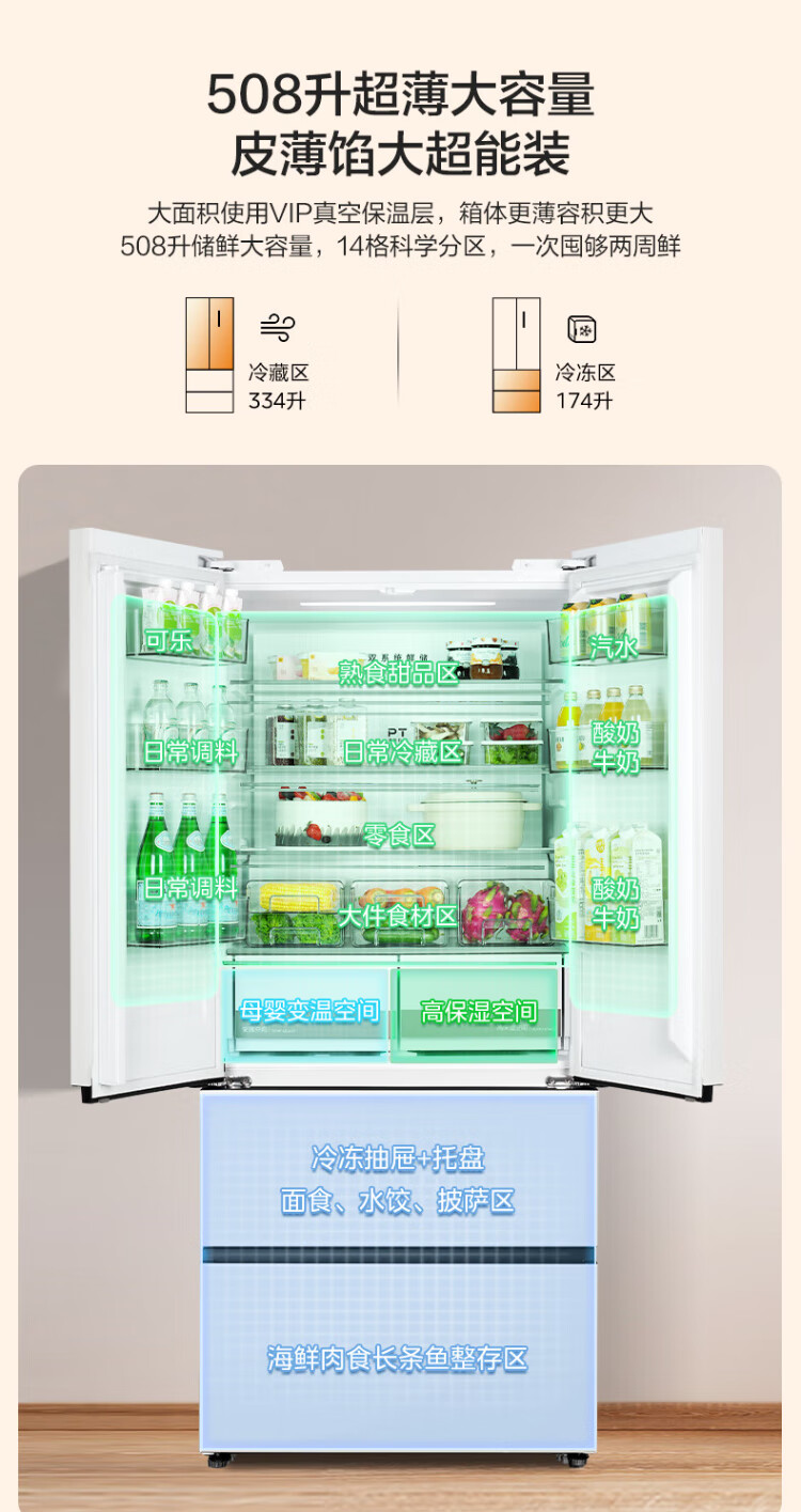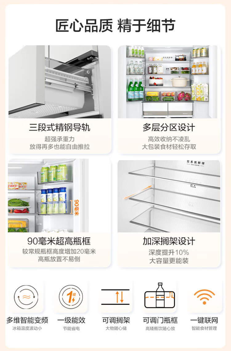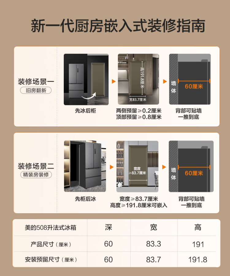 Midea Zhenxiang series 508 French multi-door 60cm ultra-thin zero-embedded four-door dual-system bottom cooling refrigerator subsidy instant discount BCD-508WUFPZM (E) Stardust Sand