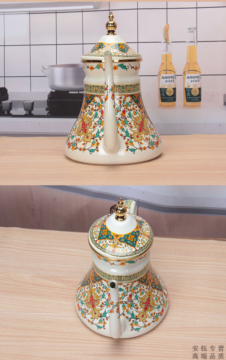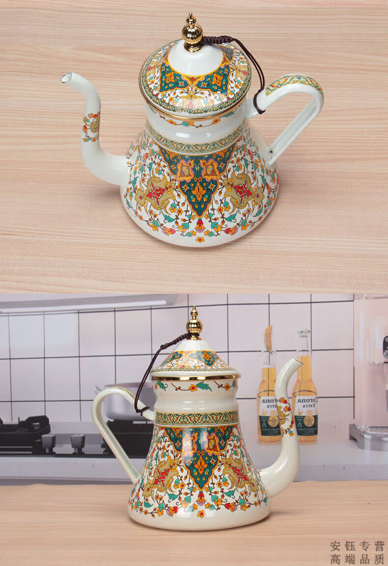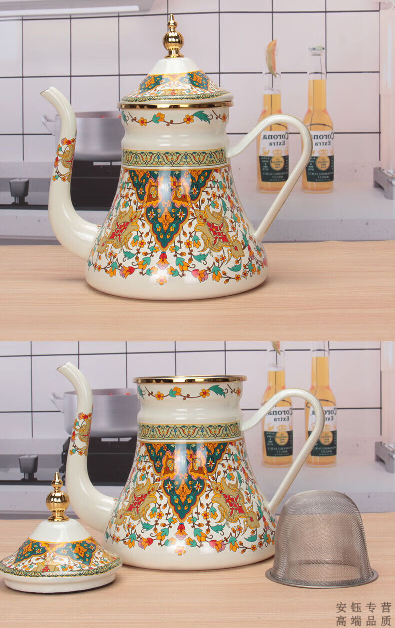 OEMG Russia imported 1.2L enamel milk kettle oil kettle vinegar pot coffee pot tea cold kettle enamel flower teapot 1.2L waist kettle (Russian flower) with filter