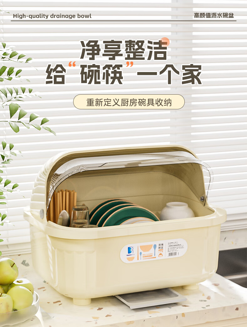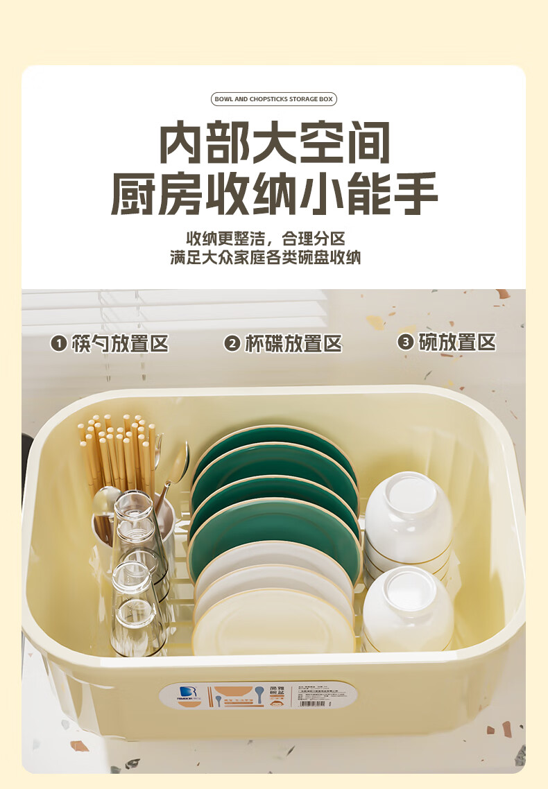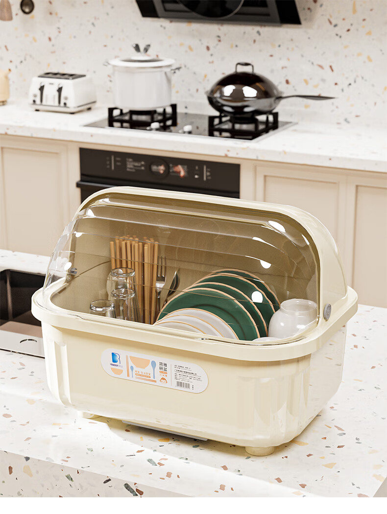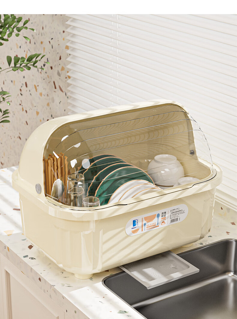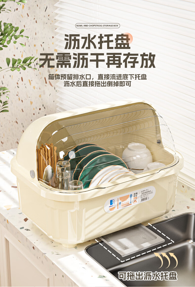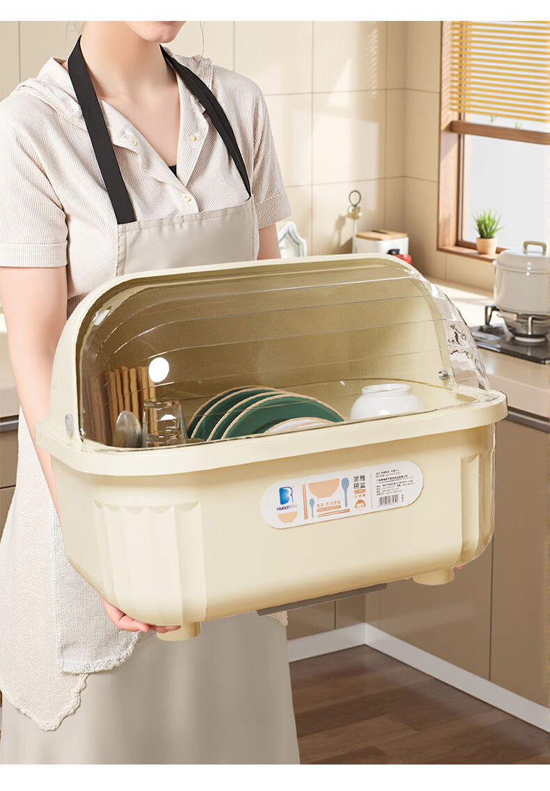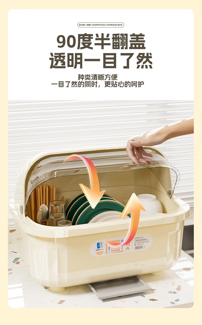 Liangbao bowl rack drain cupboard with cover for dishes, dishes, cutlery box, bowl box, home kitchen dishware rack, bowl and basin, main picture, large flip cover, about 6-10 people, milky white