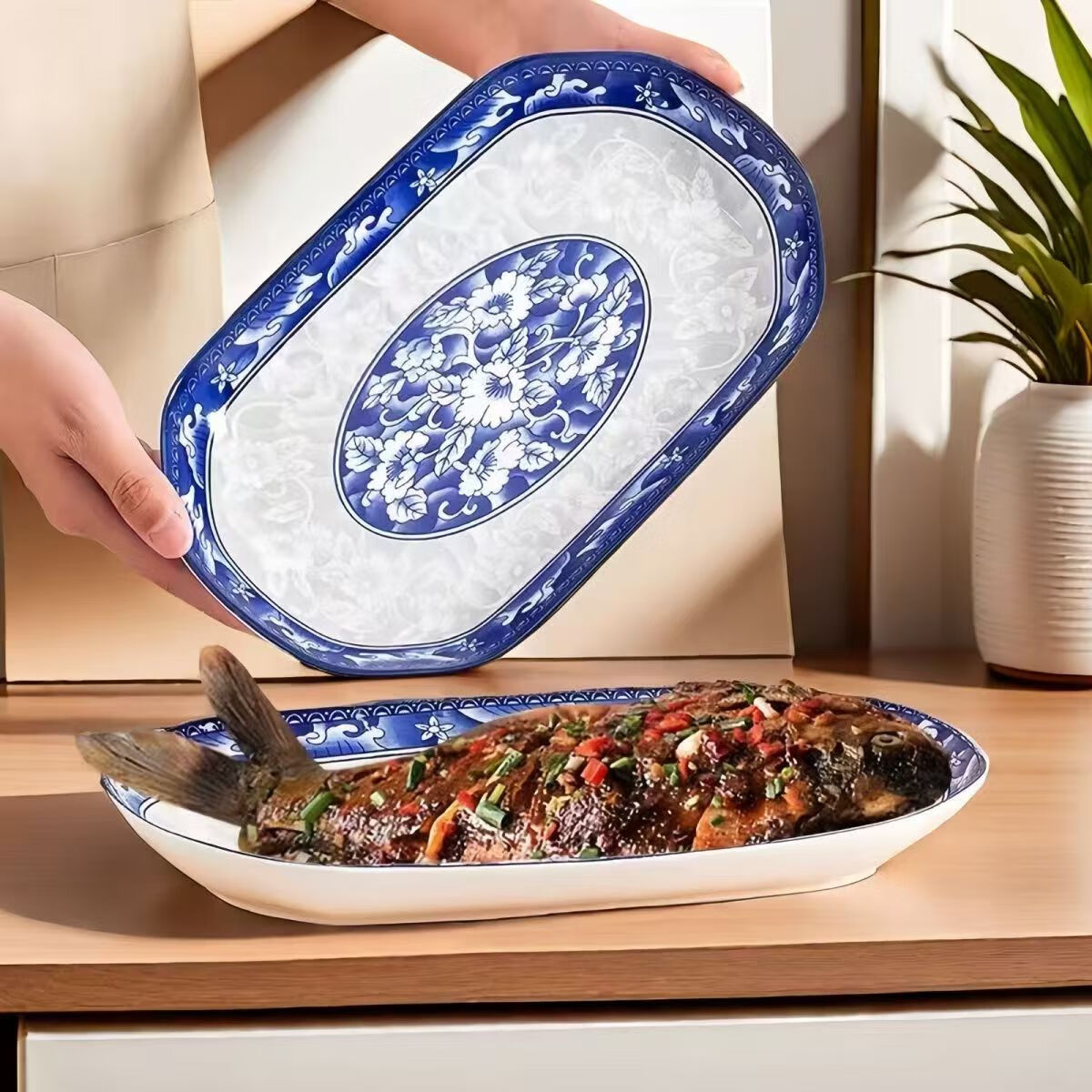 Household Chinese-style blue and white porcelain large ceramic fish plate deep plate underglaze color plate that can withstand high temperatures and does not fade. Blue and white porcelain fish plate diameter 30cm*1 piece