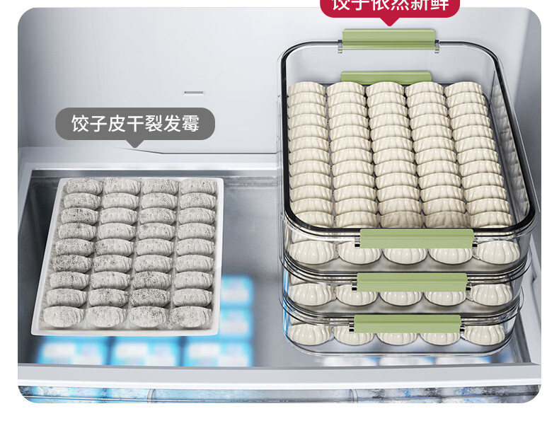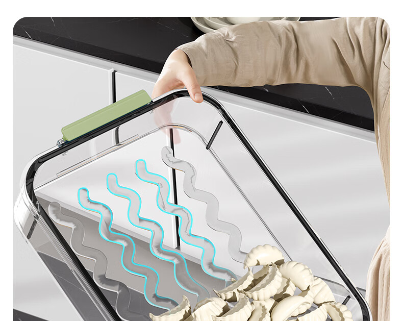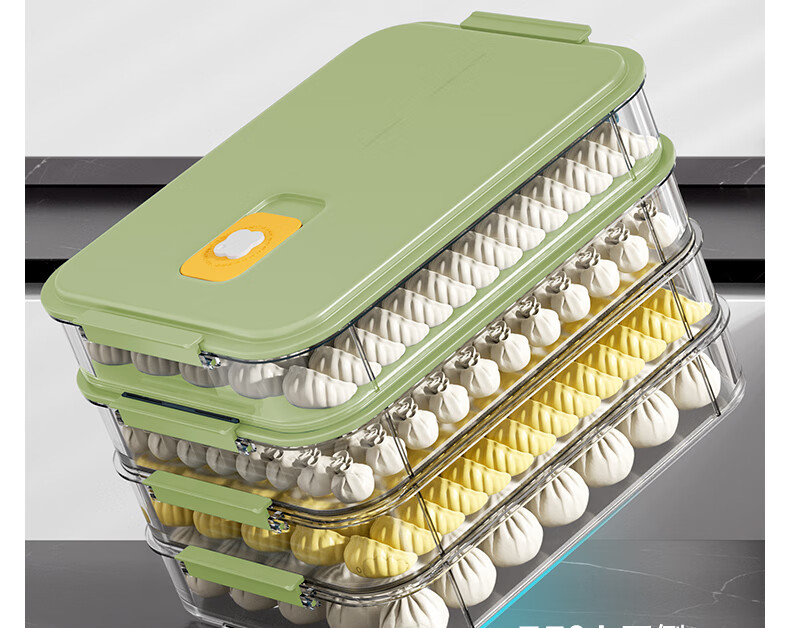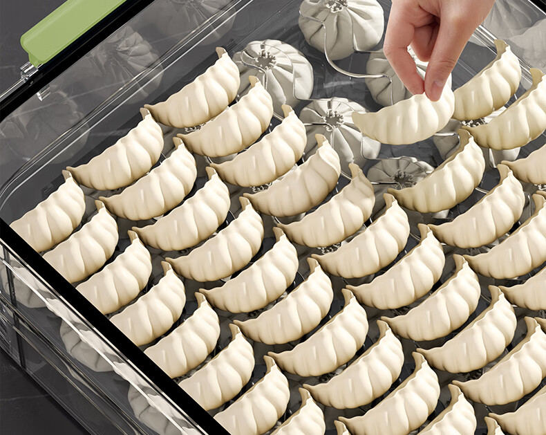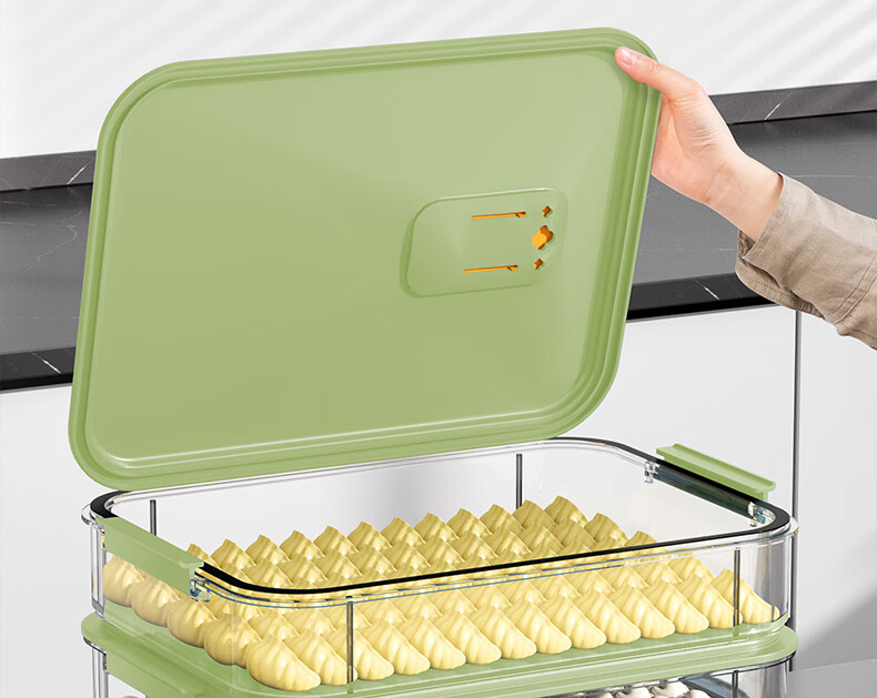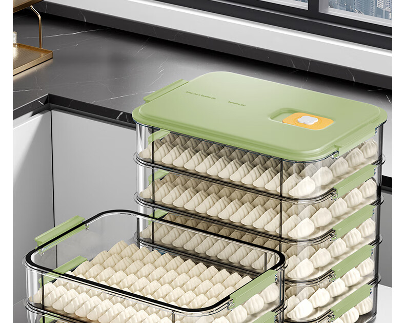 WELLMEET dumpling storage box for refrigerator, food-grade freezing, special kitchen quick-frozen dumpling crisper tray, wonton hand, green, 2 layers, non-stick bottom - holds 140 dumplings