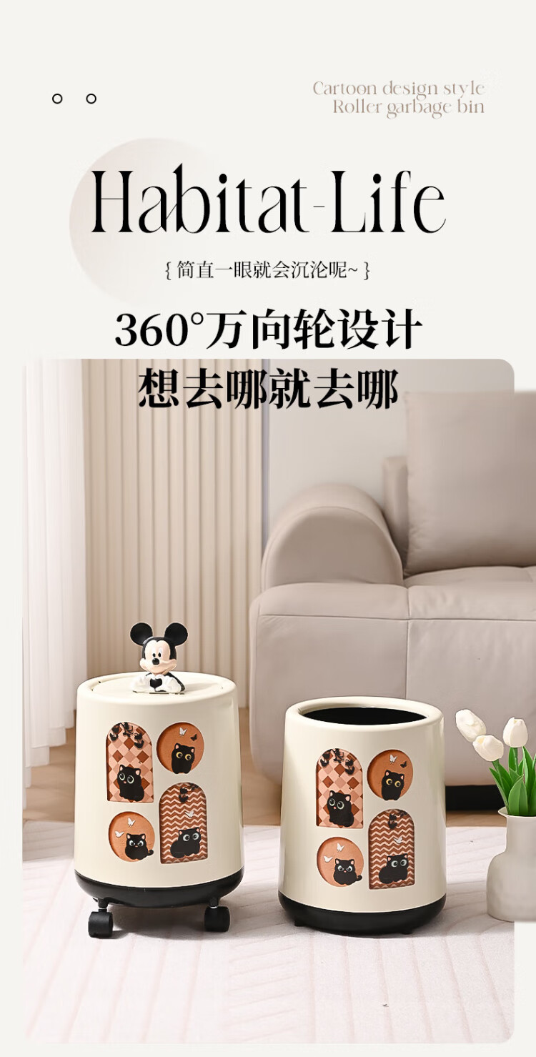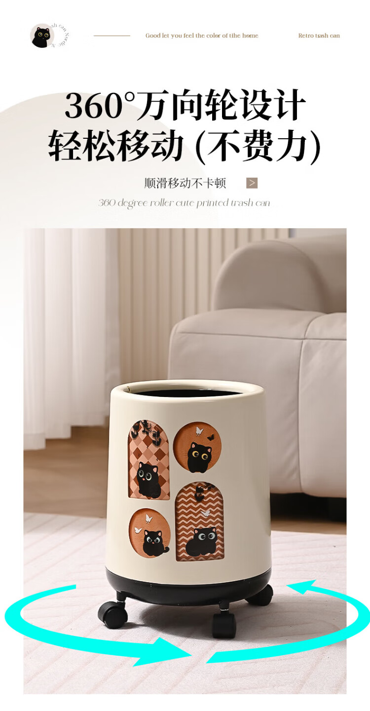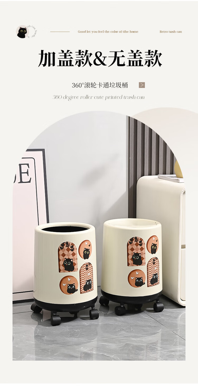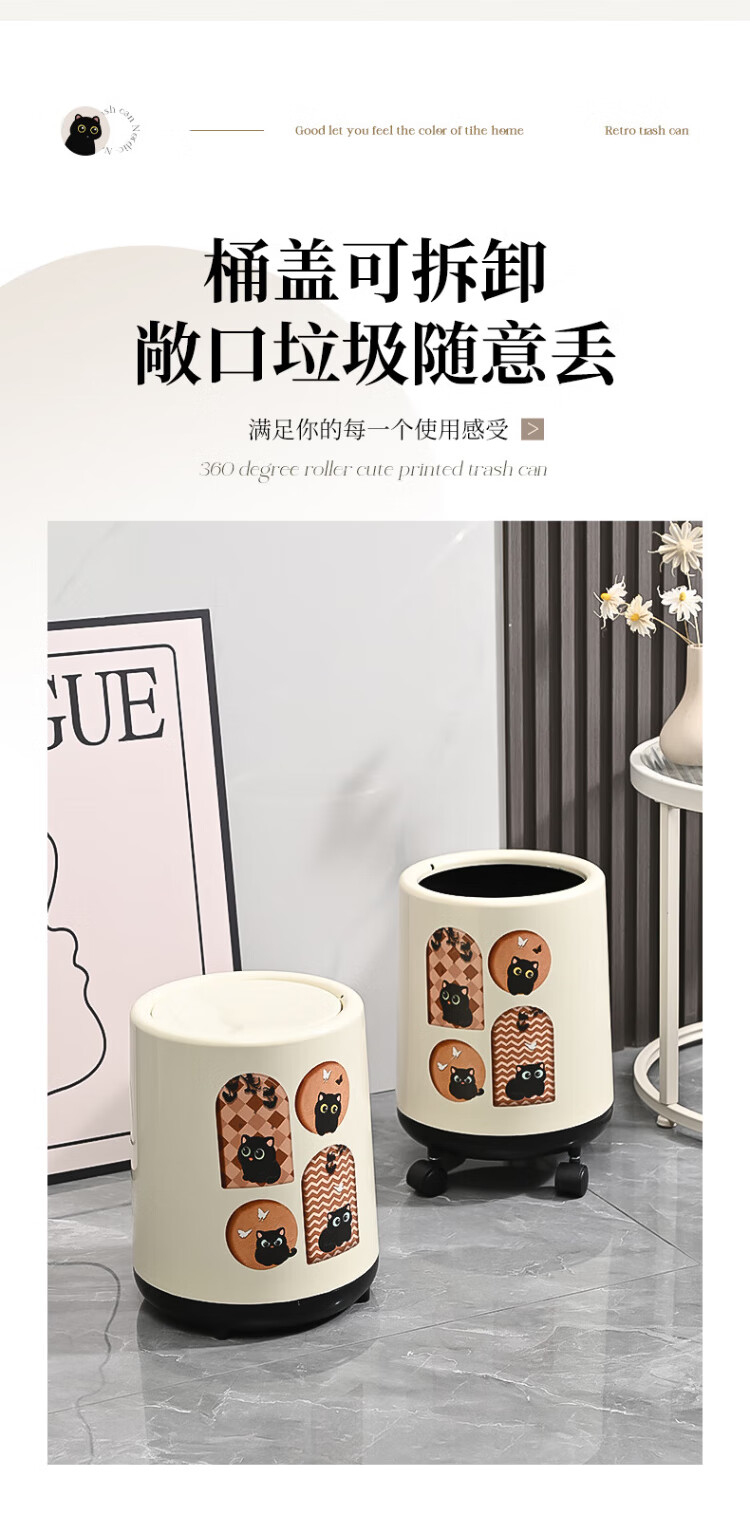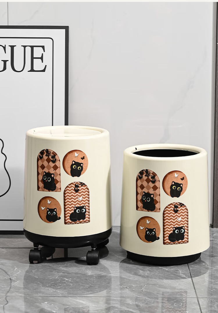 Baiyite trash can household 2025 new model living room kitchen bedroom removable high-value cartoon cute sanitary bucket with wheels large round trash can without lid and wheels