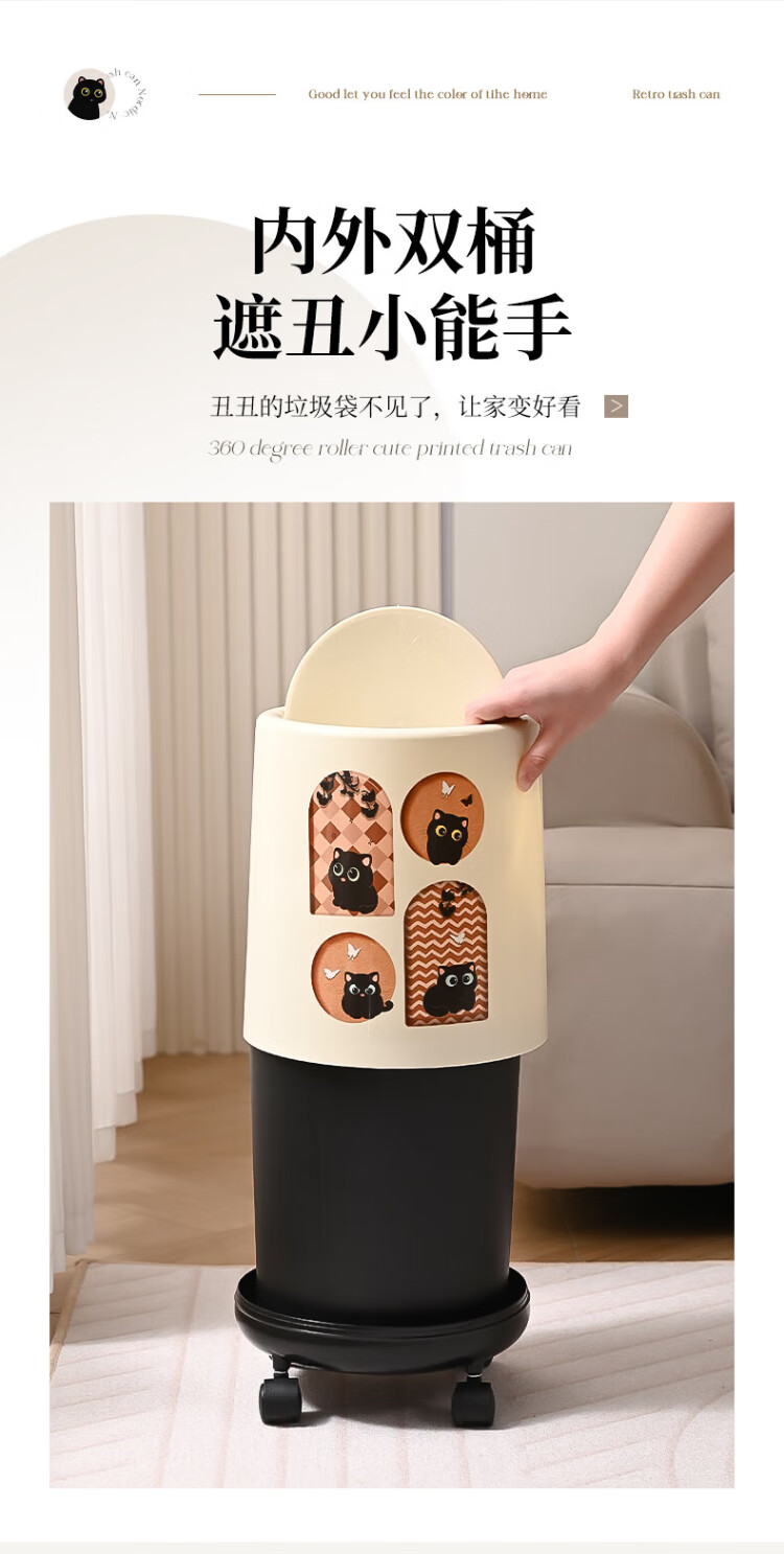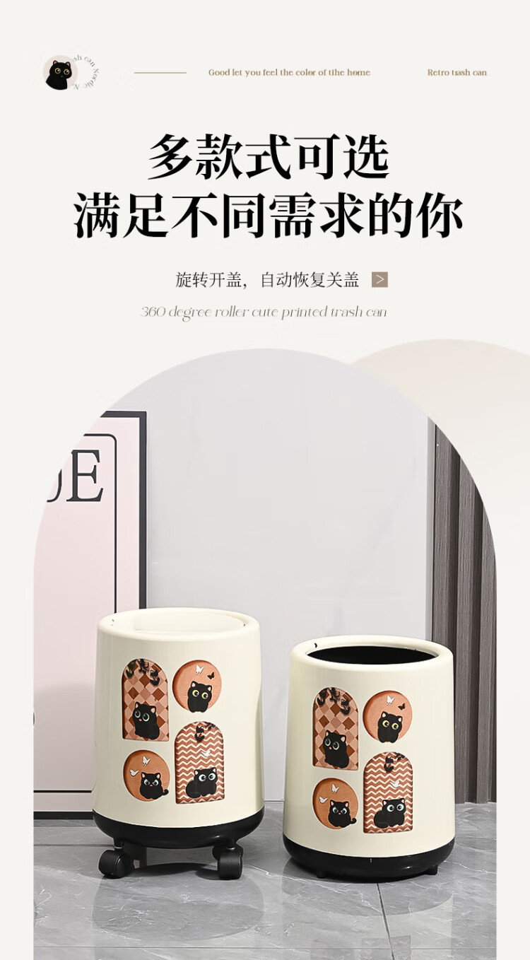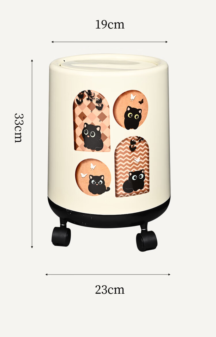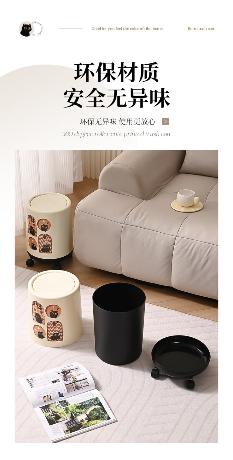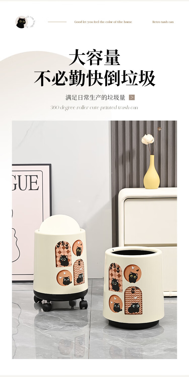 Baiyite trash can household 2025 new model living room kitchen bedroom removable high-value cartoon cute sanitary bucket with wheels large round trash can without lid and wheels