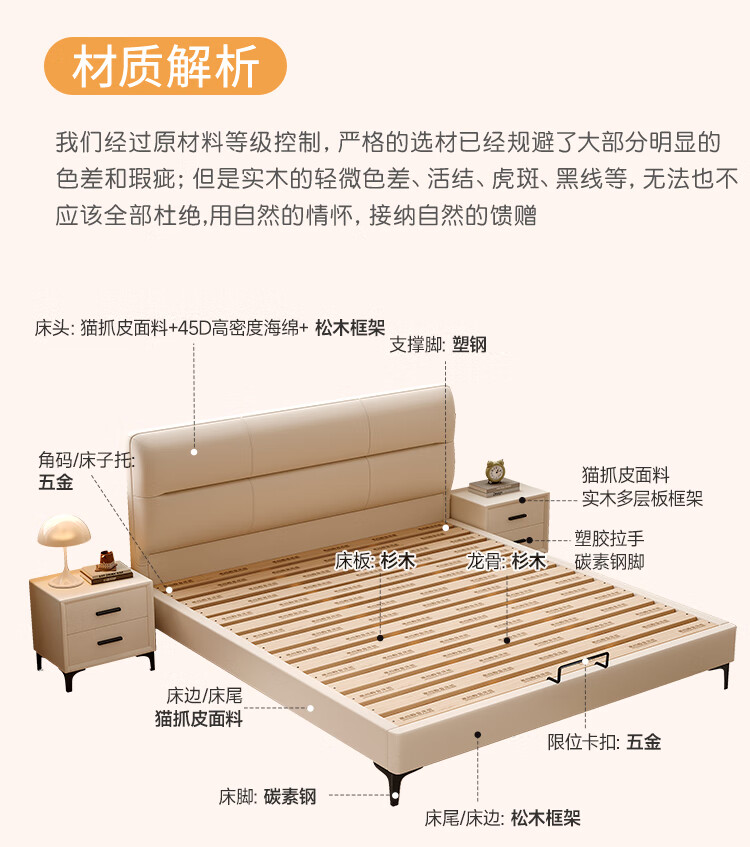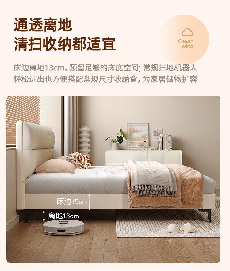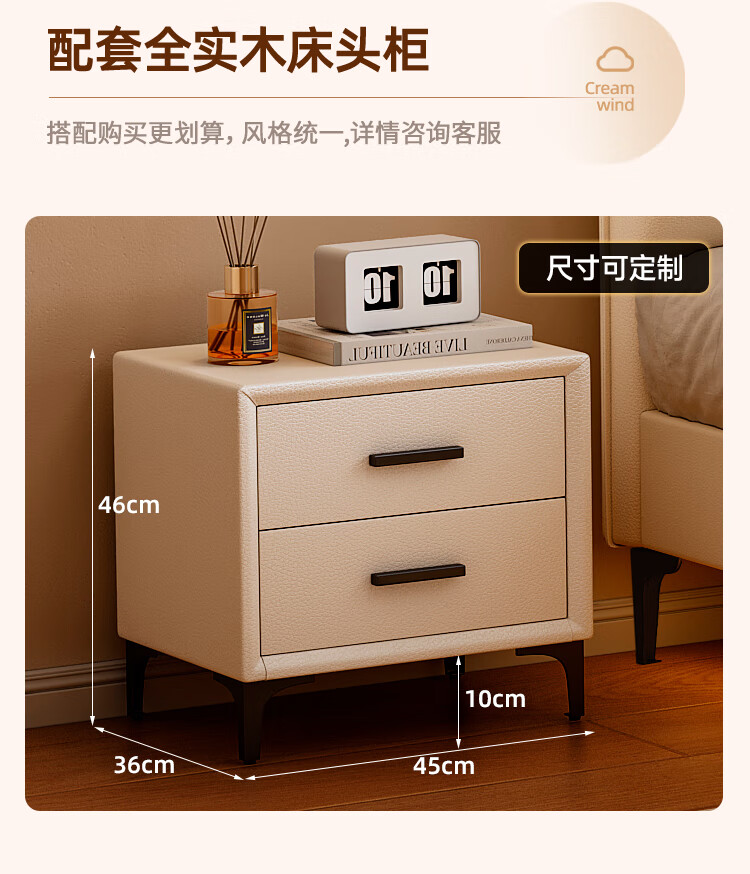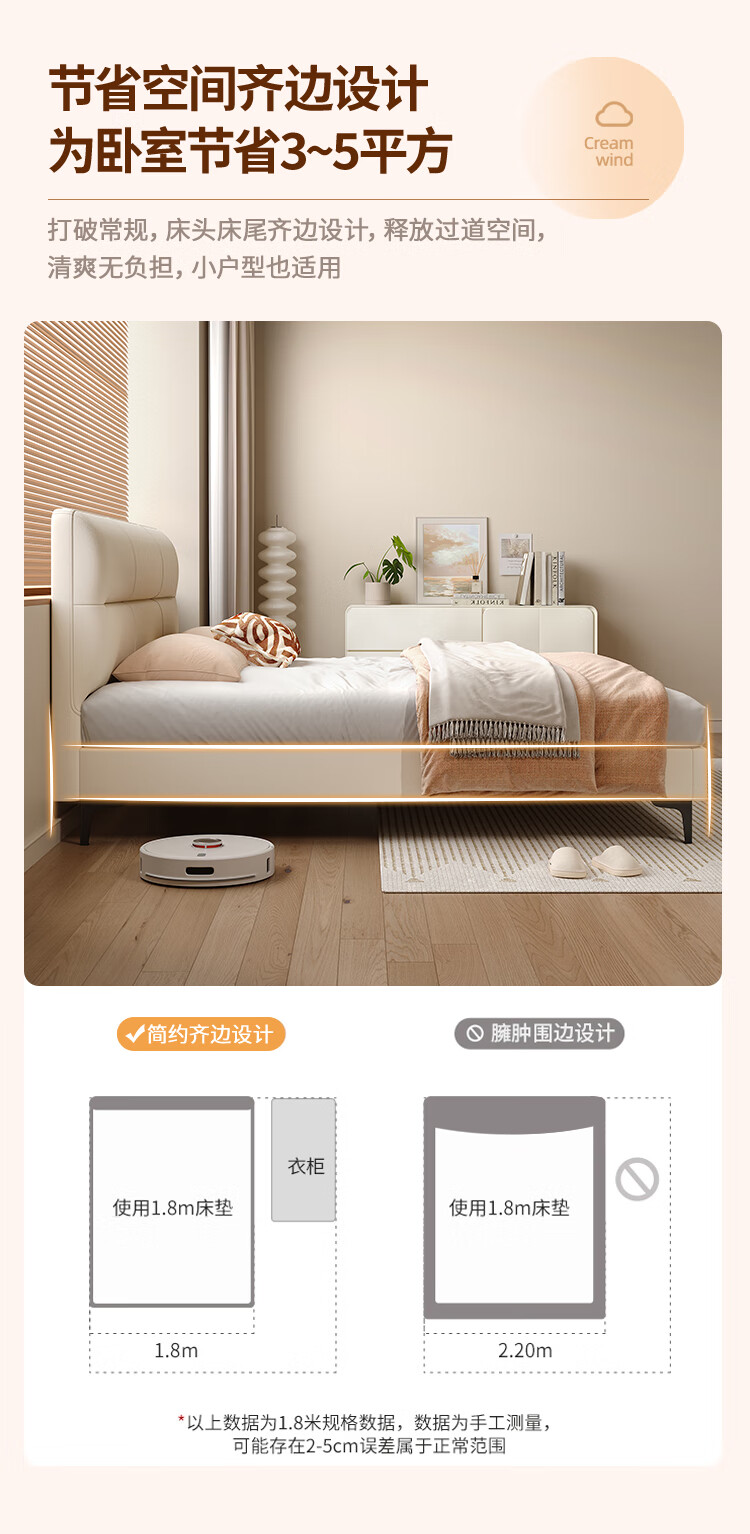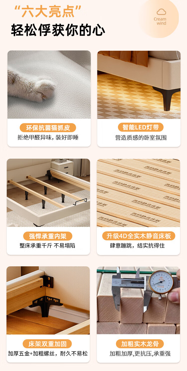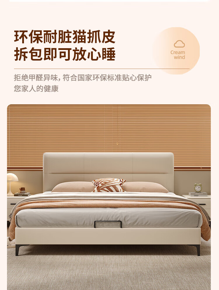 Langxiang solid wood double bed 1.8 meters 2 meters row frame edge frame leather bed master bedroom cream style wedding bed furniture bed + 20cm independent spring mattress 1.8*2 meters