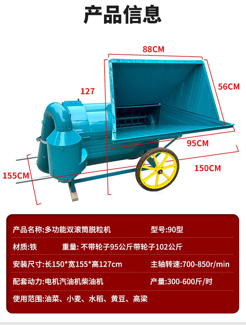Wen Yijia 90 double drum rape thresher agricultural multi-functional rice, wheat, soybean and sorghum new thresher 90 double drum + wheel without power, free screen