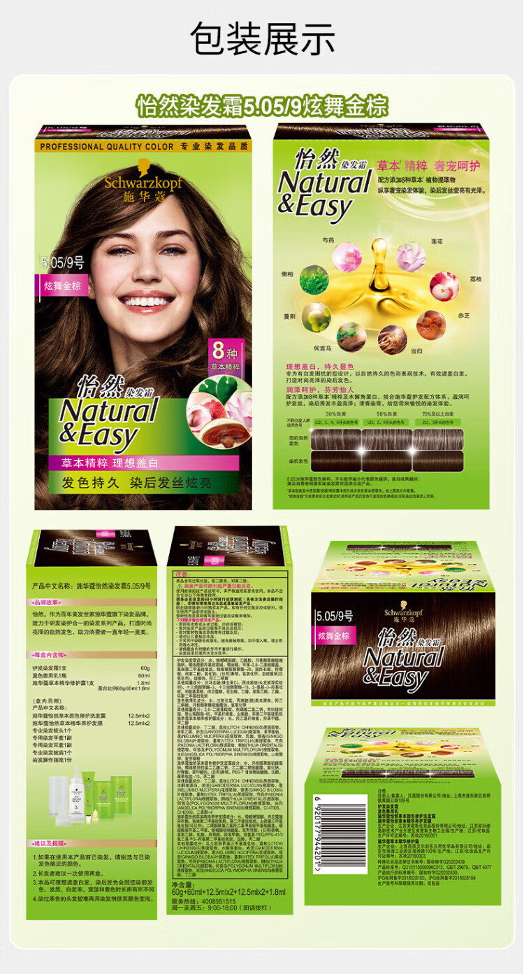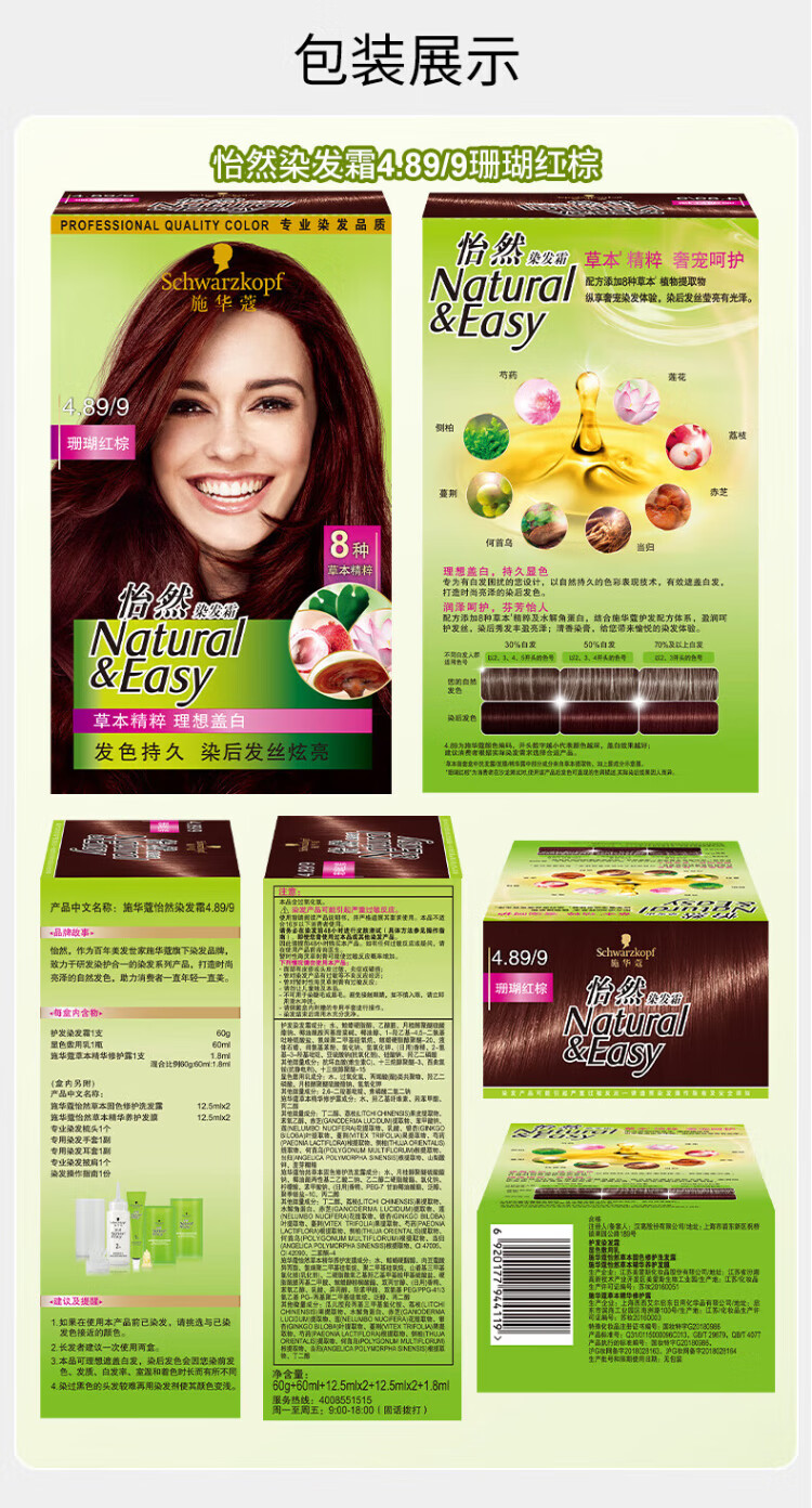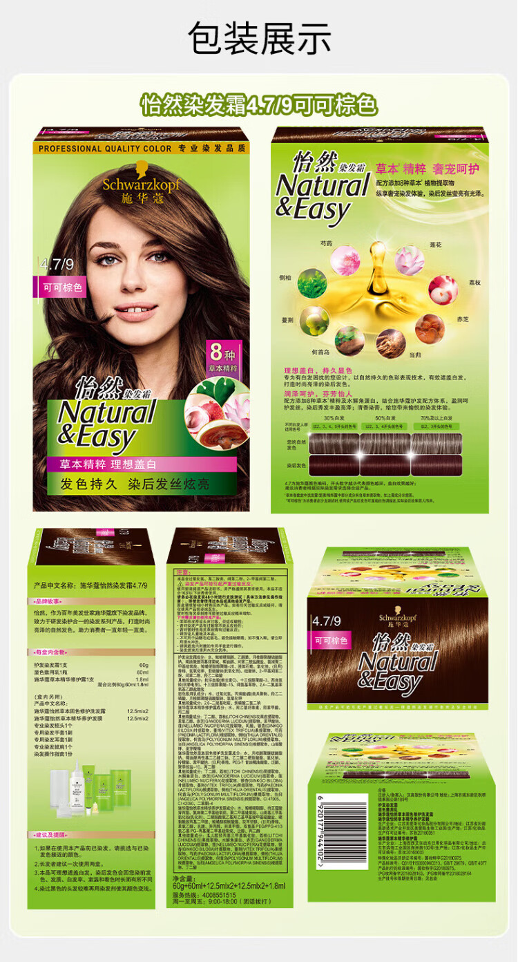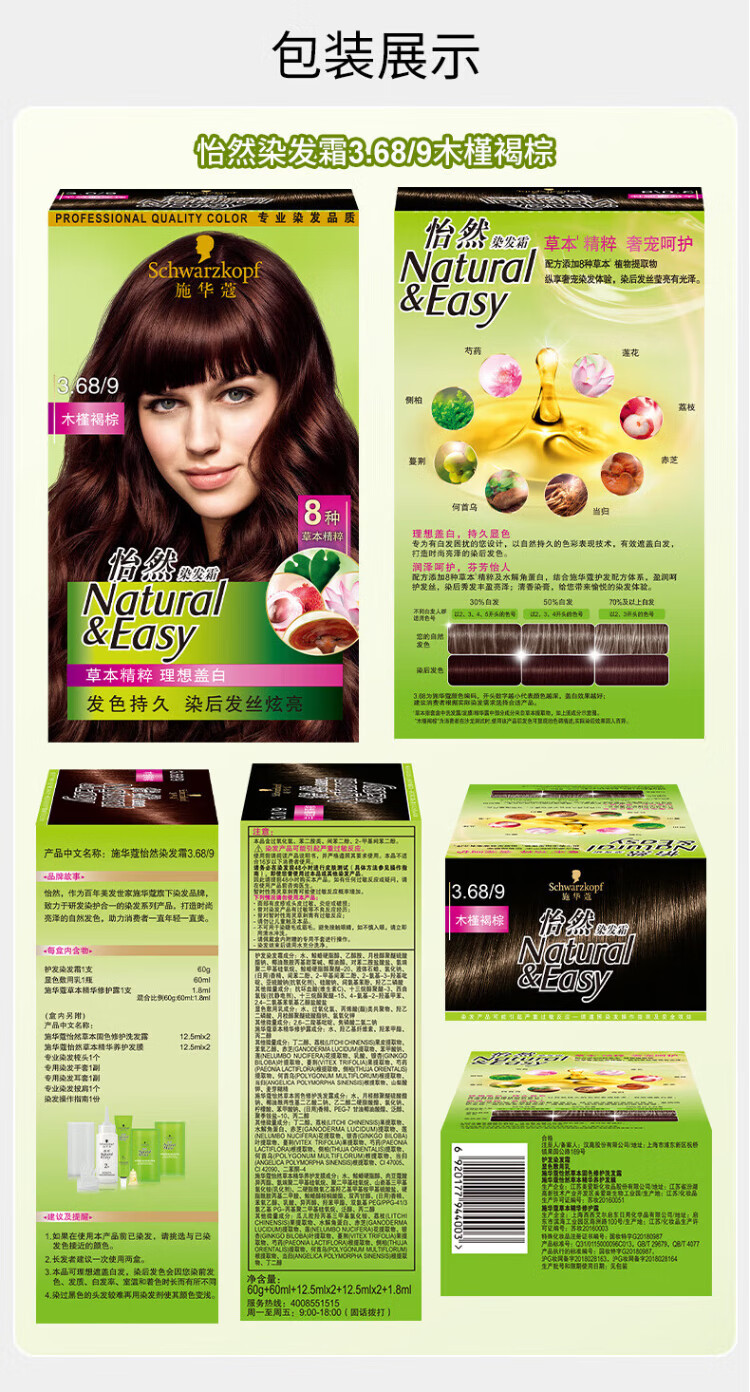 Schwarzkopf Yiran plant hair dye cream herbal hair dye hair cream for men and women to cover gray hair 3.68/9 hibiscus brown (cool color)