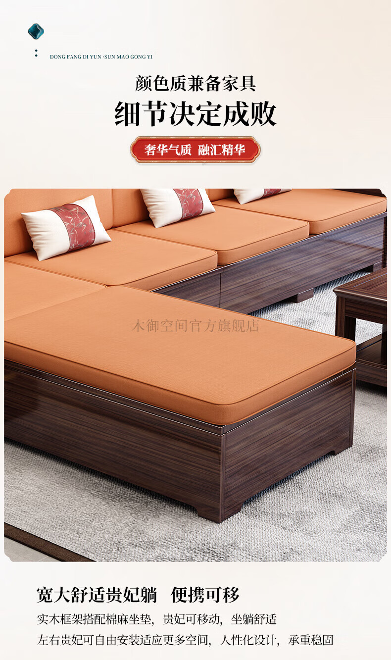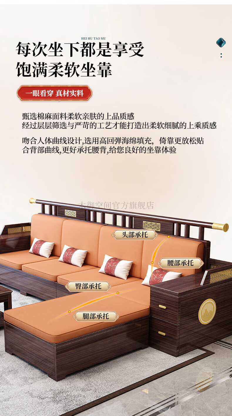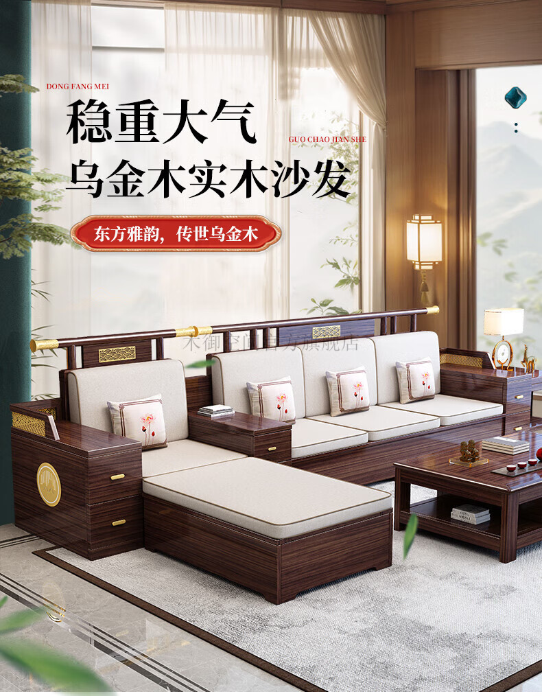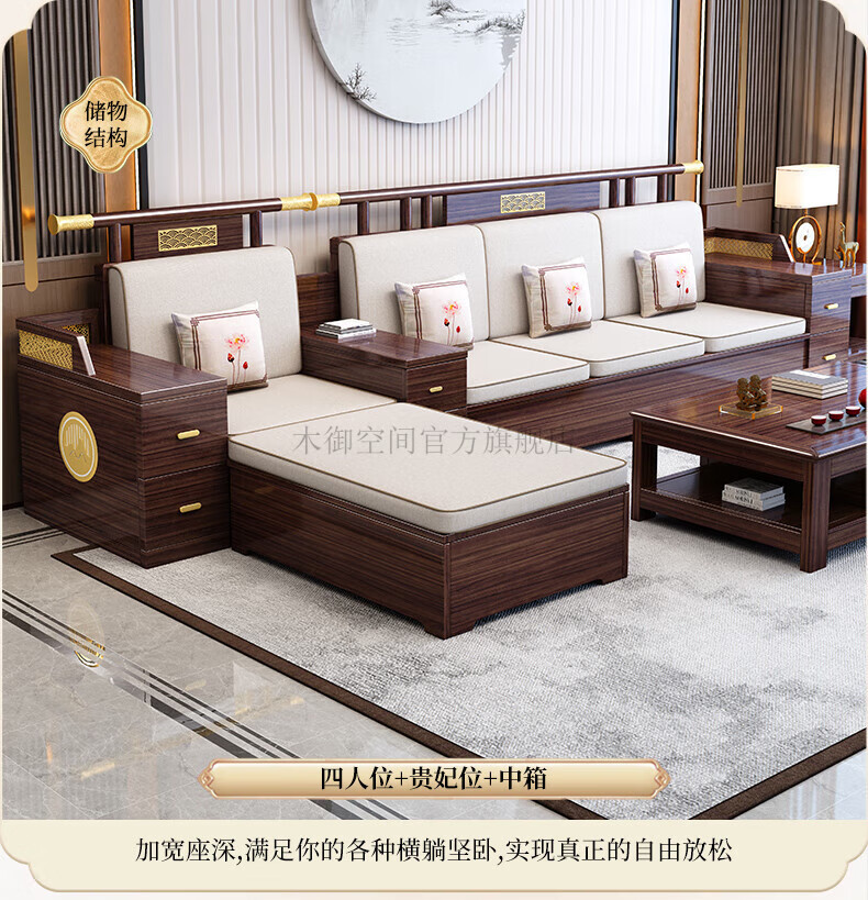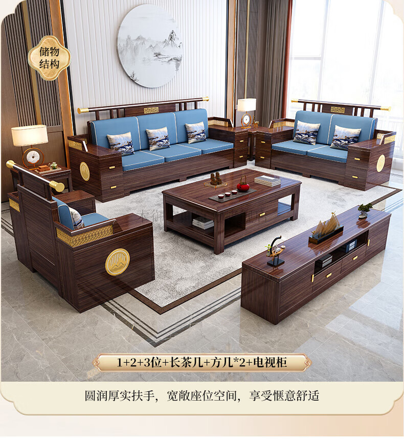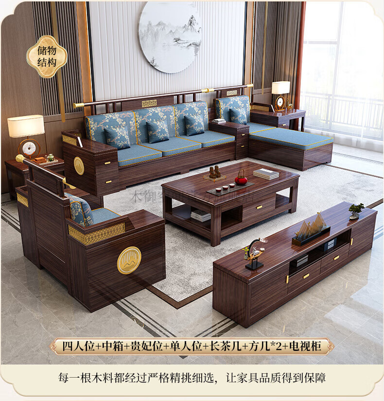 Muyu Space New Chinese Style Ebony Wood Solid Wood Sofa Living Room 2025 New Small Apartment Storage Style Imperial Concubine Wooden Furniture Complete Set 1+2+3+ Coffee Table+ Square Table*2+ TV Cabinet