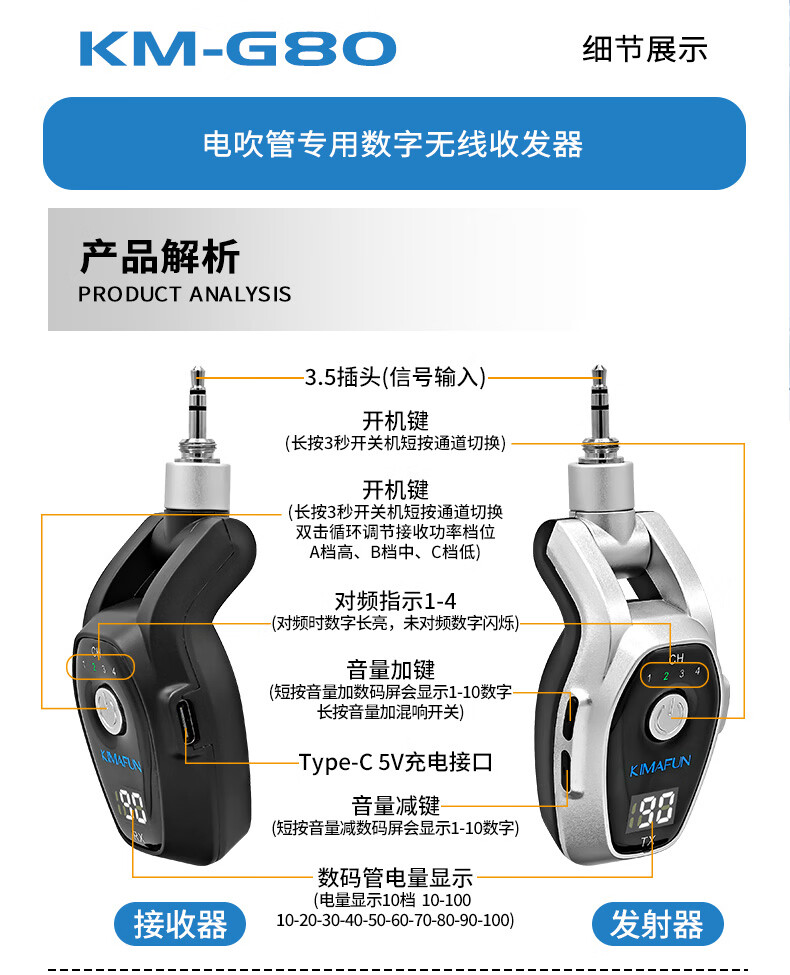 Crystal Microphone G80 electric blowpipe teaching performance wireless transceiver ultra-long battery life with reverberation connector one to two G80 electric blowpipe dedicated one to one