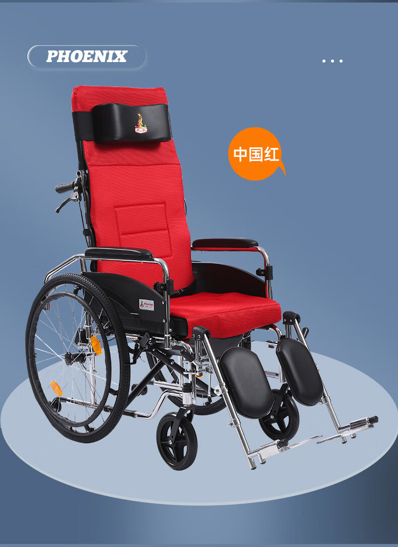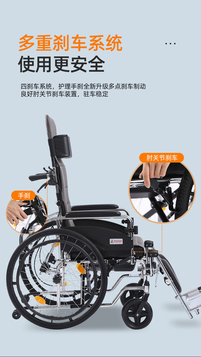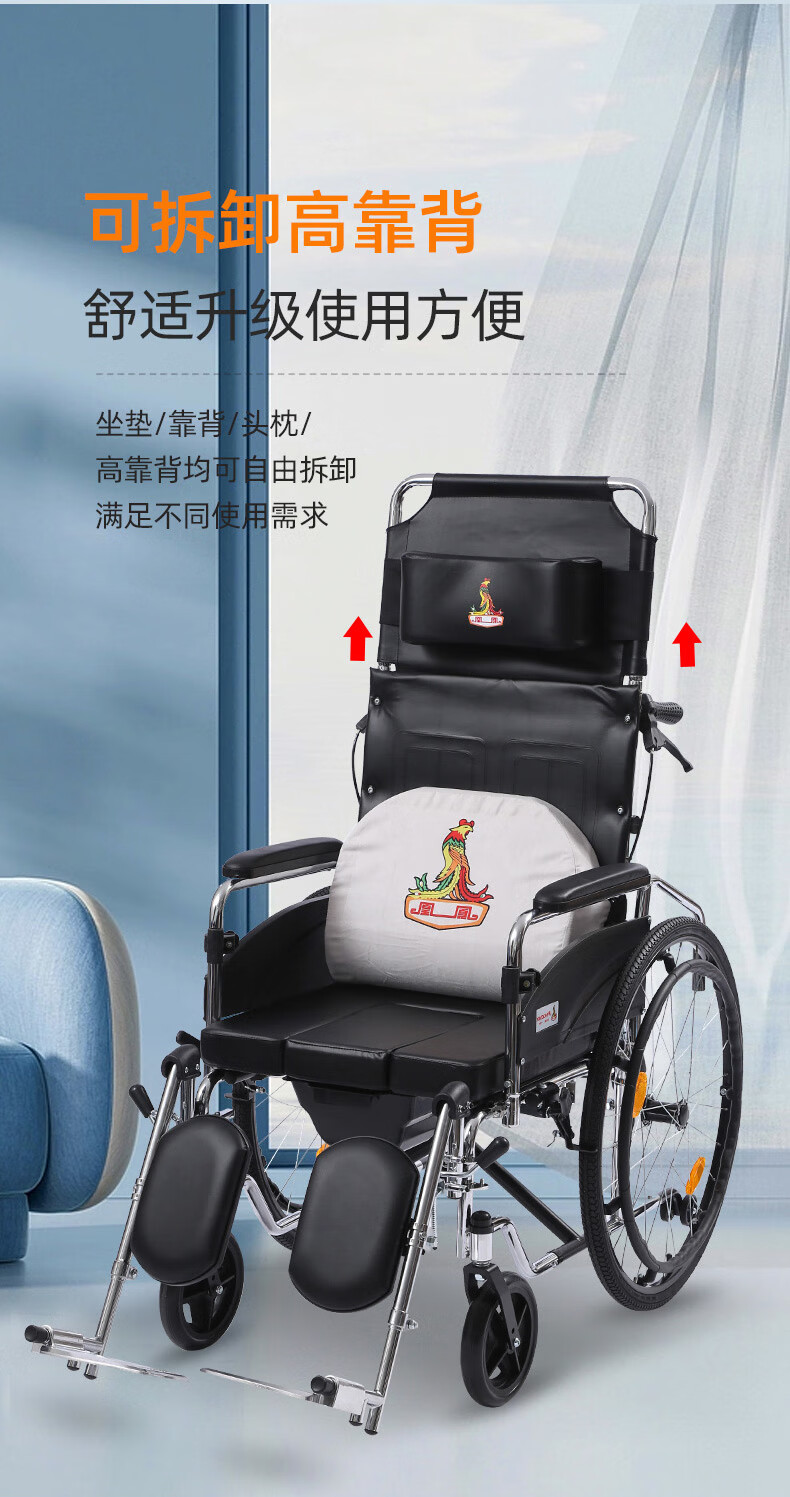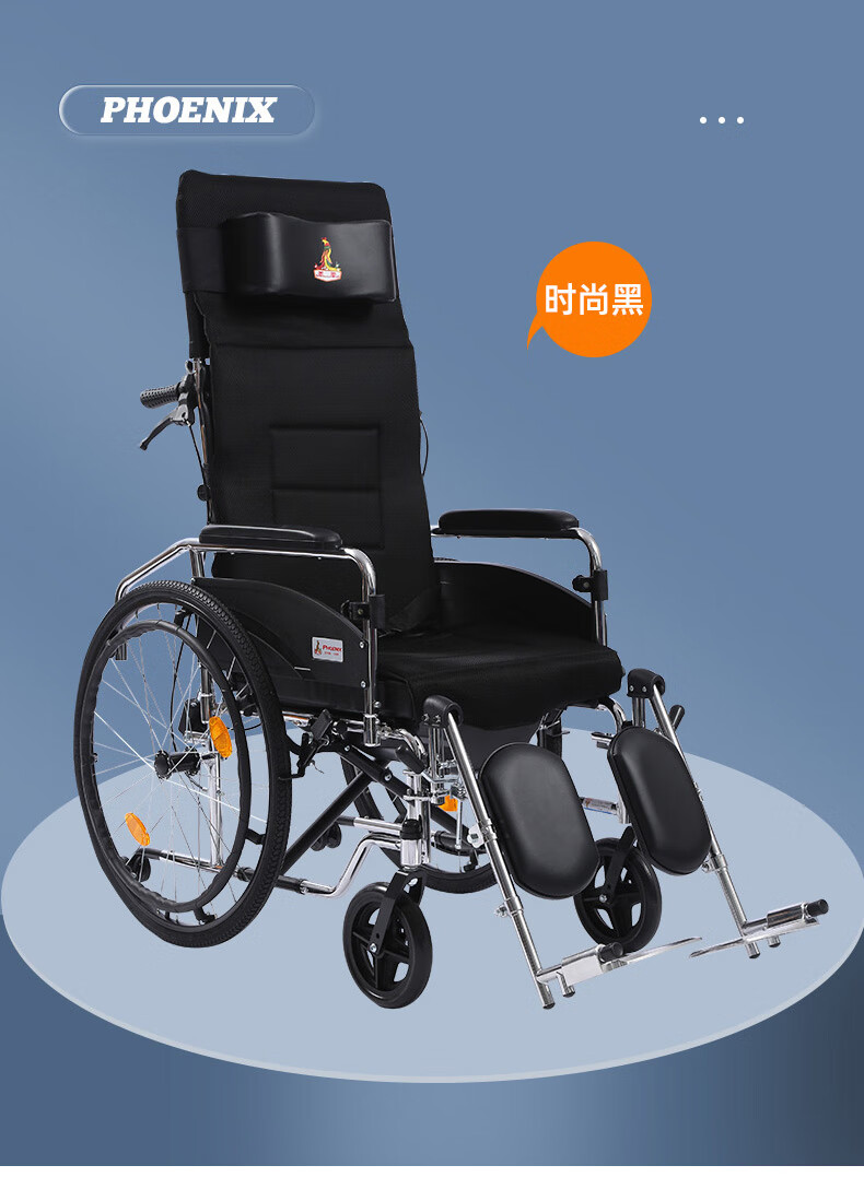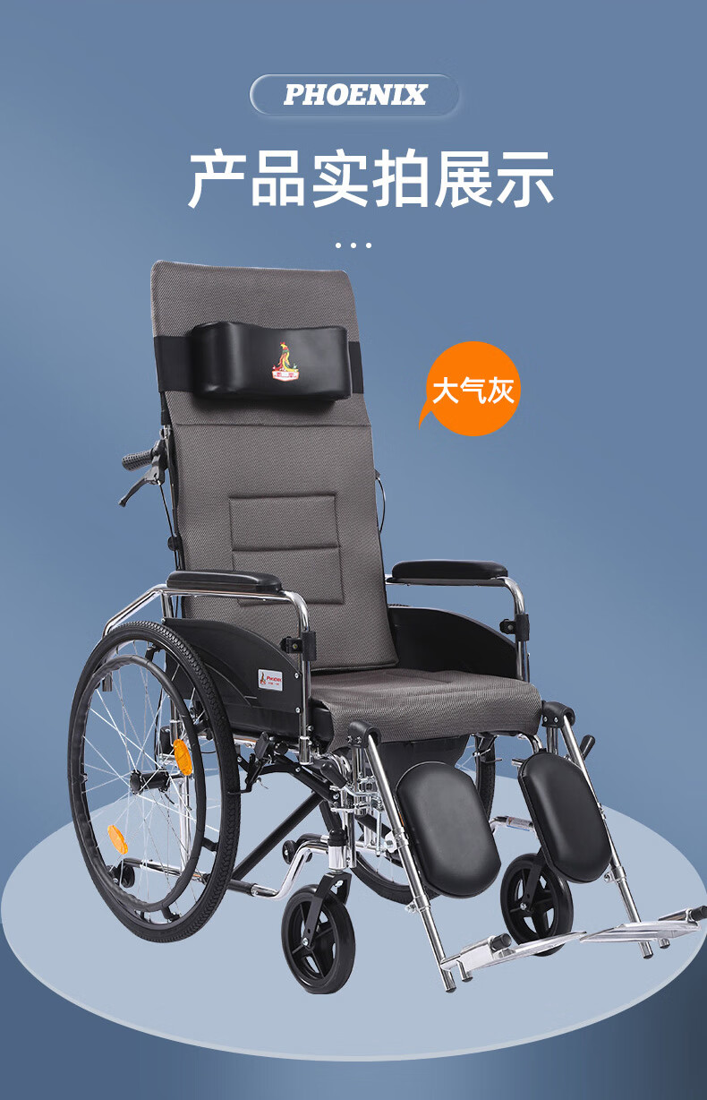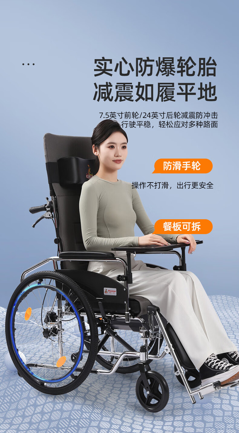 Phoenix multifunctional wheelchair, foldable and lightweight, with seat and commode, portable stroller for the elderly, fully reclined and semi-reclining, walking aid, bathing, Phoenix official +903 electroplated frame, dining table, seated, fully reclined and semi-reclining, leather fabric, solid tire + water cup holder