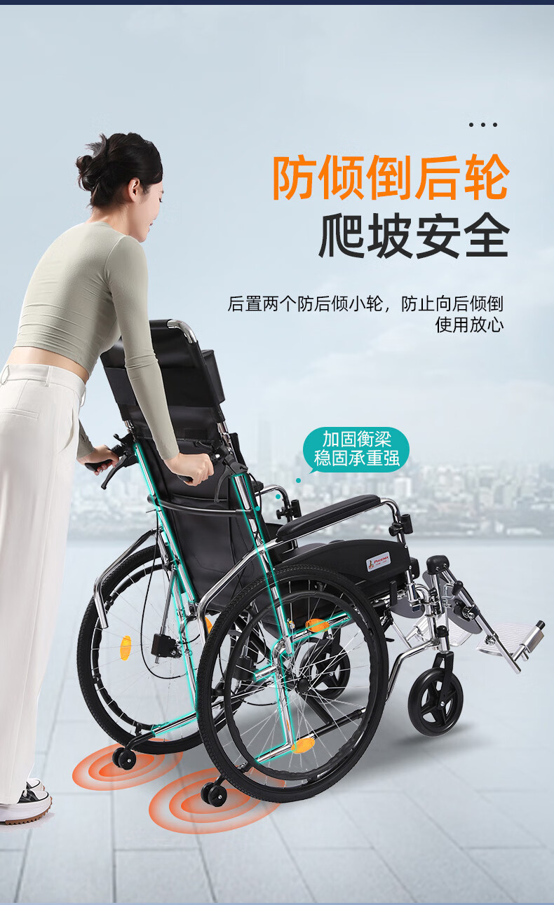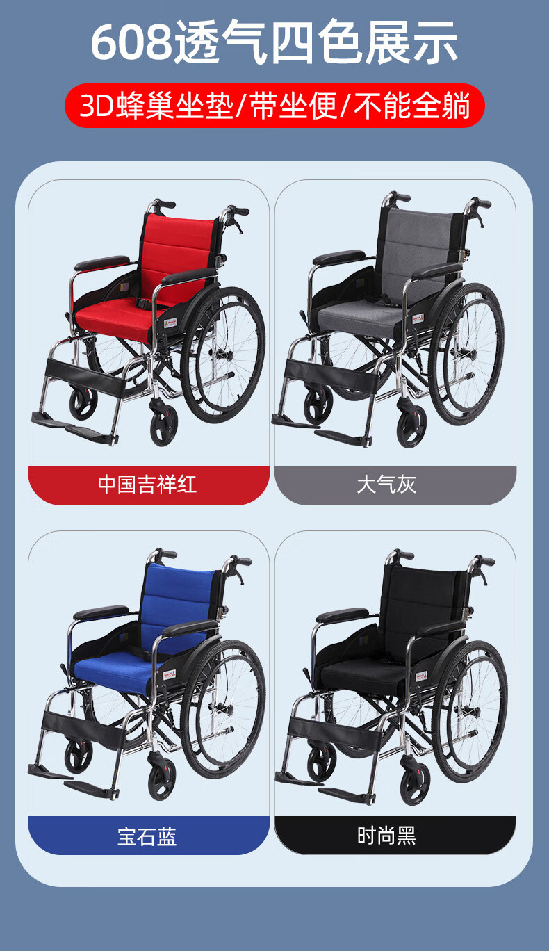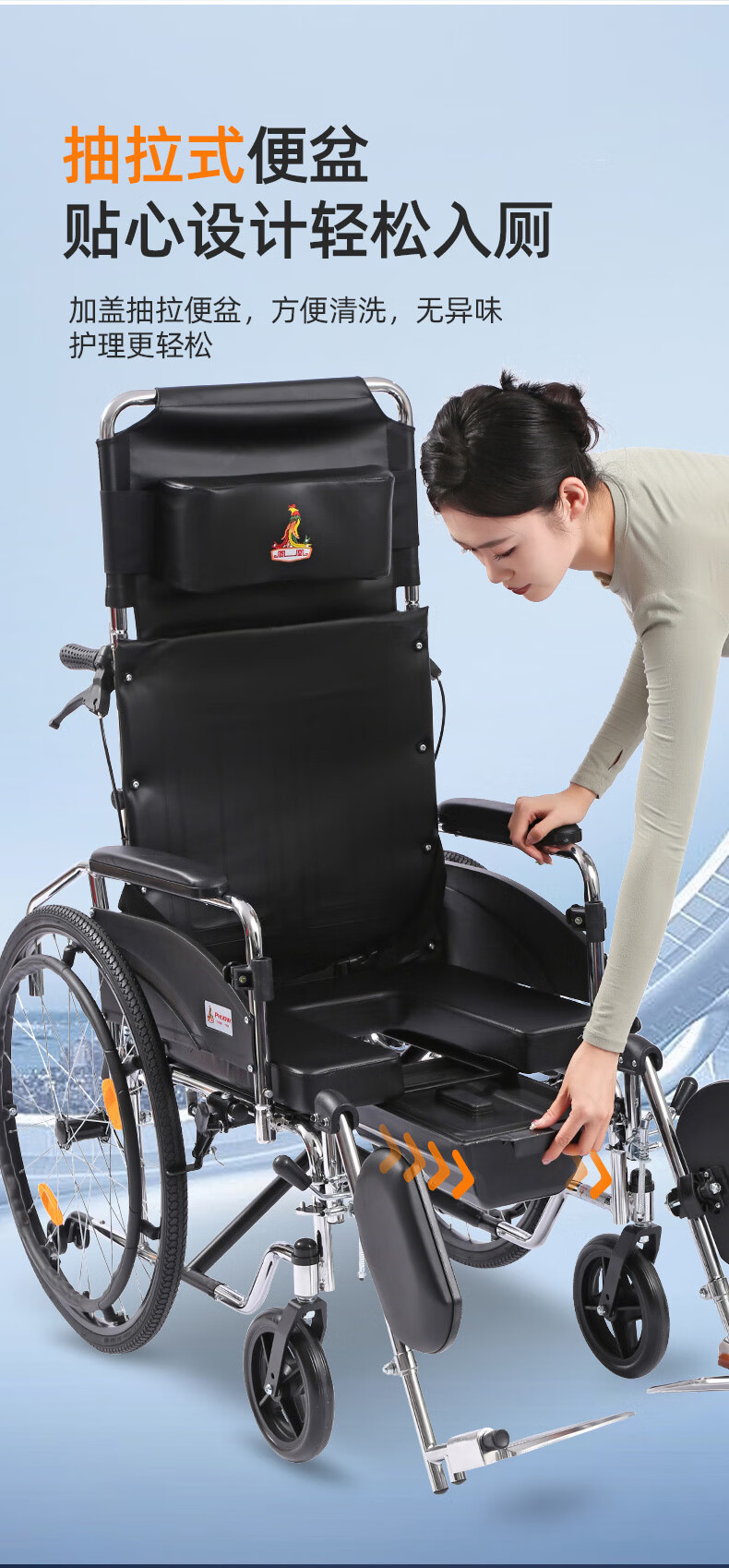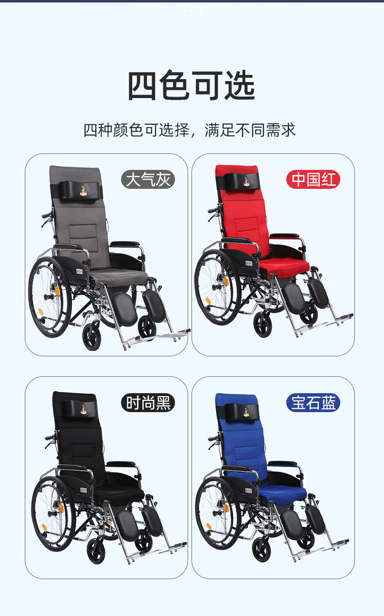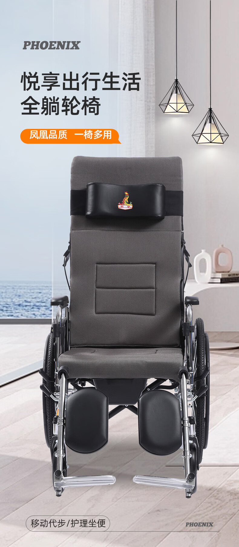 Phoenix multifunctional wheelchair, foldable and lightweight, with seat and commode, portable stroller for the elderly, fully reclined and semi-reclining, walking aid, bathing, Phoenix official +903 electroplated frame, dining table, seated, fully reclined and semi-reclining, leather fabric, solid tire + water cup holder