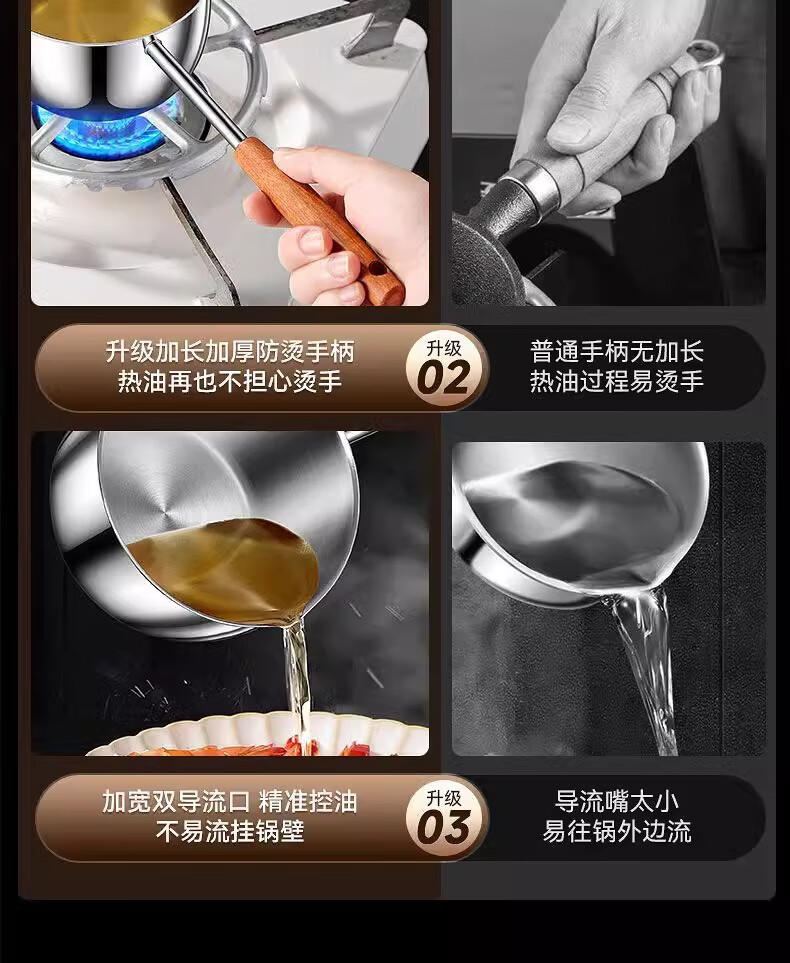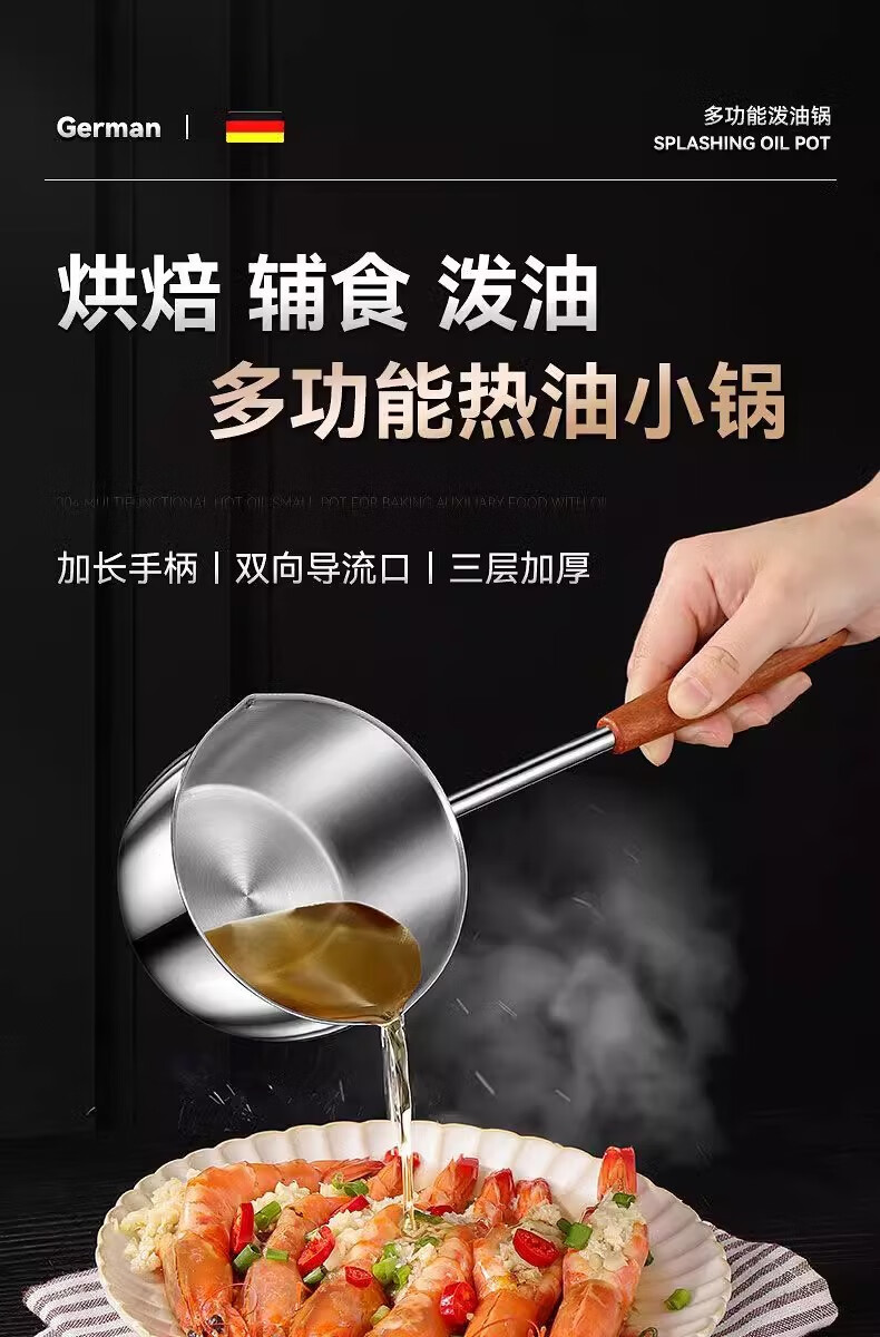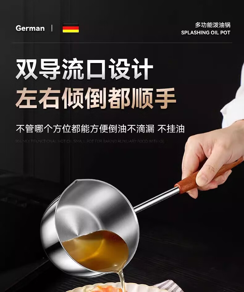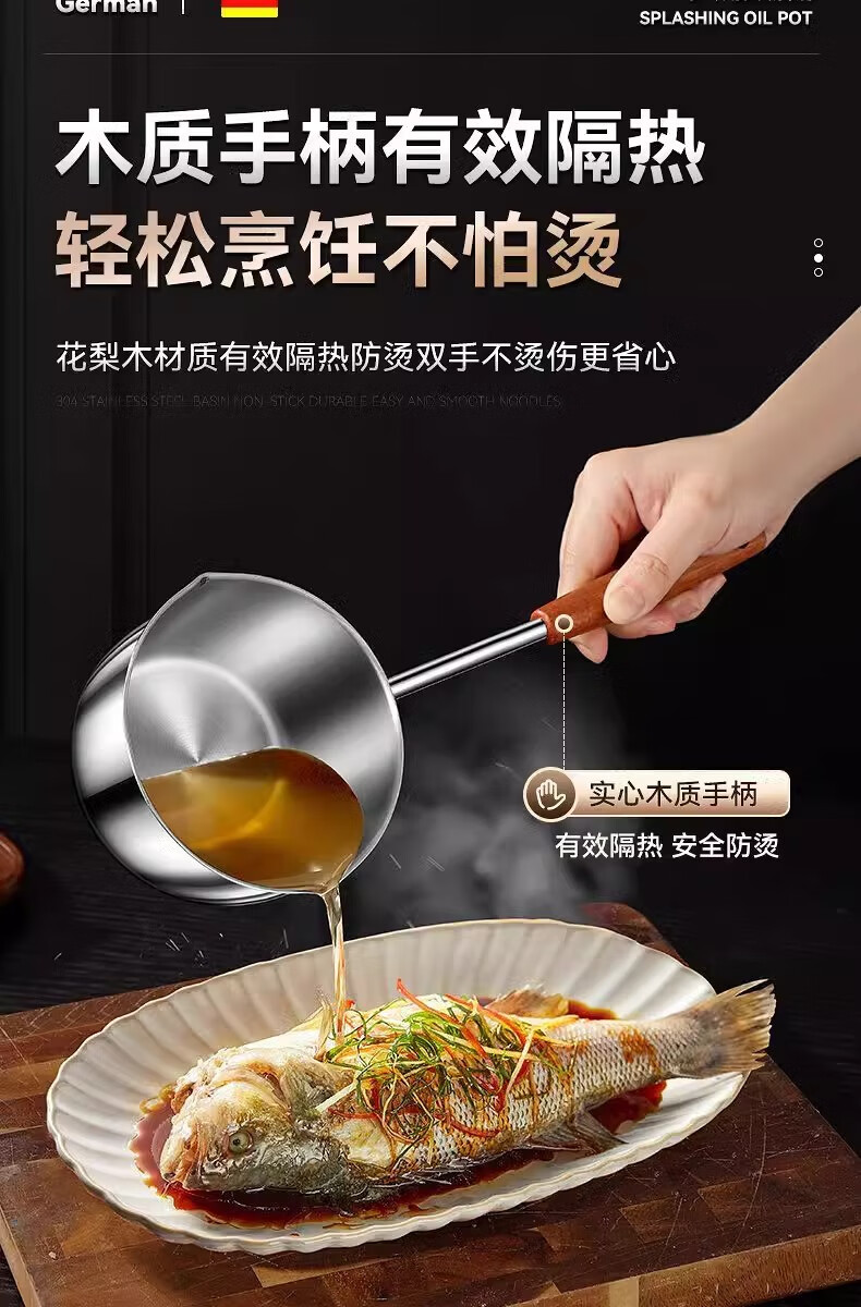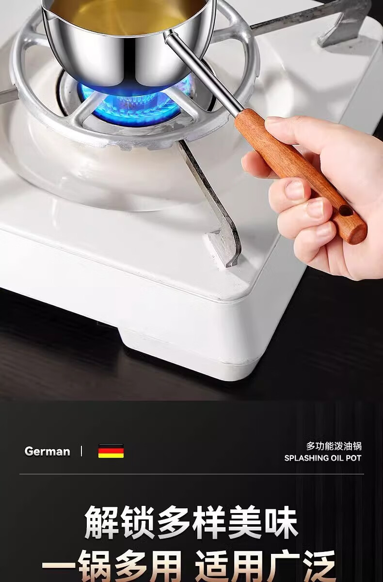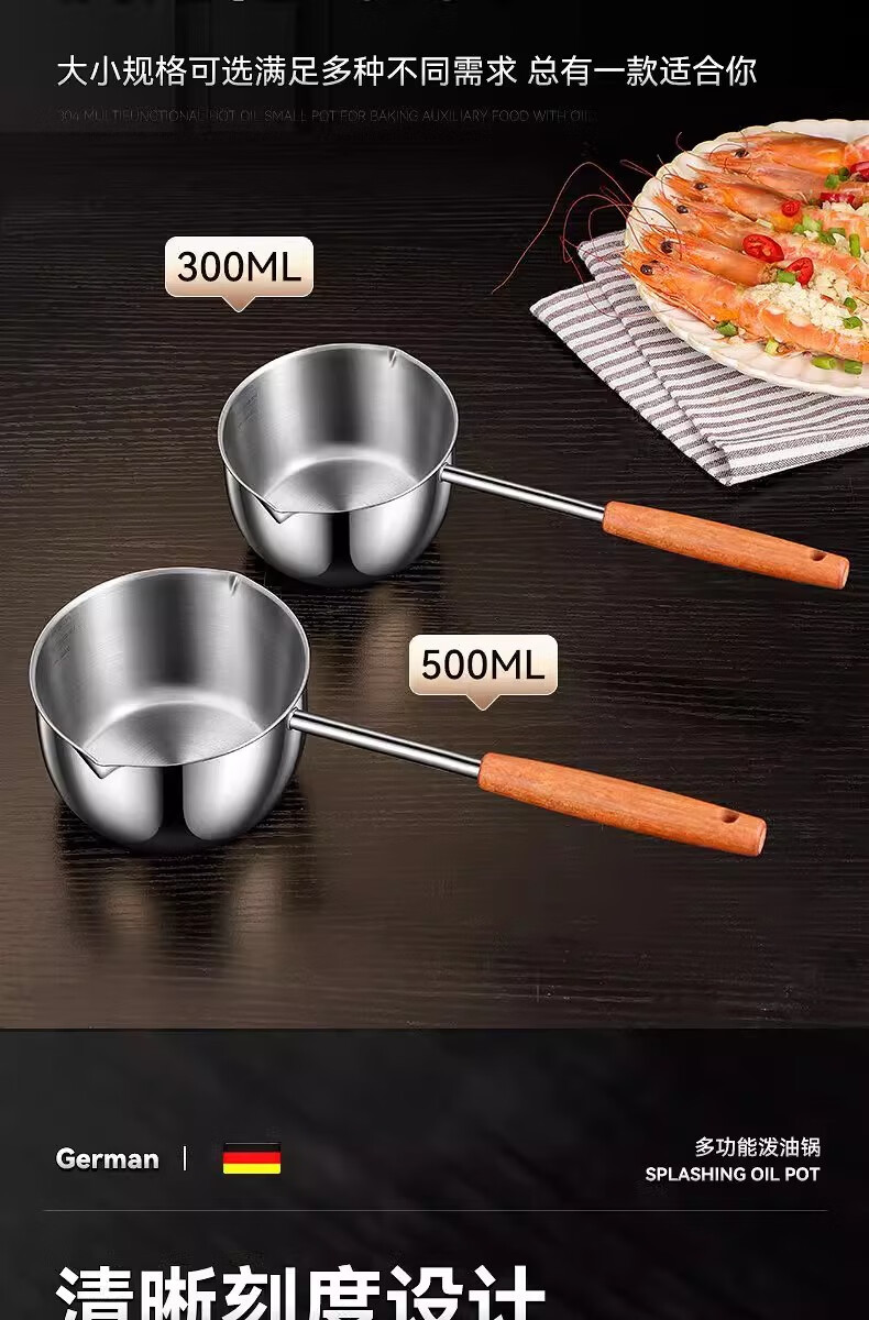 Hot oil small pot, stainless steel mini small pot, extended wooden handle, special tool for burning oil and pouring oil, uncoated, small size 300ml, extended handle, not hot