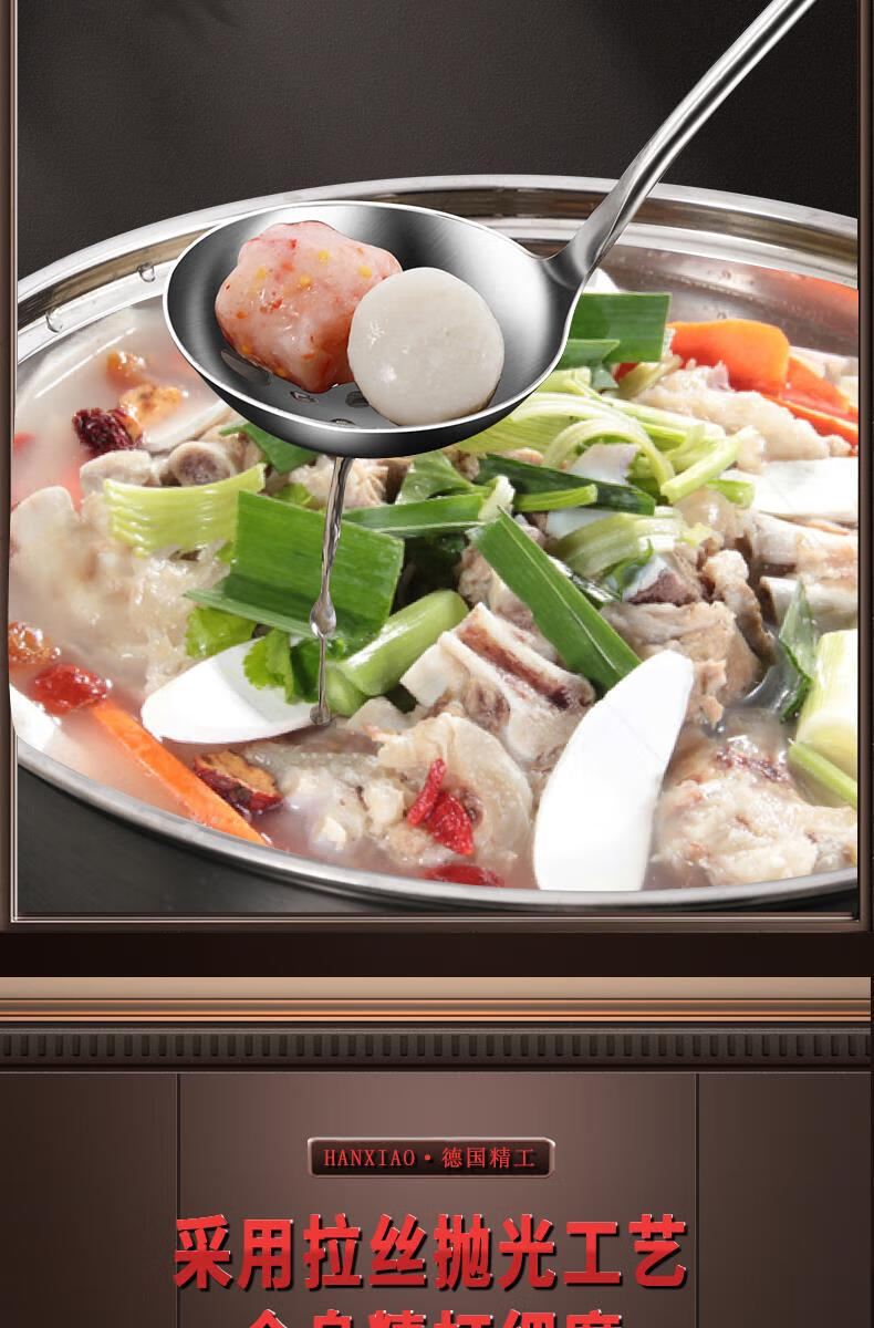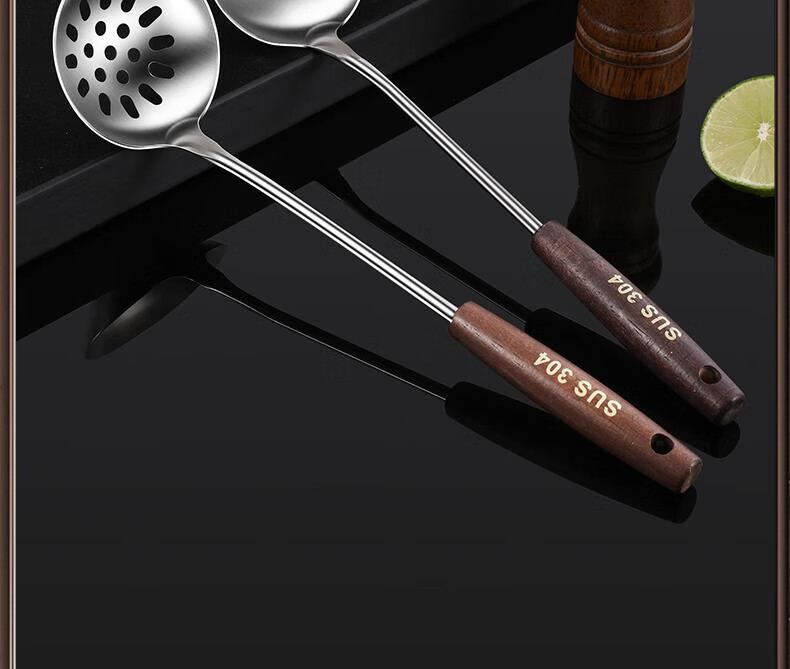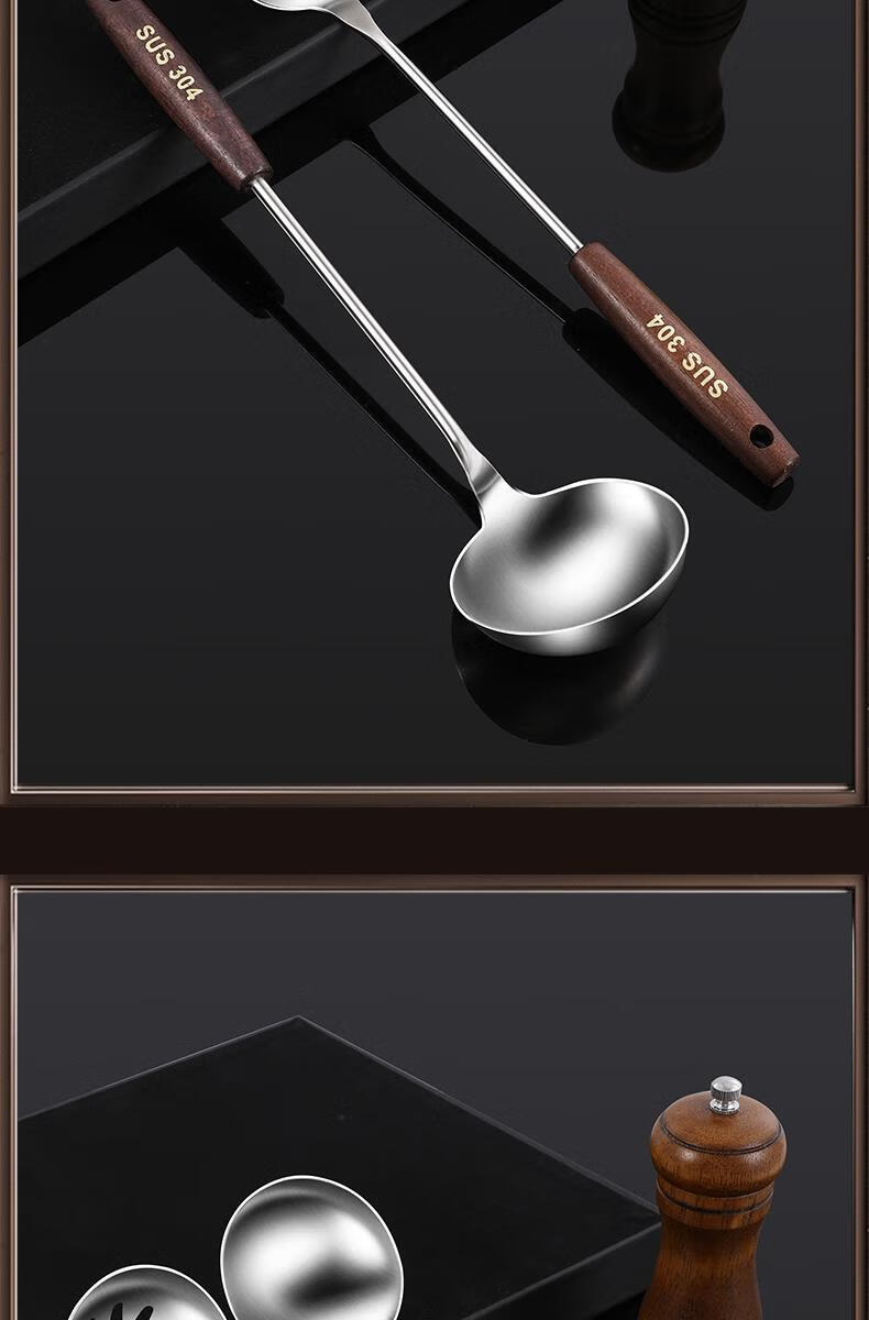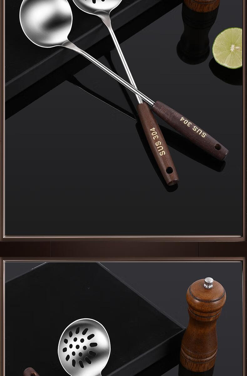 Chuangjingyixuan Food 304 Stainless Steel Hot Pot Spoon Colander Set Household Wooden Handle Small Spoon Special for Soup Commercial Large 304 Stainless Steel Hot Pot Spoon Set Solid Wood Handle