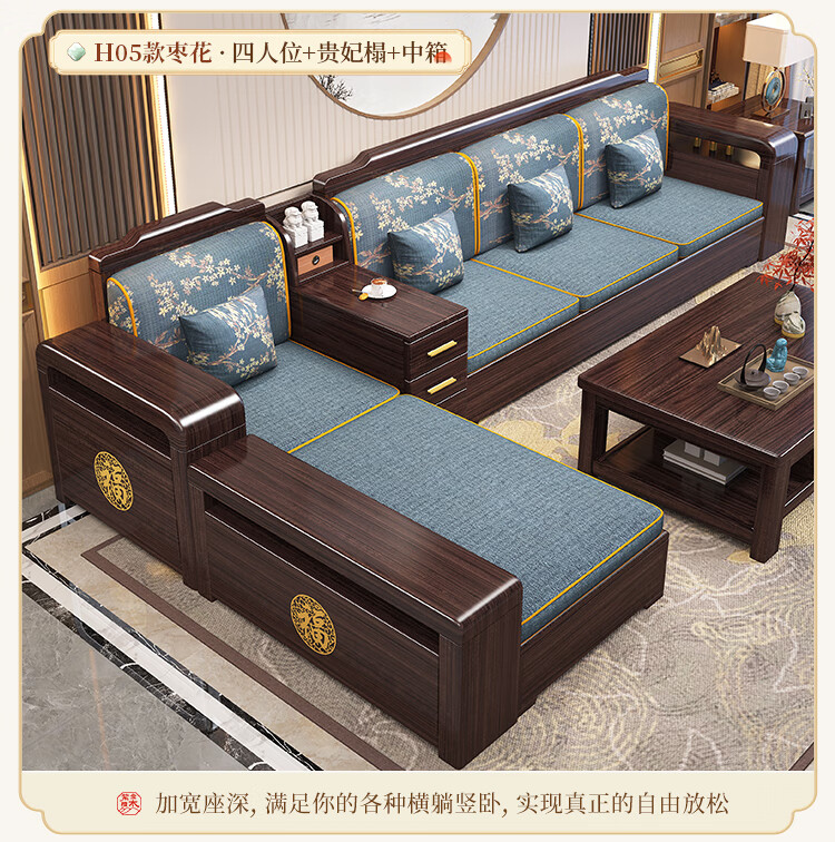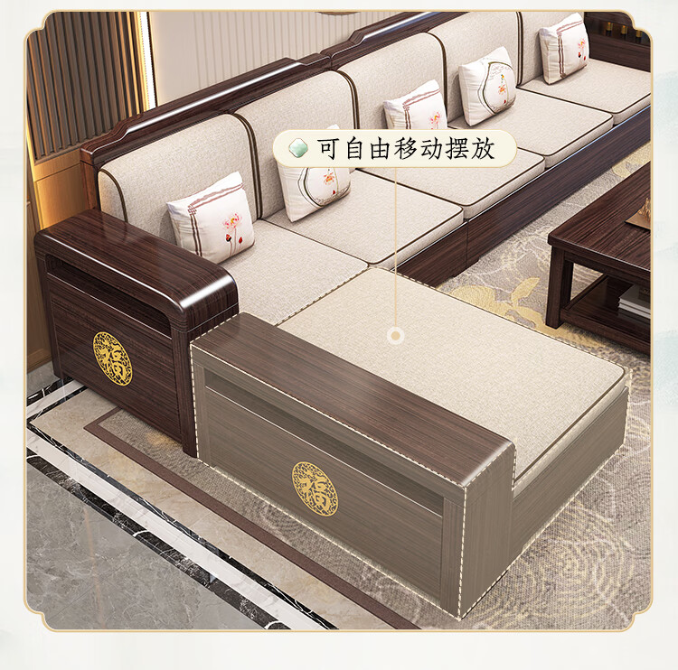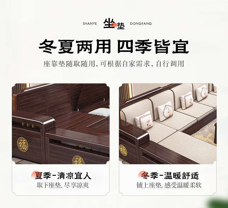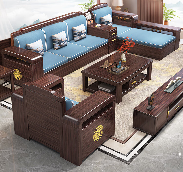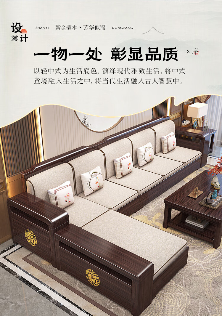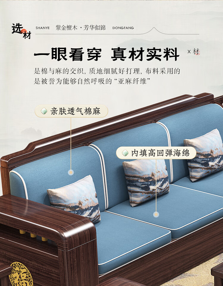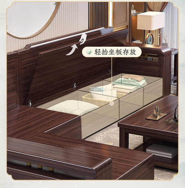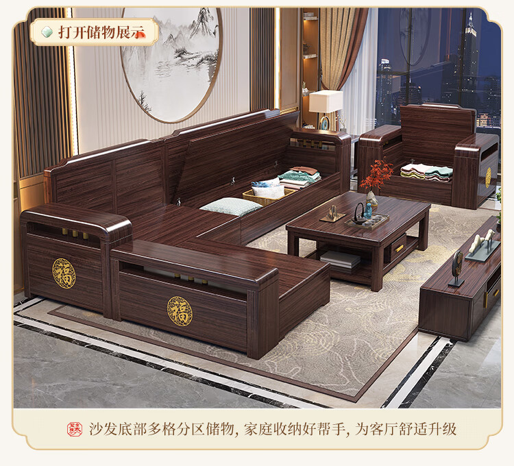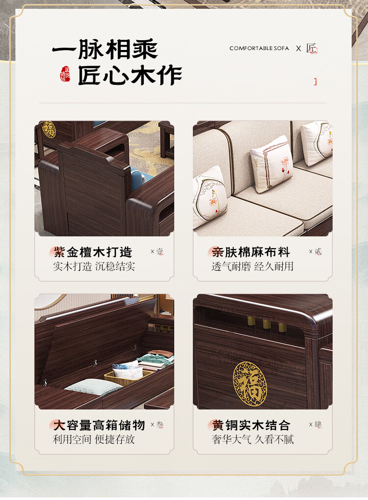 Chinese family purple sandalwood solid wood sofa combination living room winter and summer dual-purpose sofa new Chinese style storage furniture 1+1+3+coffee table