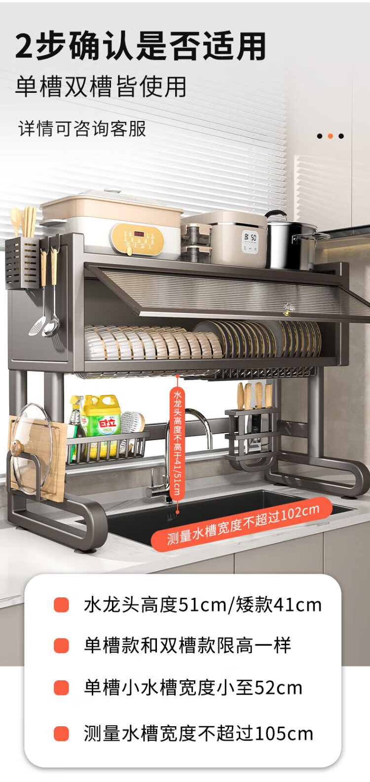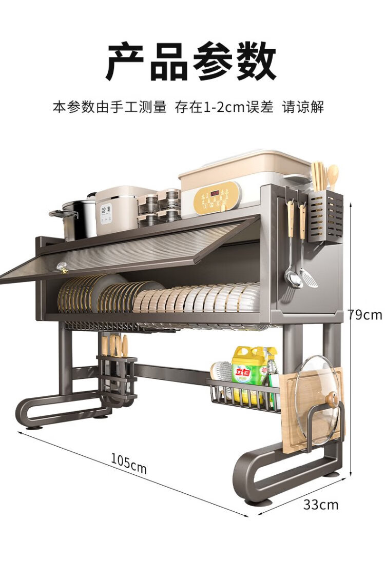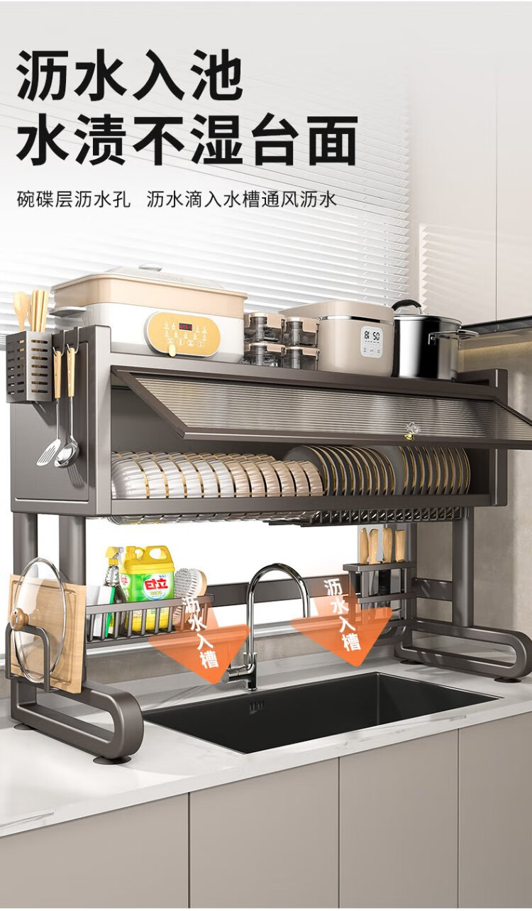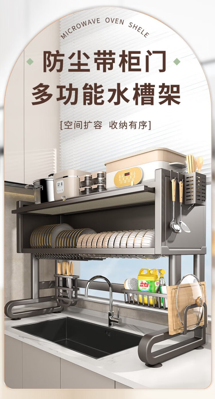 Benwang (BW) stainless steel kitchen sink rack, multi-functional drain bowl rack, household dust-proof dish storage rack with cabinet door, gun gray, 85cm long, luxurious and fully equipped