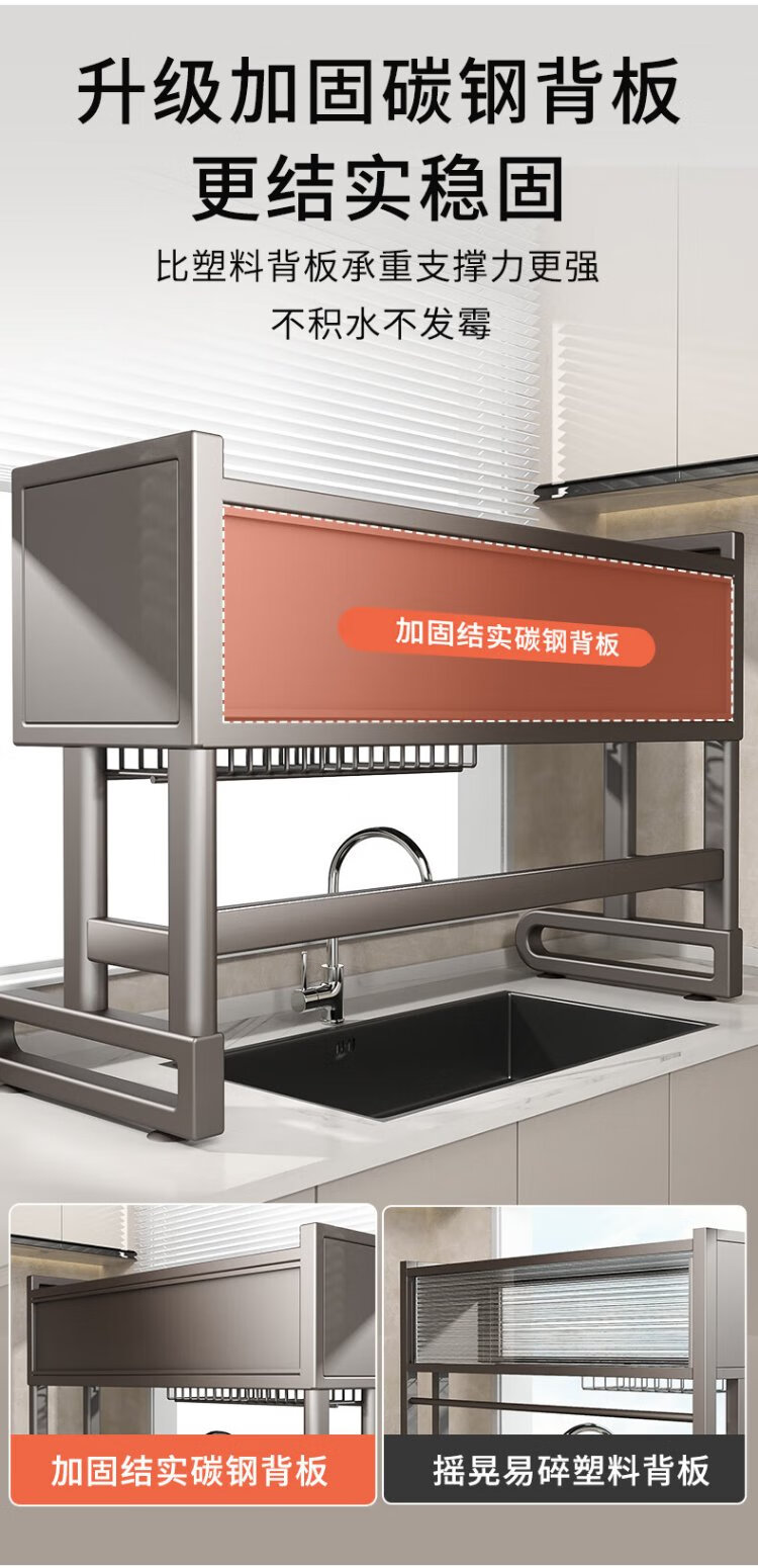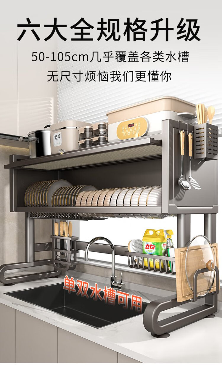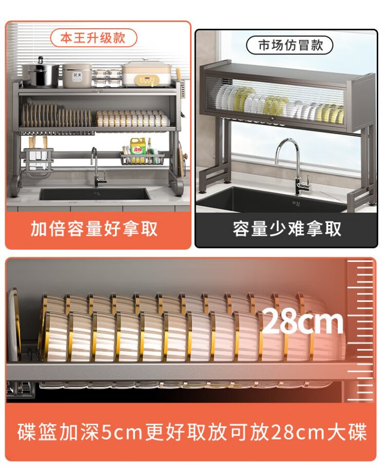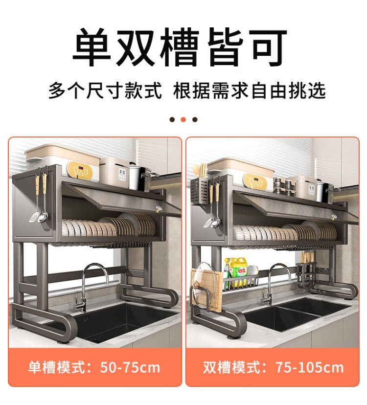 Benwang (BW) stainless steel kitchen sink rack, multi-functional drain bowl rack, household dust-proof dish storage rack with cabinet door, gun gray, 85cm long, luxurious and fully equipped