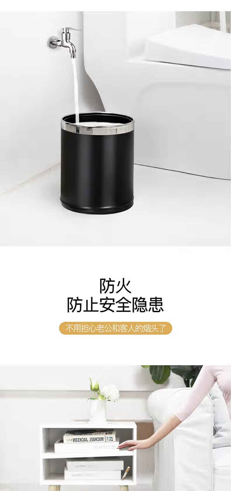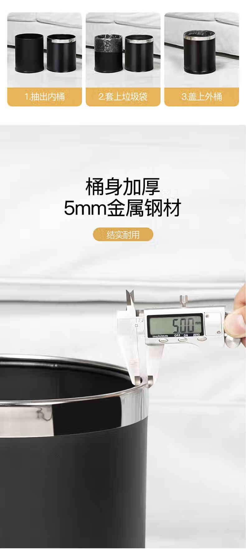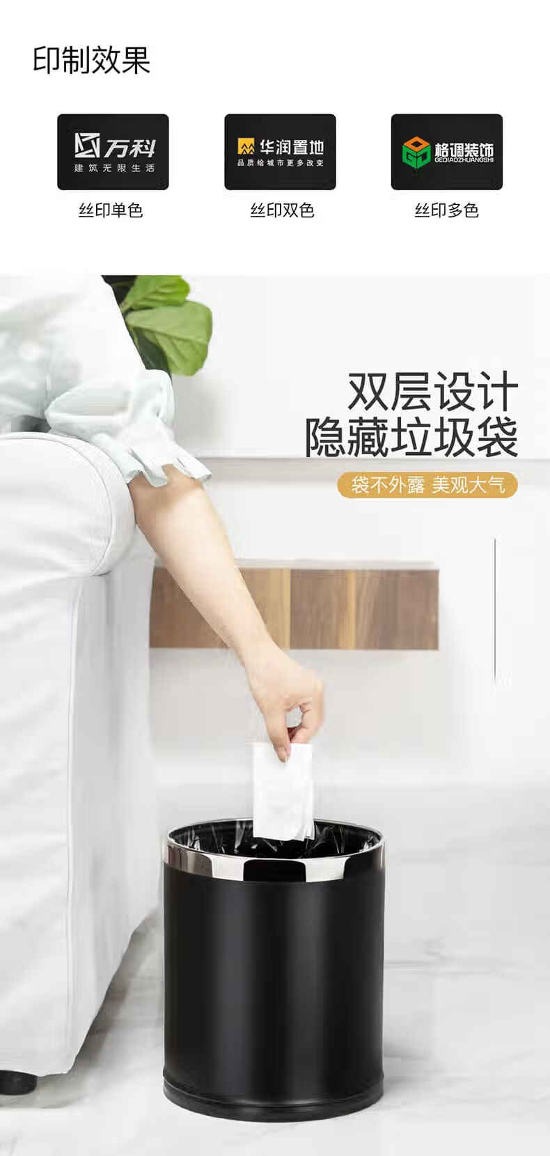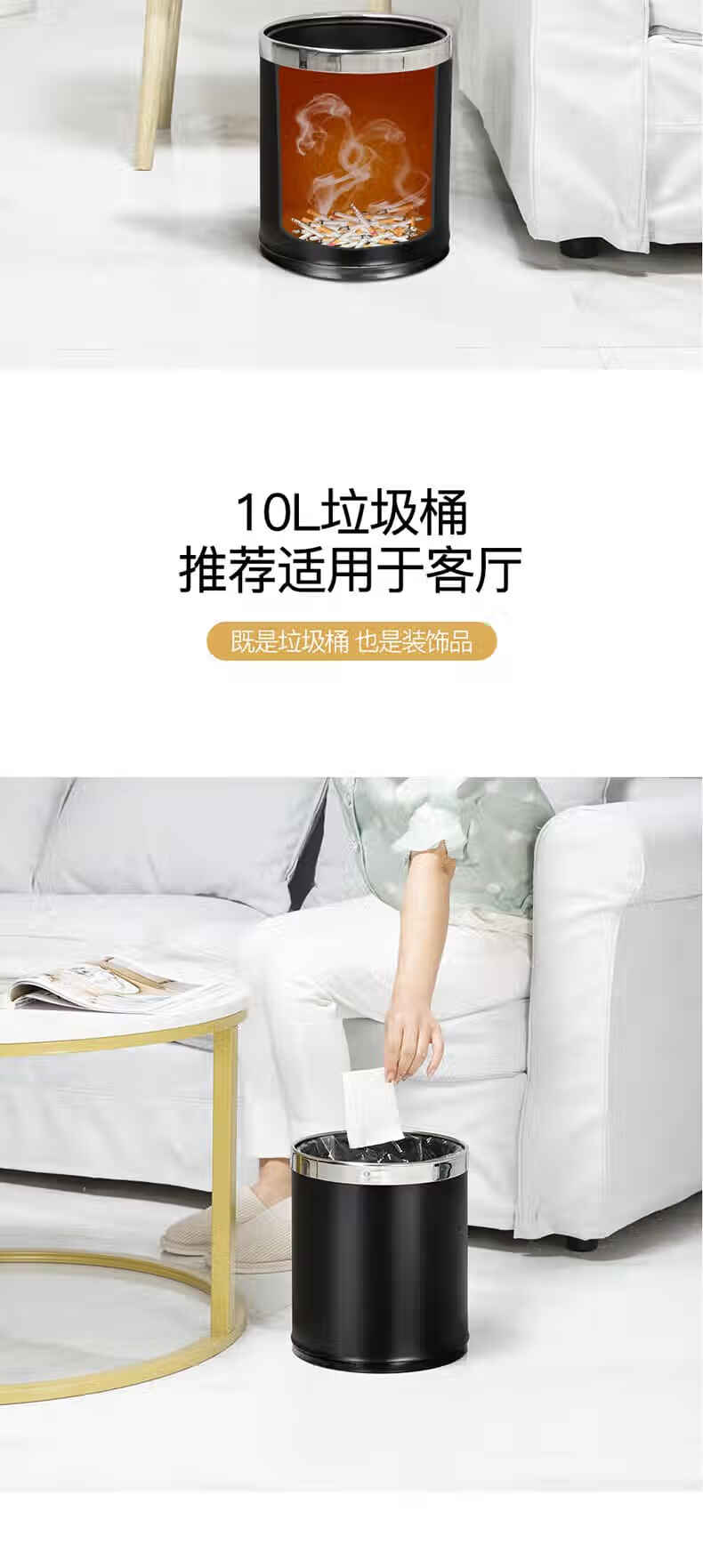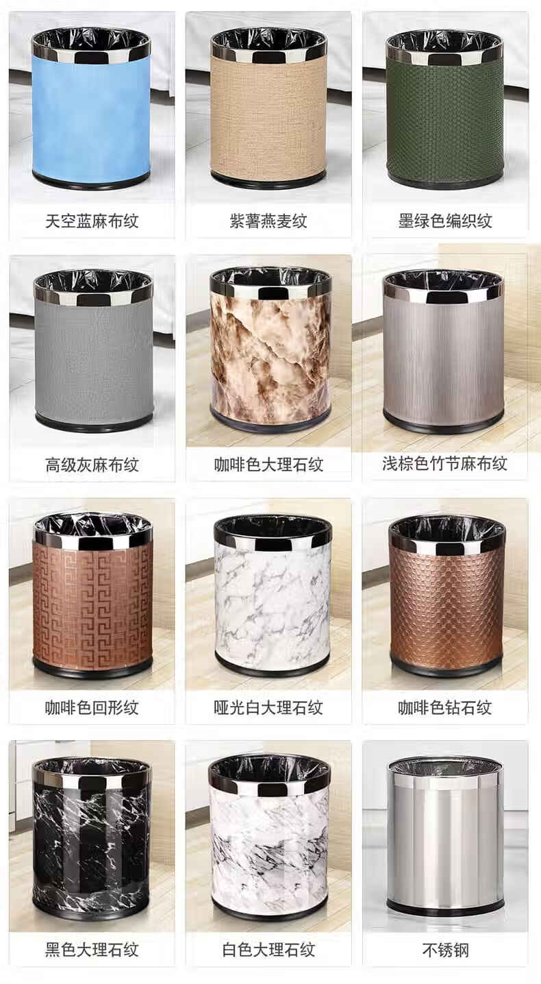Trash can light luxury style home office living room hotel hotel toilet bathroom commercial catering sanitary bucket 10L silver ring-brown paint double-layer metal