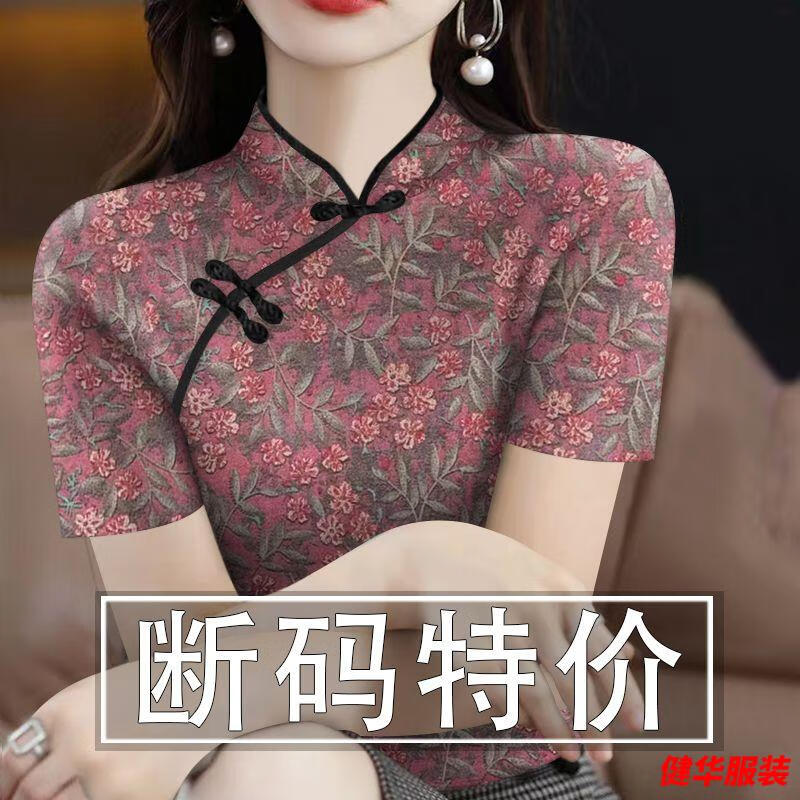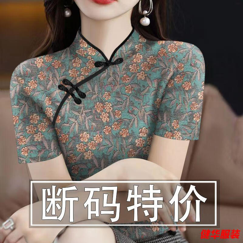 Mei Anjia has withdrawn the cut-label women's cheongsam collar short-sleeved new printed belly-covering T-shirt women's top 18801 cheongsam/collar green floral/short/sleeve top 2XL recommended weight 125-135 catties