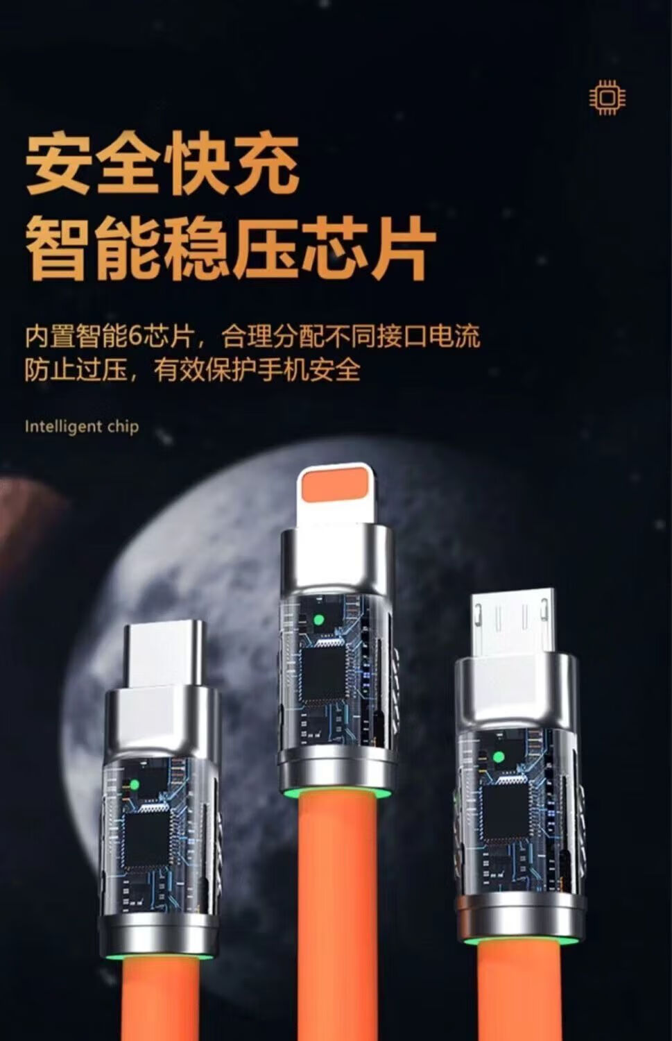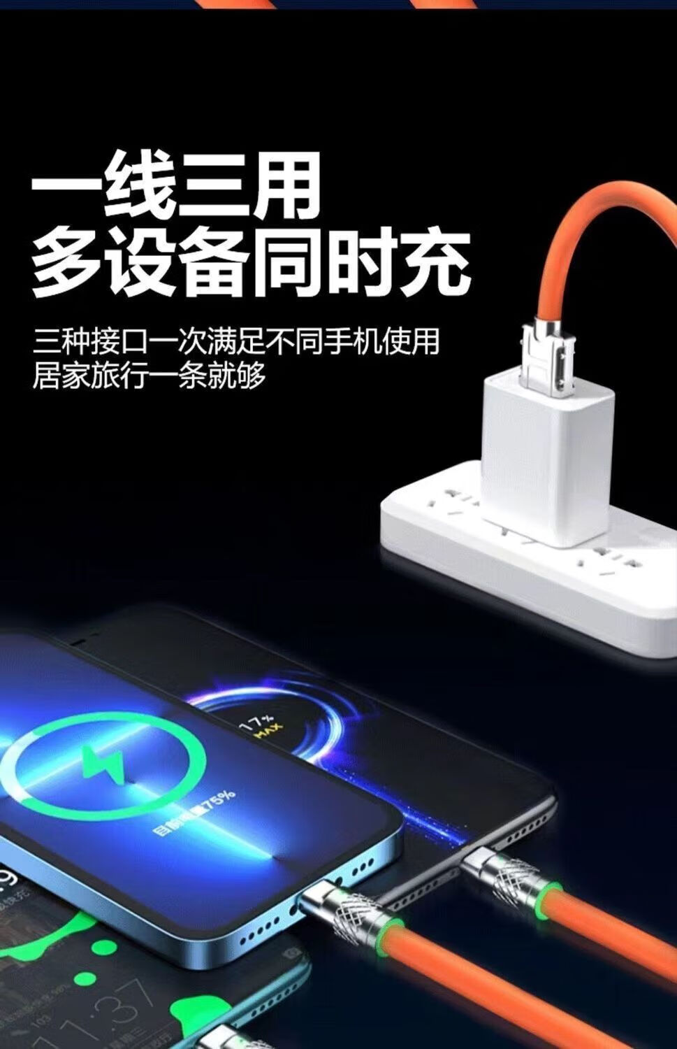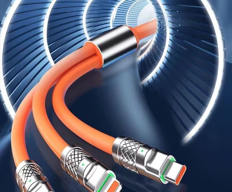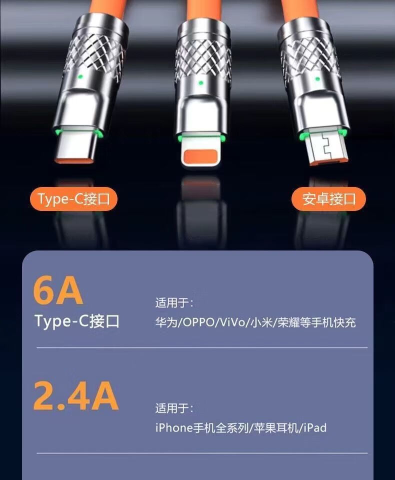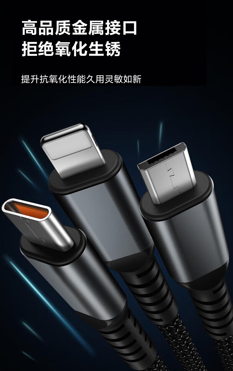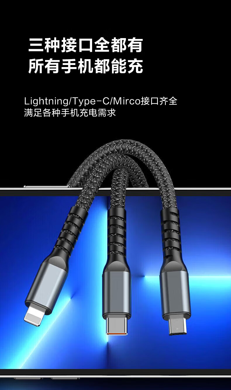 Jingdong Express charging cable three-in-one data cable one-to-three fast charging multi-head braided car suitable for Apple Type-c Android Huawei Honor vivo Xiaomi oppo braided black three-in-one 1.2m 1.2m 66W transparent super fast charging without damaging the machine