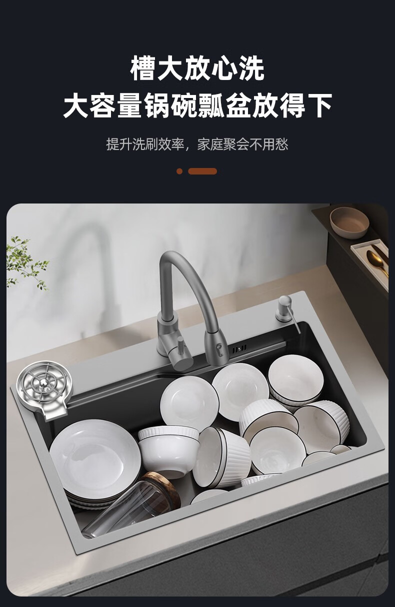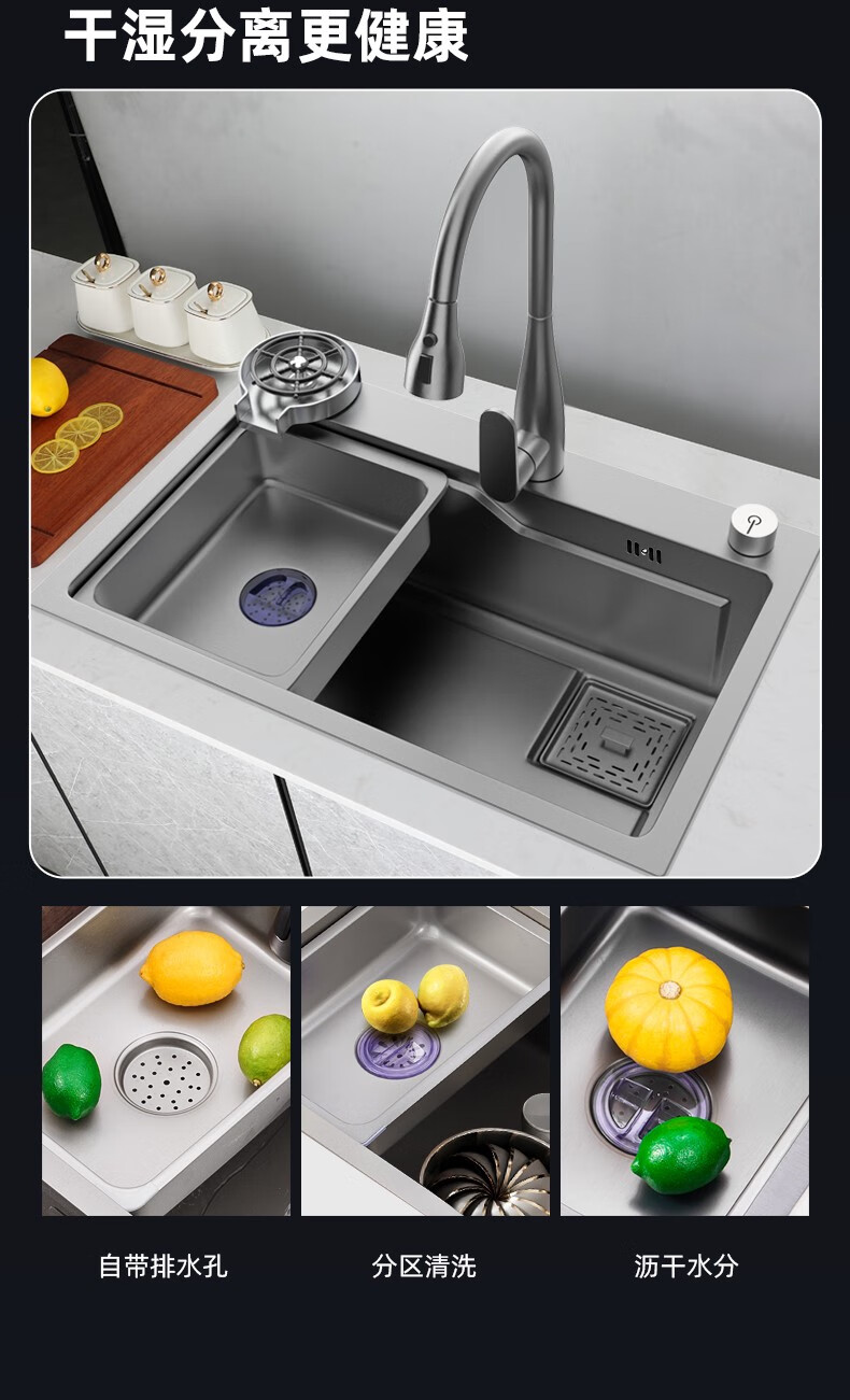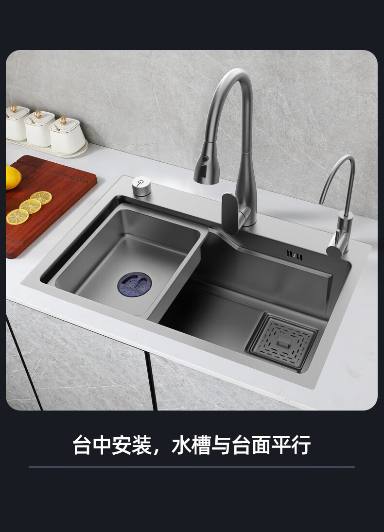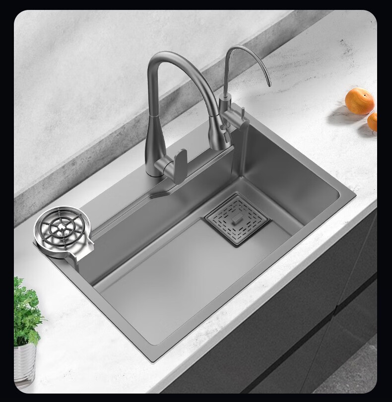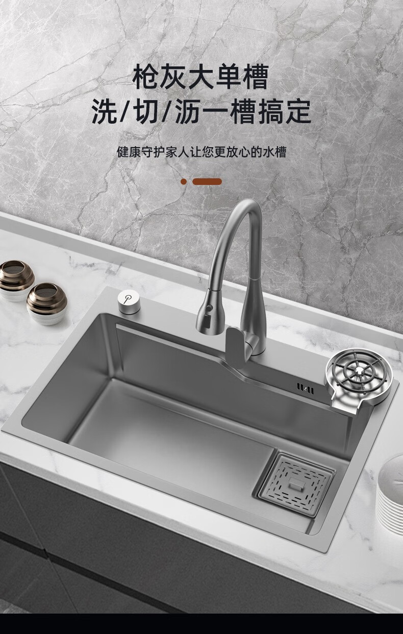 JOMOO 2025 New Gun Gray SUS304 Stainless Steel Nano Kitchen Sink Hand-Thickened Large Single Slot Waterfall for Vegetable Washing Gun Gray 60*45 Upgraded Three-speed Package + Purified Water/