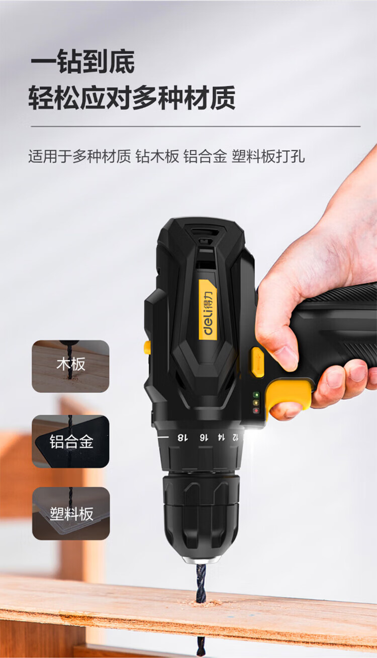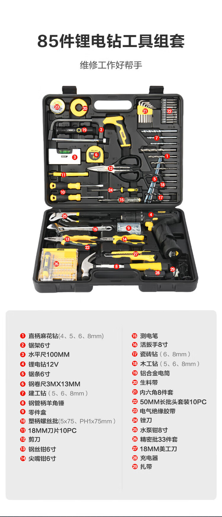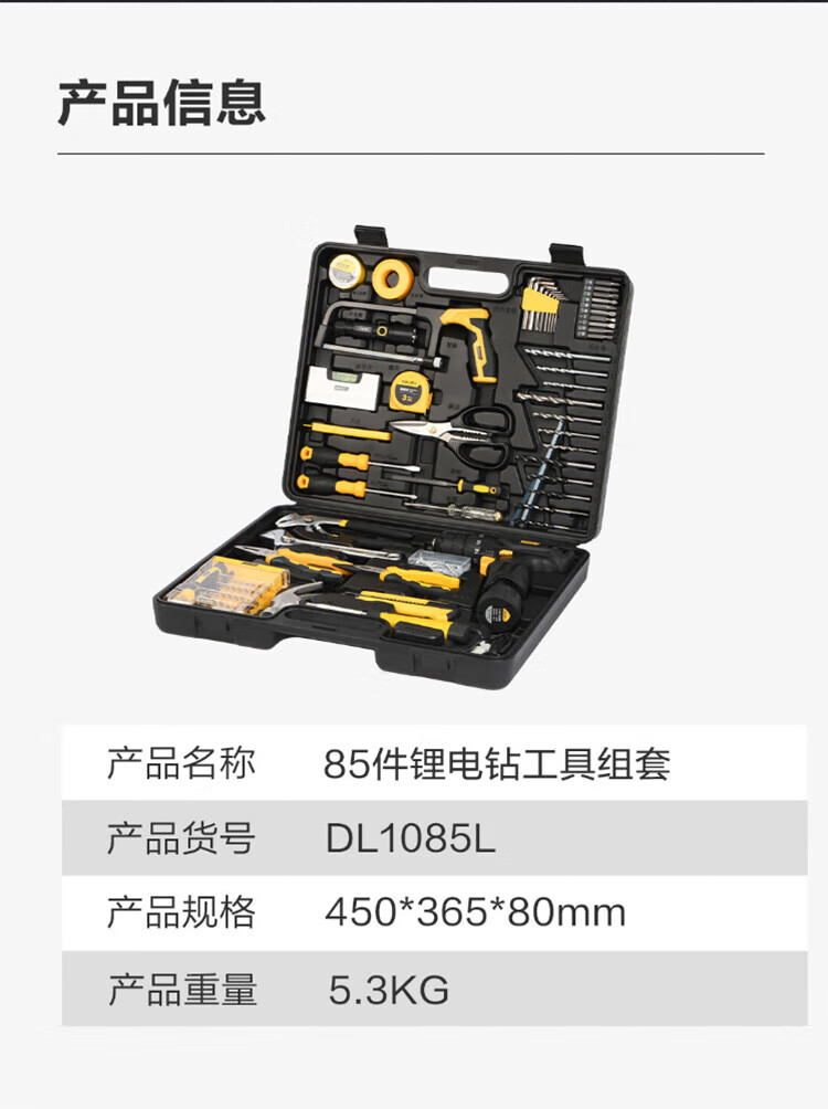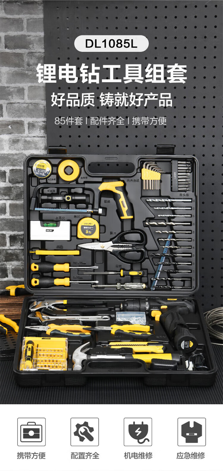 Deli electric drill hand drill rechargeable household multi-functional electric screwdriver driver hardware tool box set 85-piece household lithium electric drill set DL1085L
