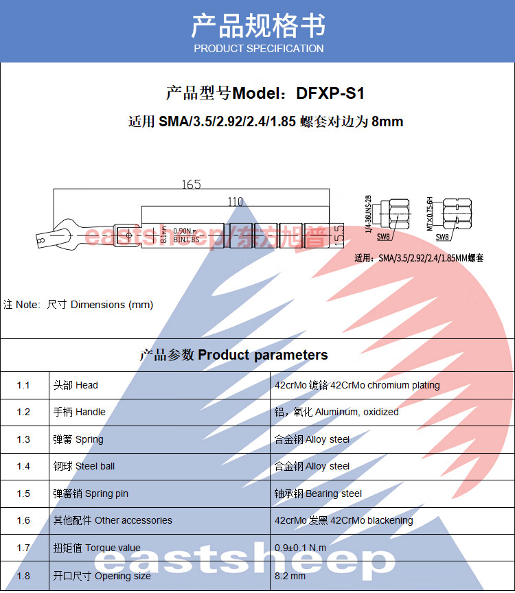 Dongfang Xupu RF Connector SMA Torque Wrench SMA/3.5/2.92 Torque Wrench 8MM 0.9N.m DFXP-S1