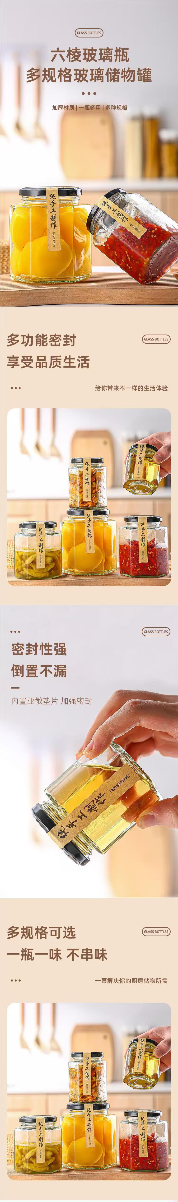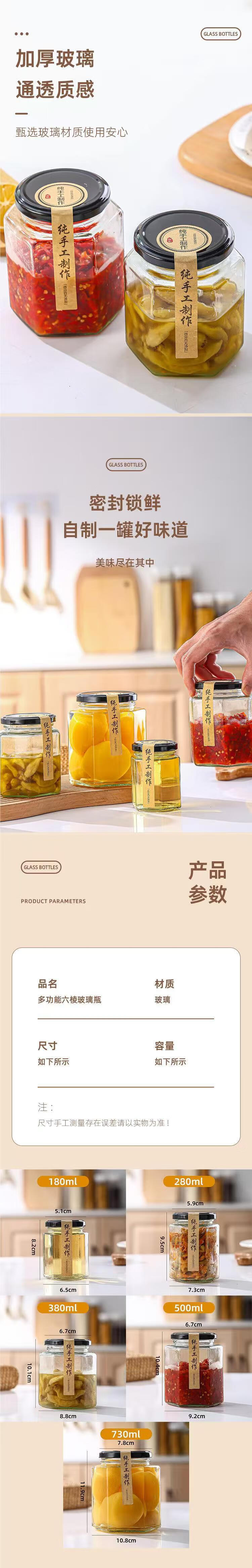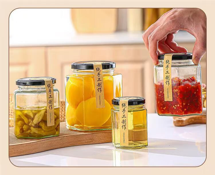 Food grade lemon paste glass bottle honey bottle with lid transparent chili sauce sealed jar empty bottle multiple specifications 500ML hexagonal (pack of 12)