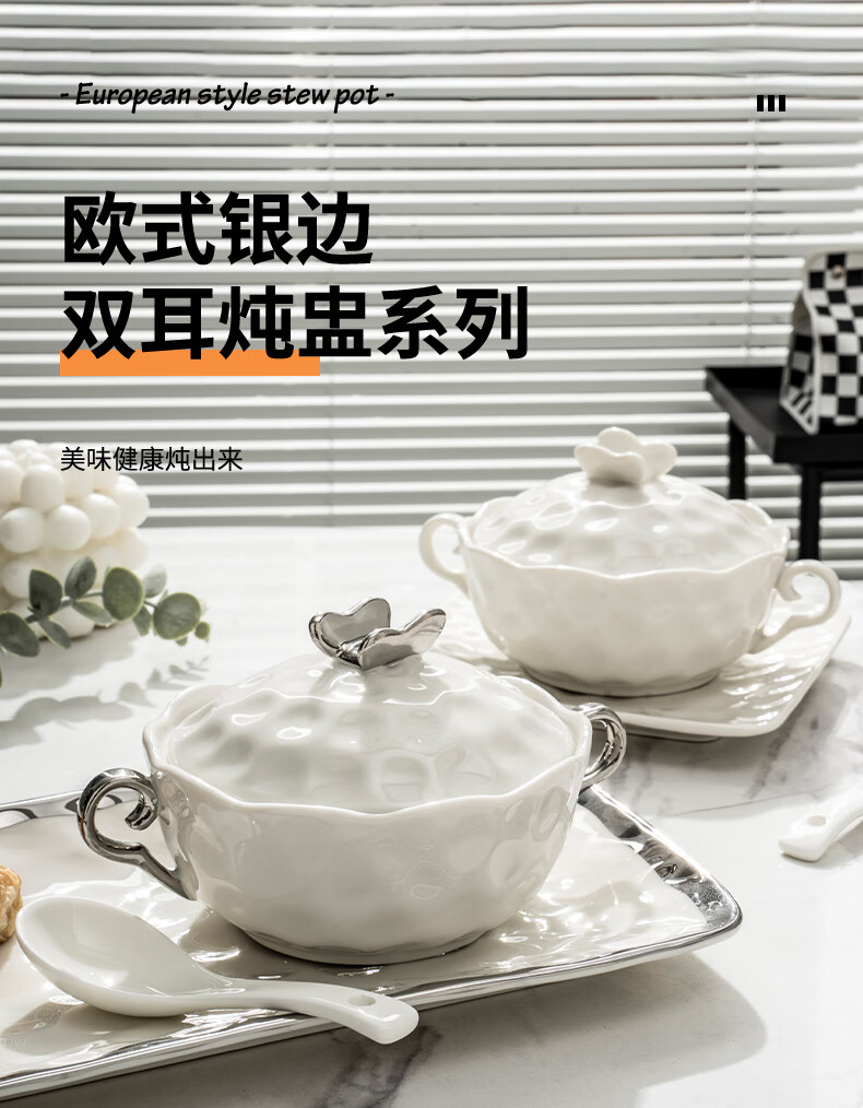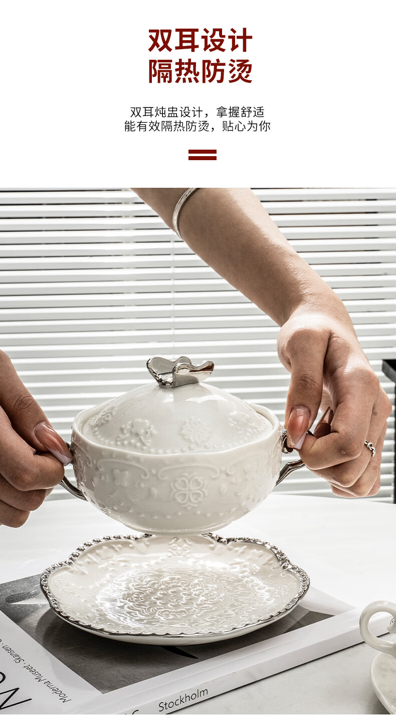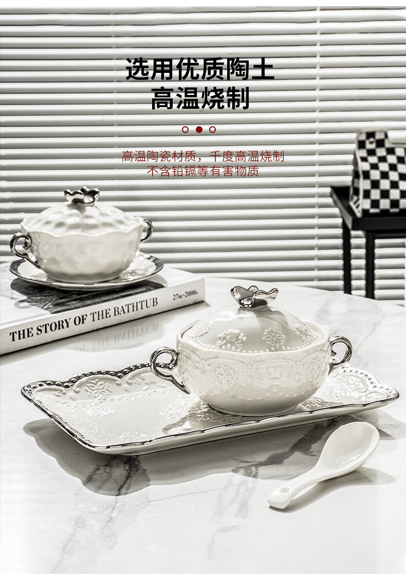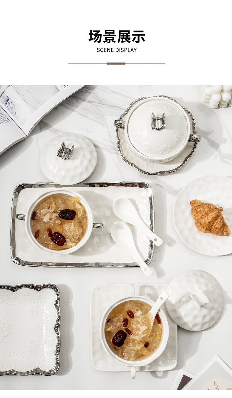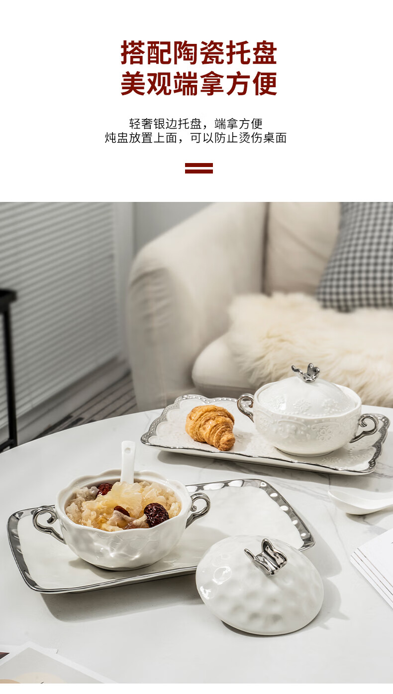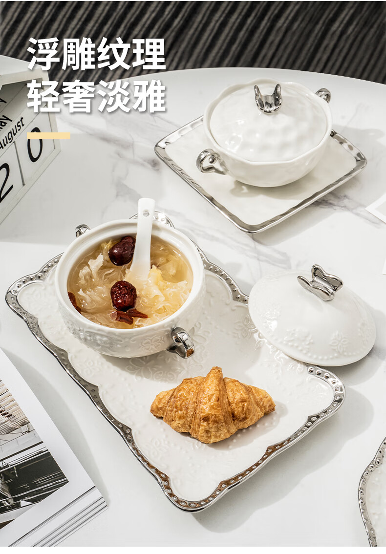 Pupan ceramic dessert bowl Internet celebrity bird's nest bowl sugar water bowl stew pot soup cup baking bowl commercial creative beauty salon double ears with lid silver edge embossed bowl + silver edge rectangular plate with ceramic spoon