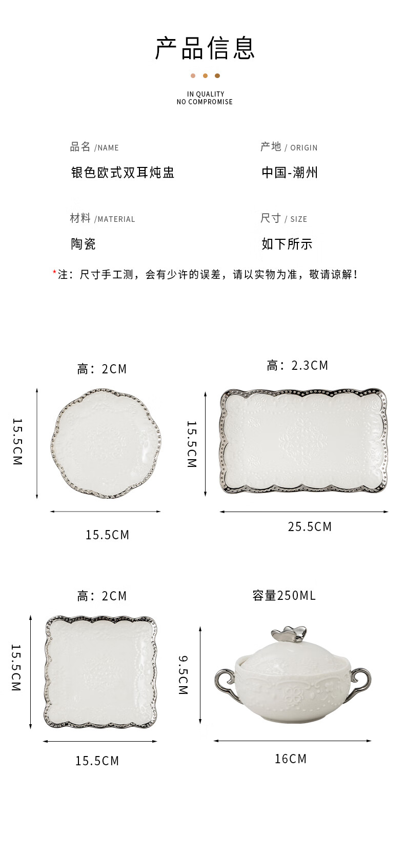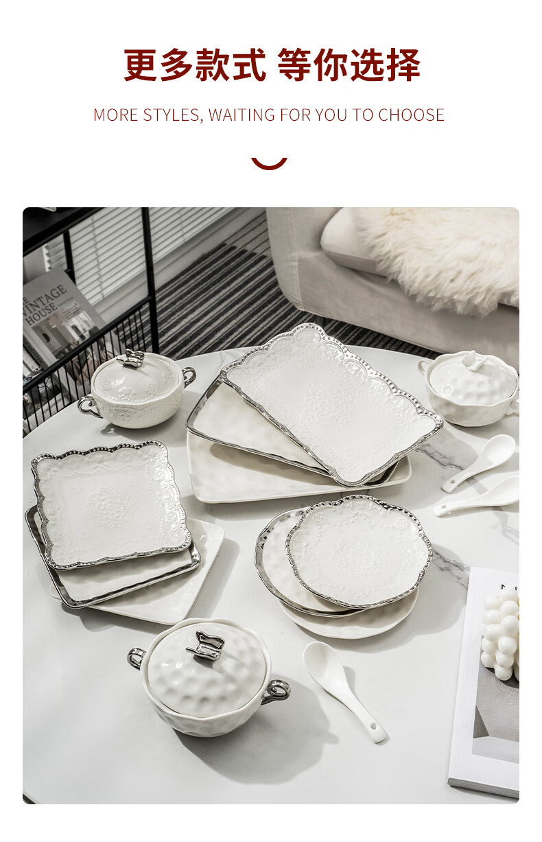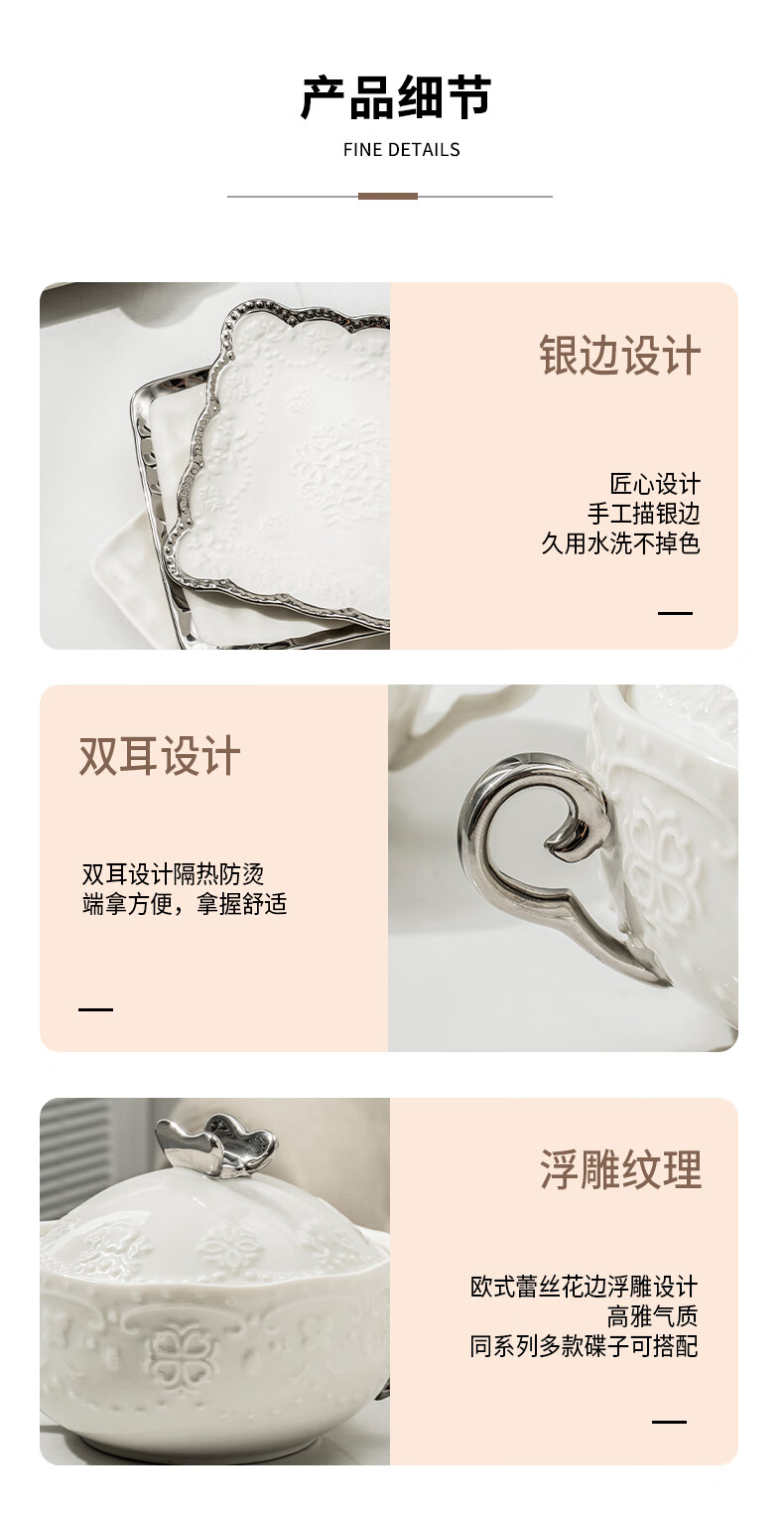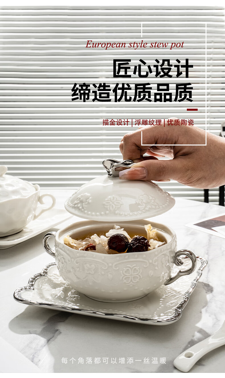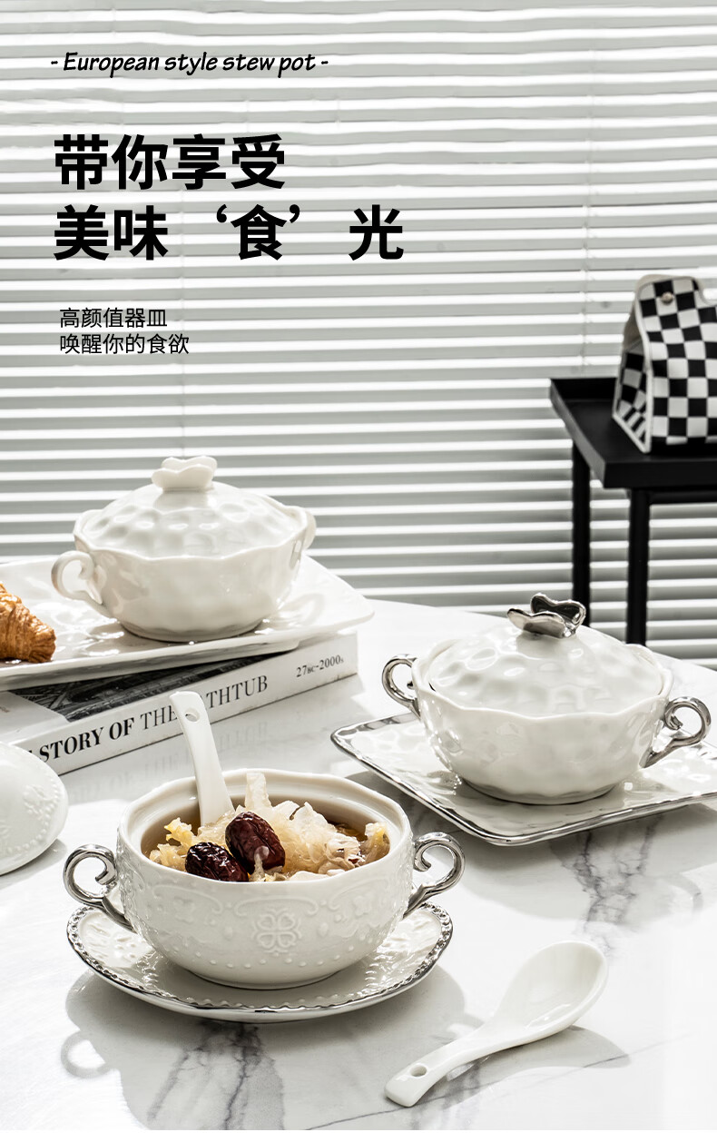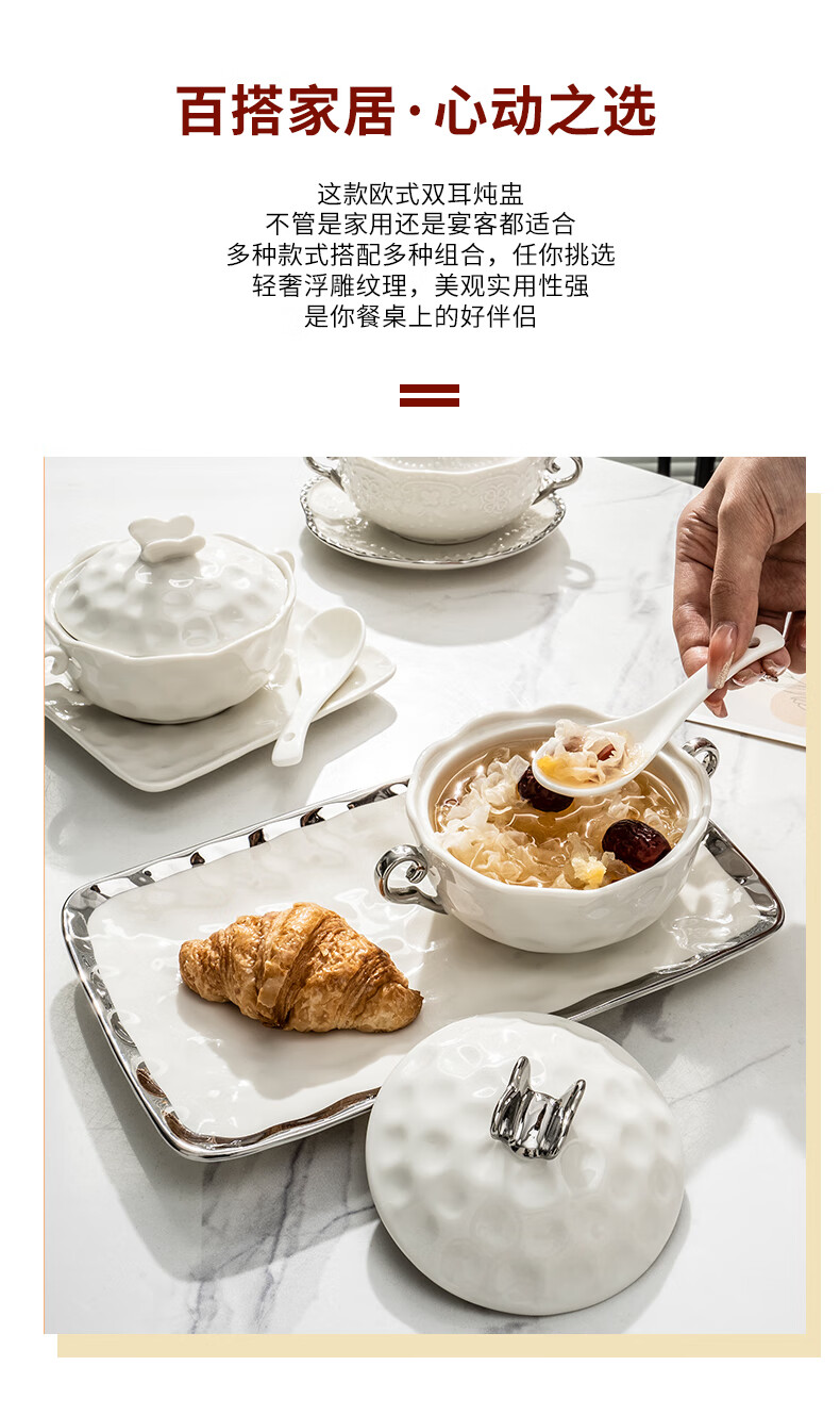 Pupan ceramic dessert bowl Internet celebrity bird's nest bowl sugar water bowl stew pot soup cup baking bowl commercial creative beauty salon double ears with lid silver edge embossed bowl + silver edge rectangular plate with ceramic spoon