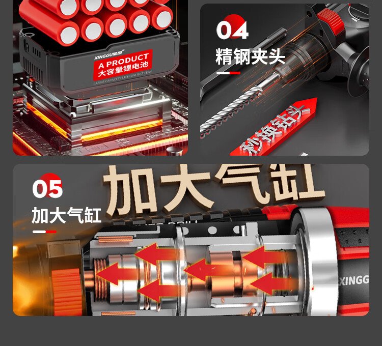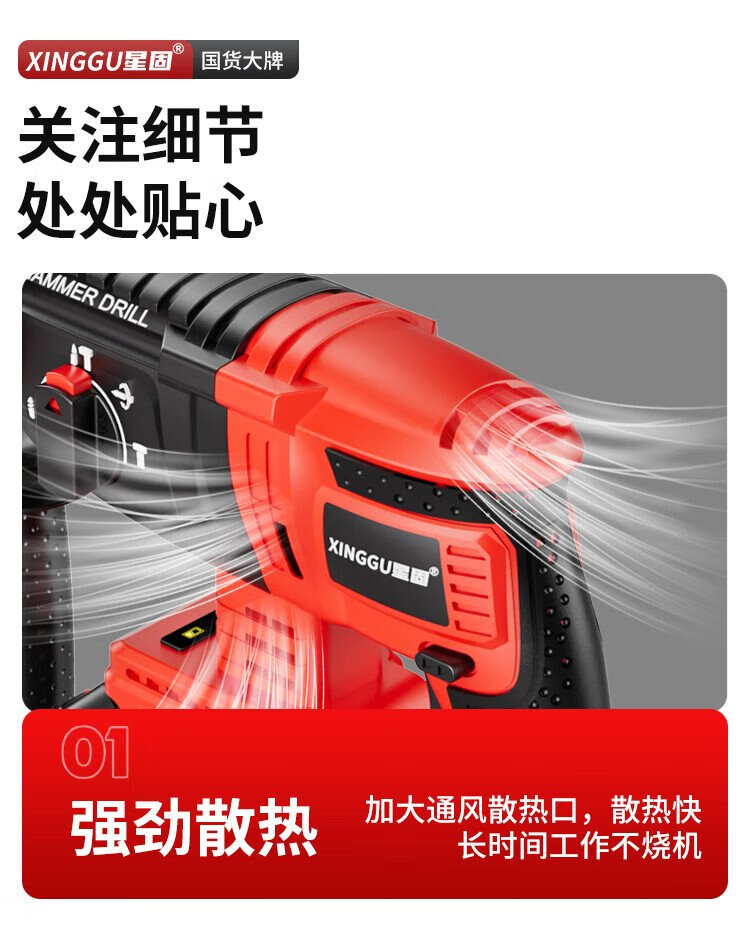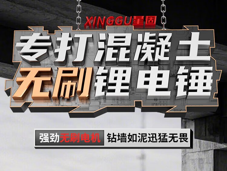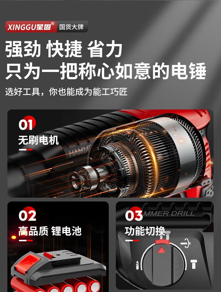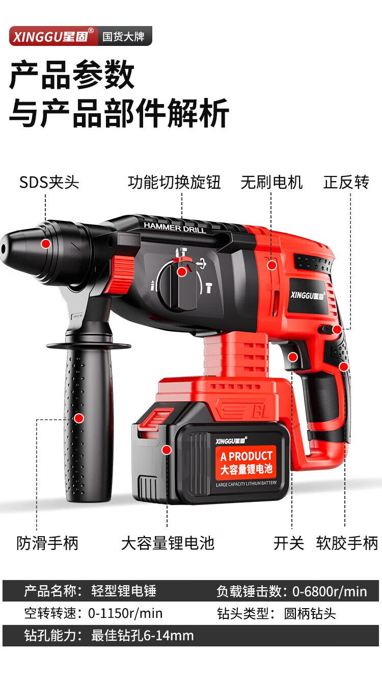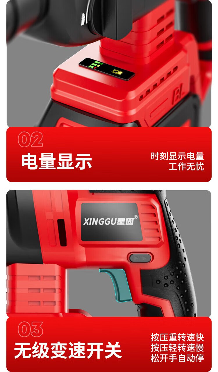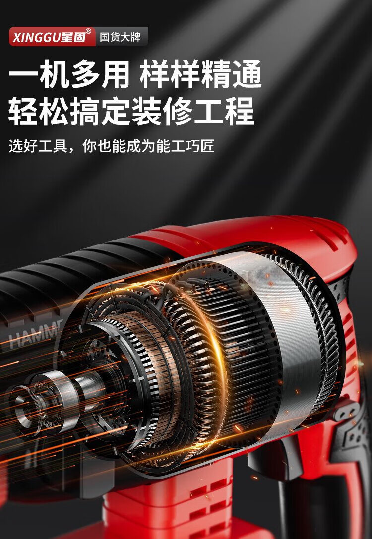 Xinggu electric hammer impact drill brushless rechargeable lithium battery high-power household concrete three-purpose multi-functional demolition machine 15-section dual-electric | brushless motor | long-lasting battery life
