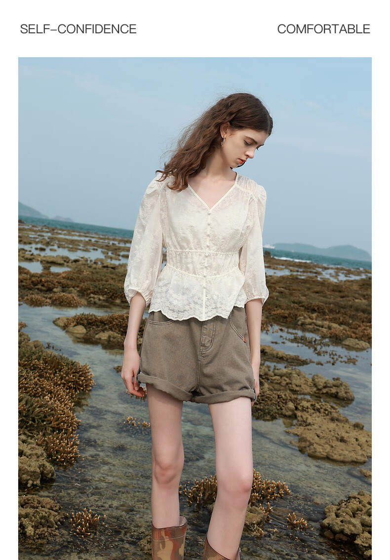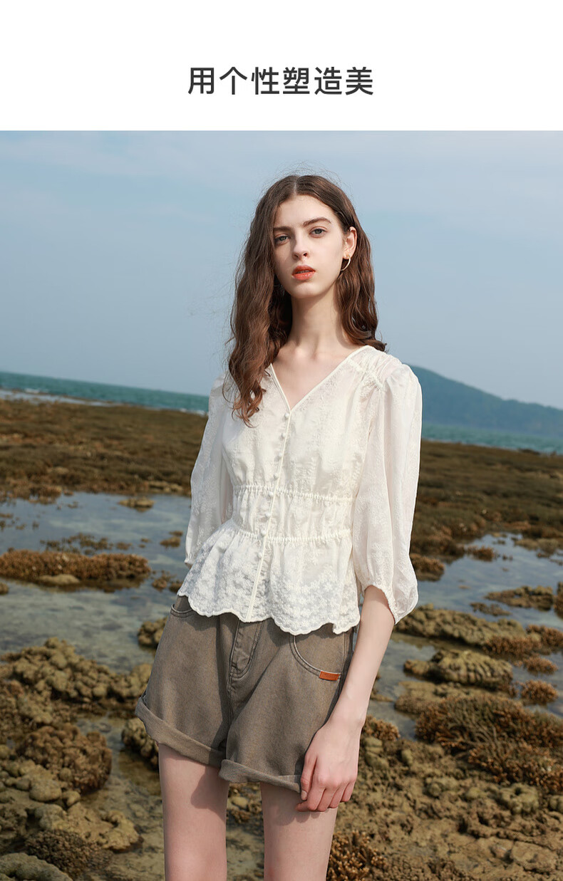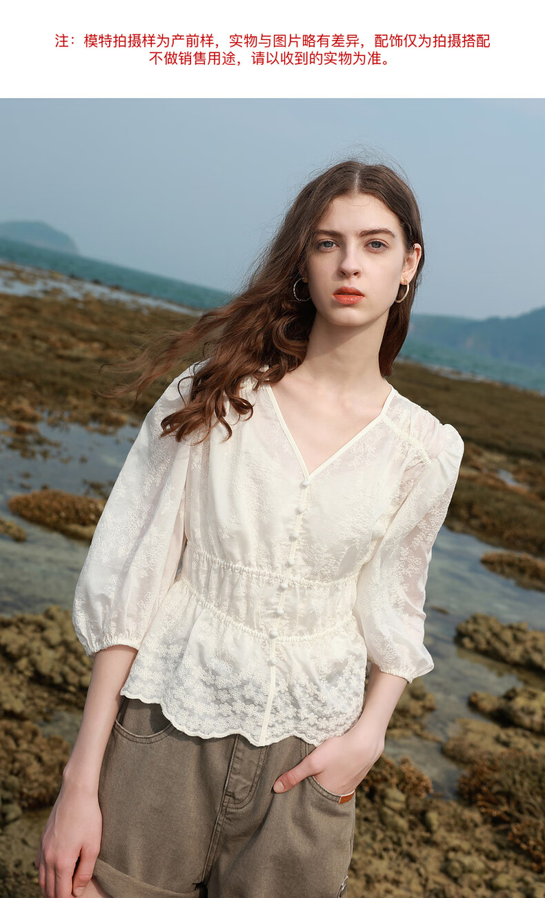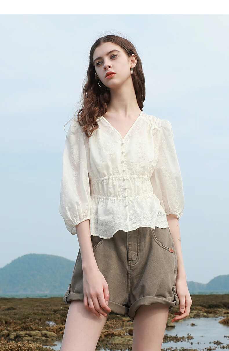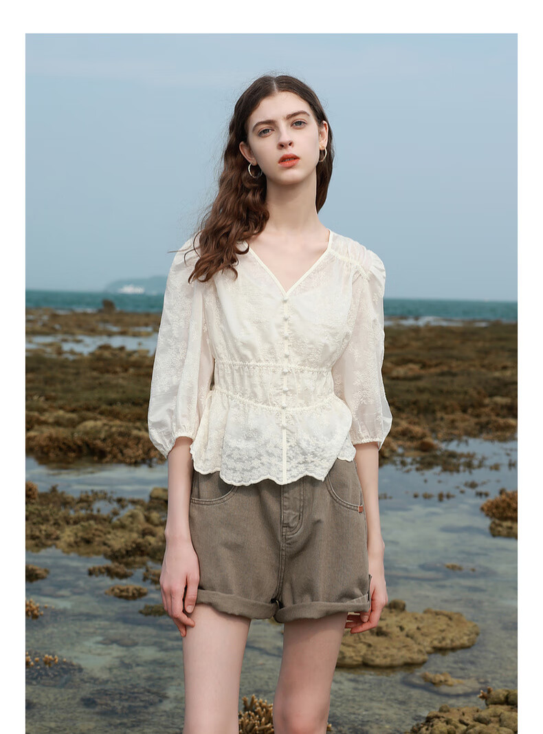 Tricolor 2025 Summer New Three Quarter Sleeve V Neck Lyocell Embroidered Shirt Waist Shirt Top Women Off White L 165/88A