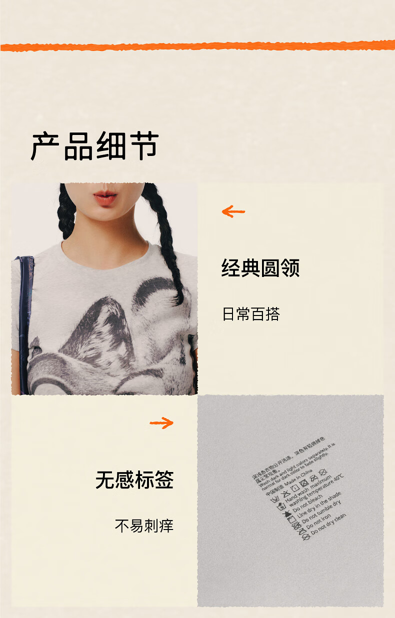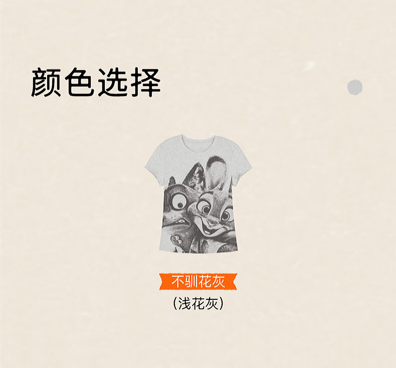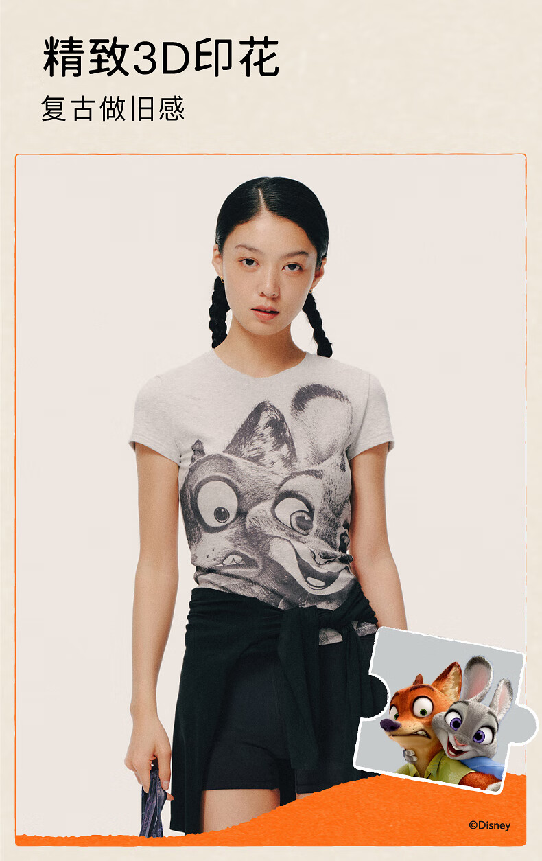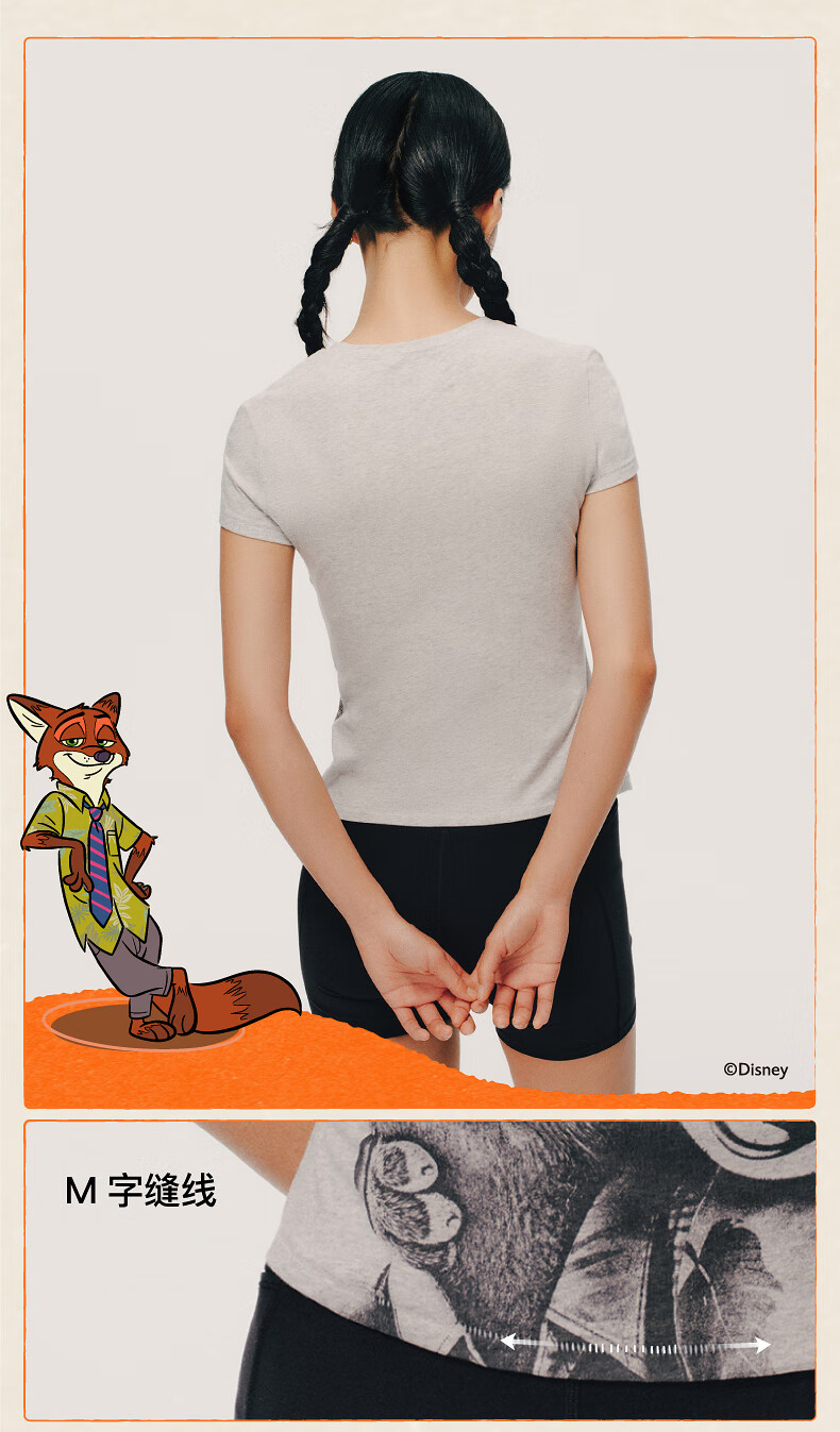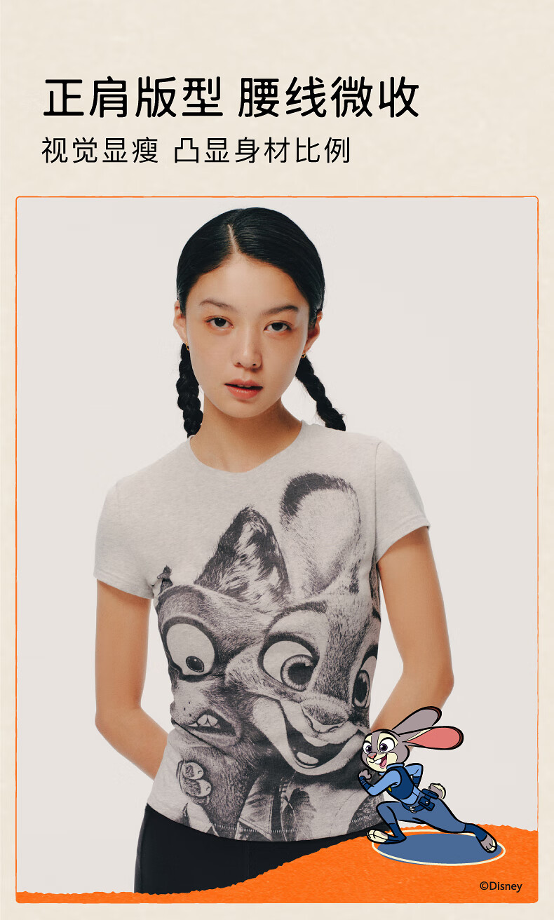 Inside and outside orange label Disney Zootopia cooperation Zhang Xiaowan's same style good stretch right shoulder T-shirt for women printed commuting Untamed Gray S