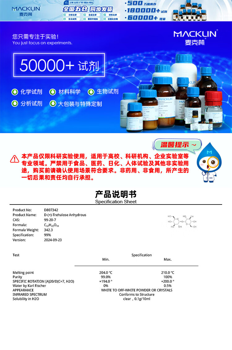 Macklin D-trehalose, anhydrous CAS 99-20-7 D807342-500g