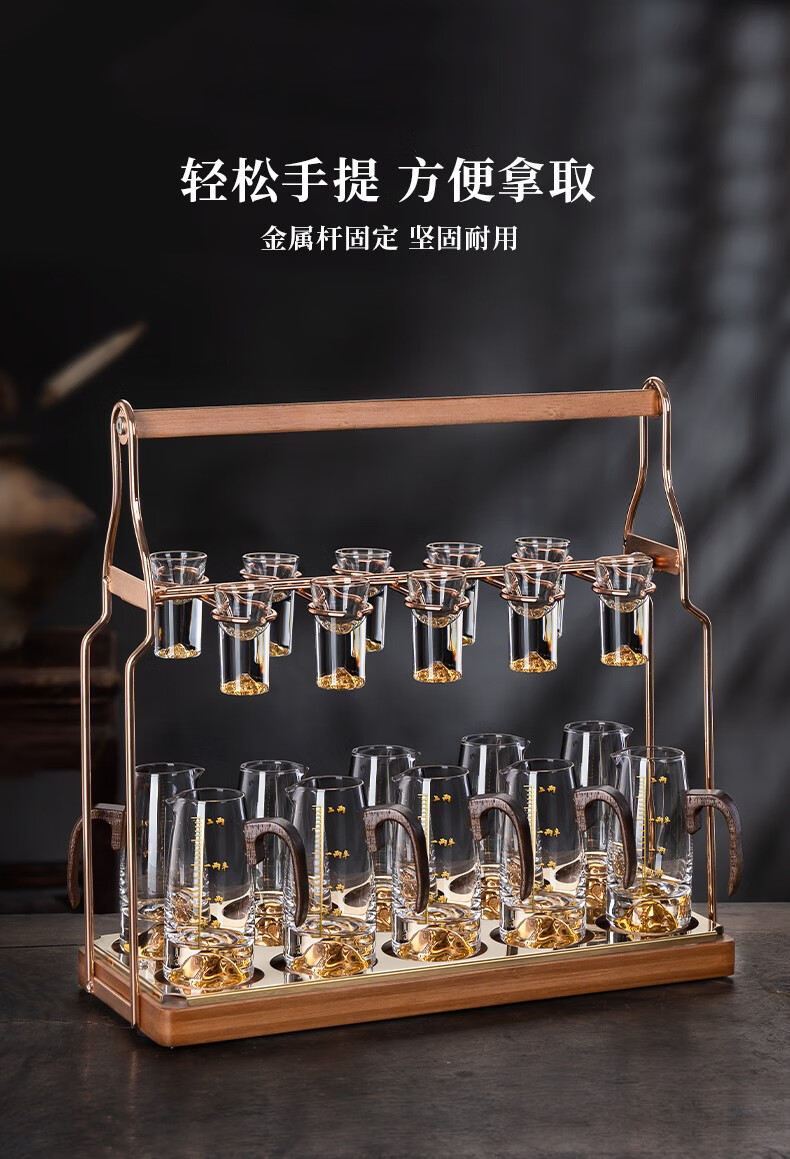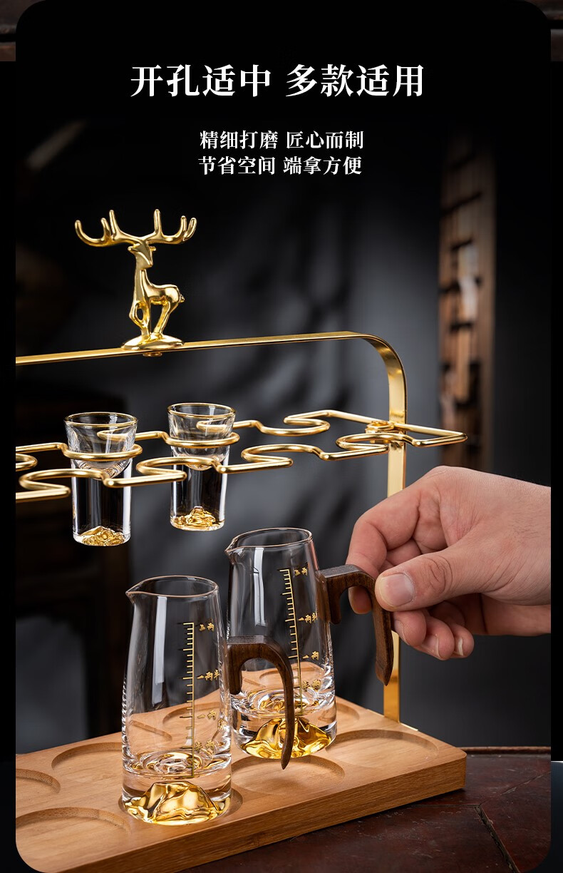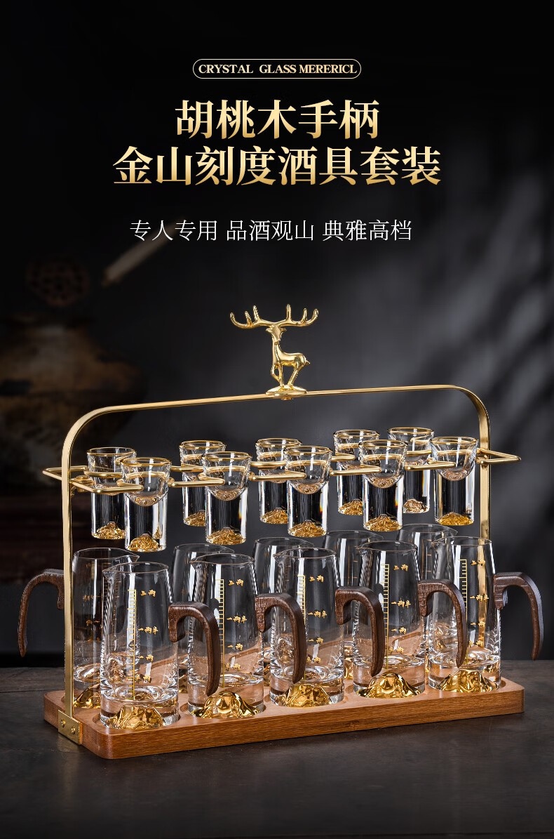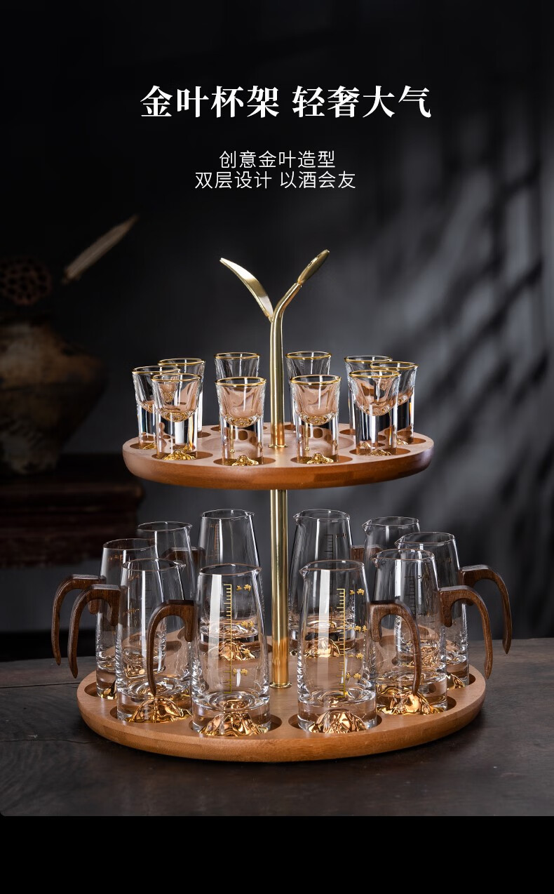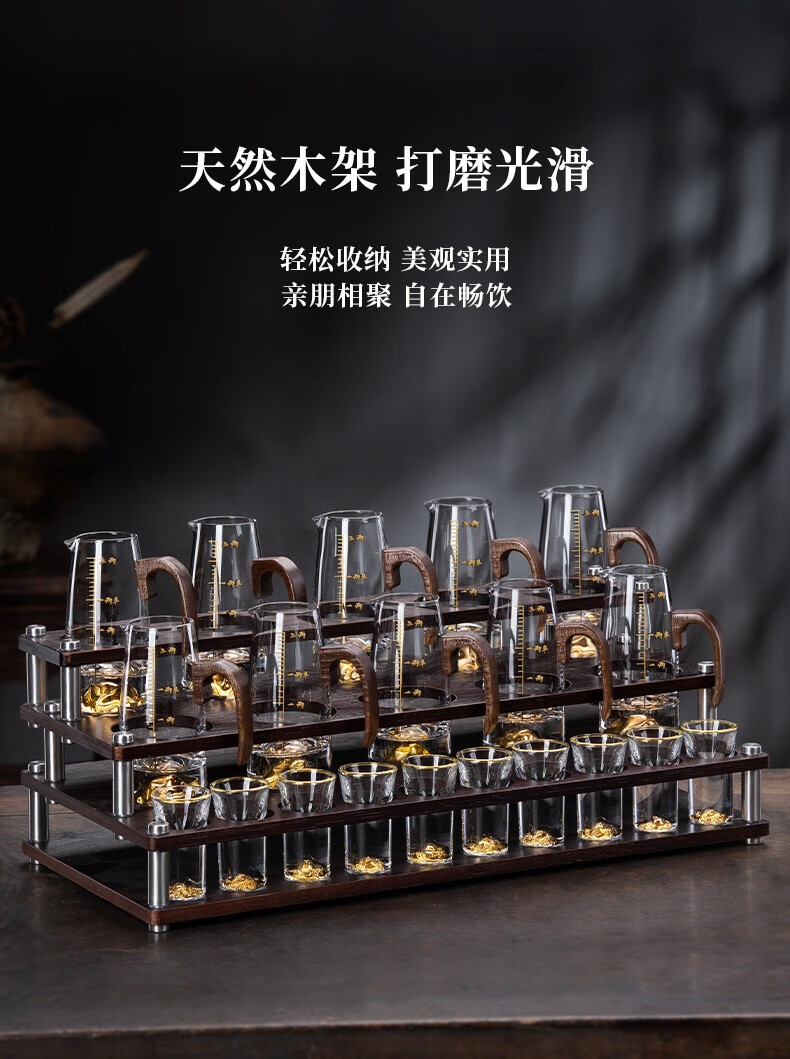 Lugaris walnut handle white wine glass wine dispenser set Jinshan household crystal glass Chinese style light luxury wine set 6 pots 6 cups three-layer rack wooden handle Jinshan wine dispenser + Jinshan gold-rim bullet cup