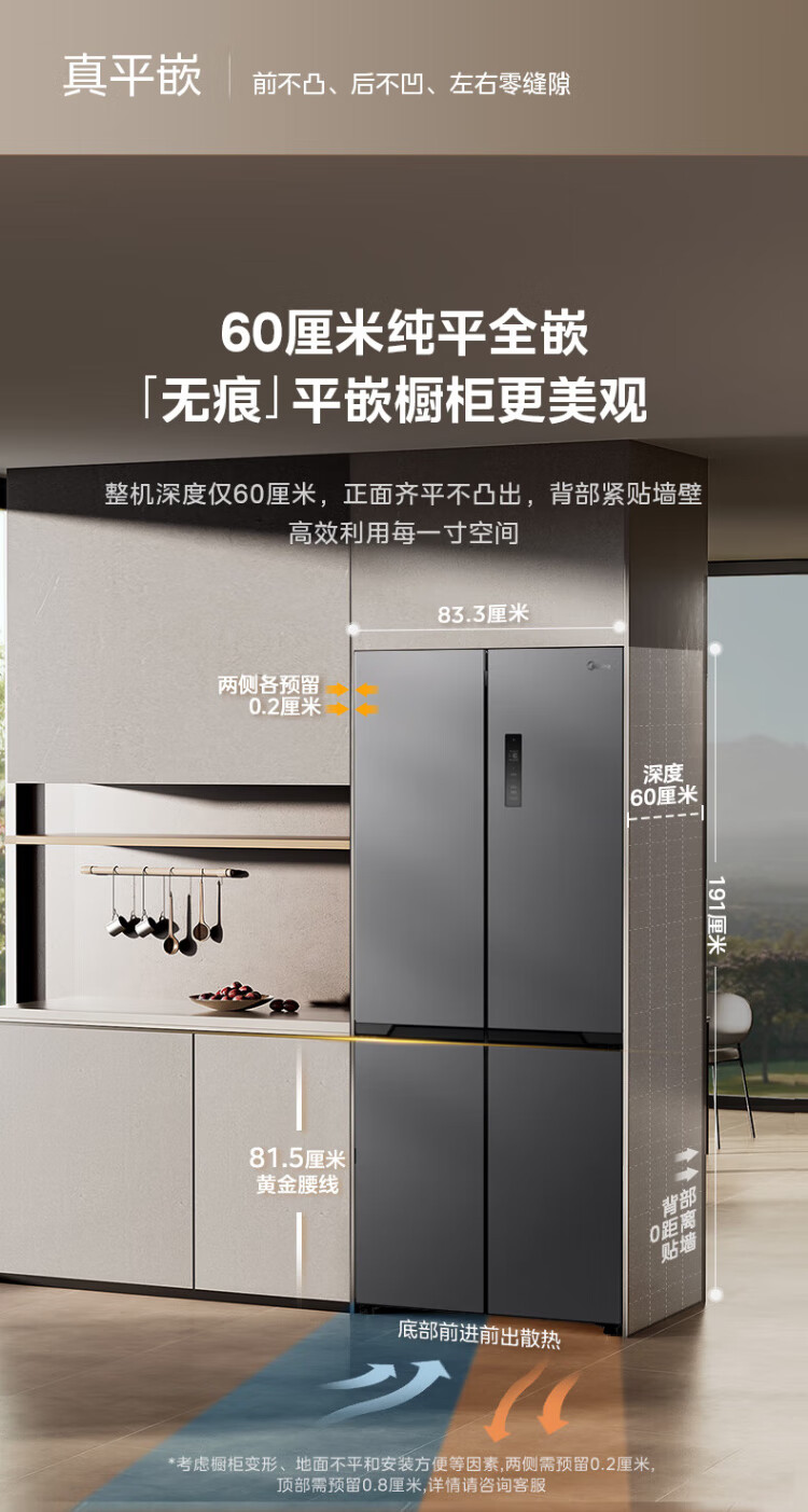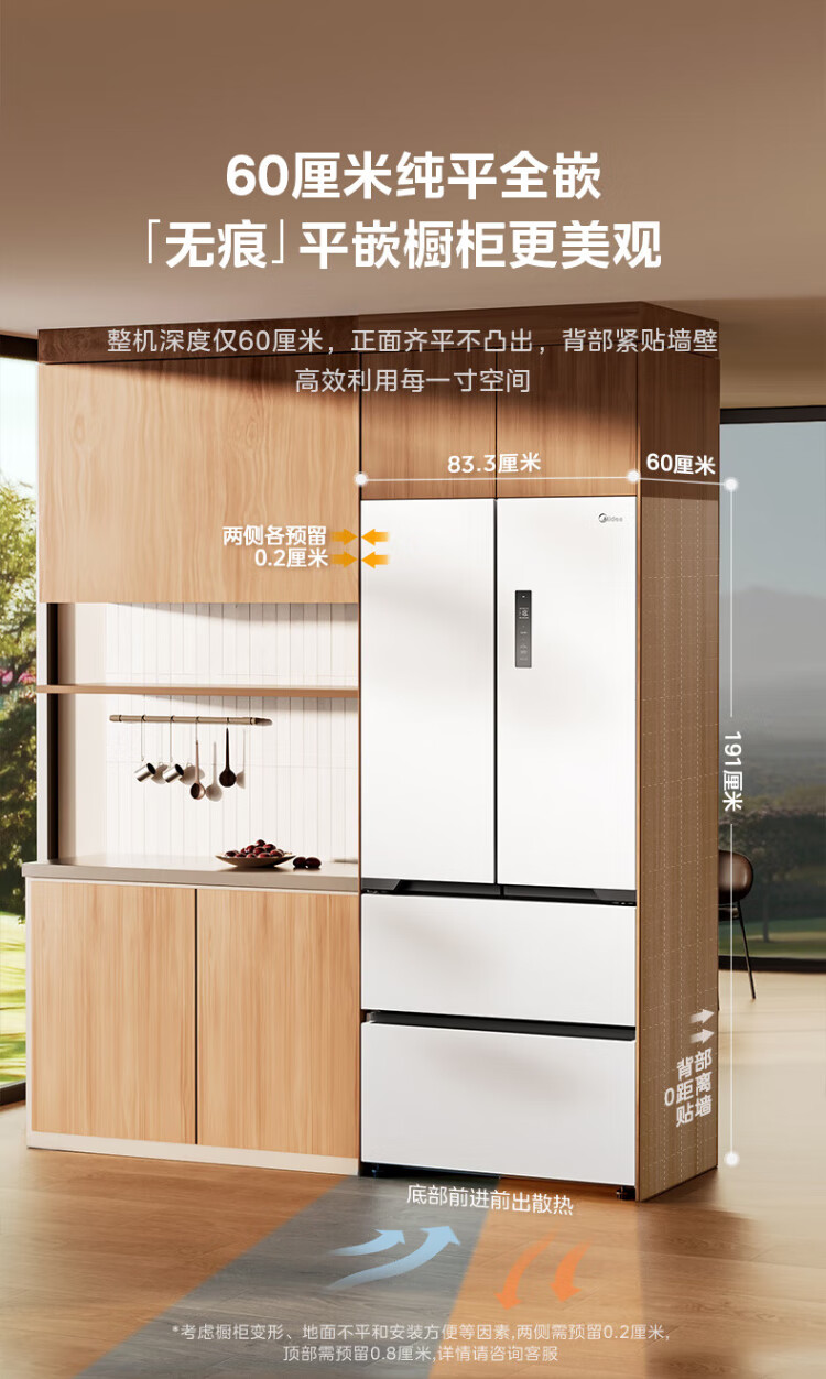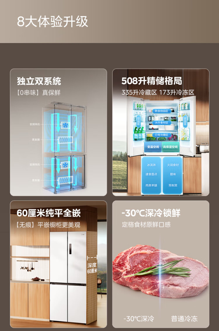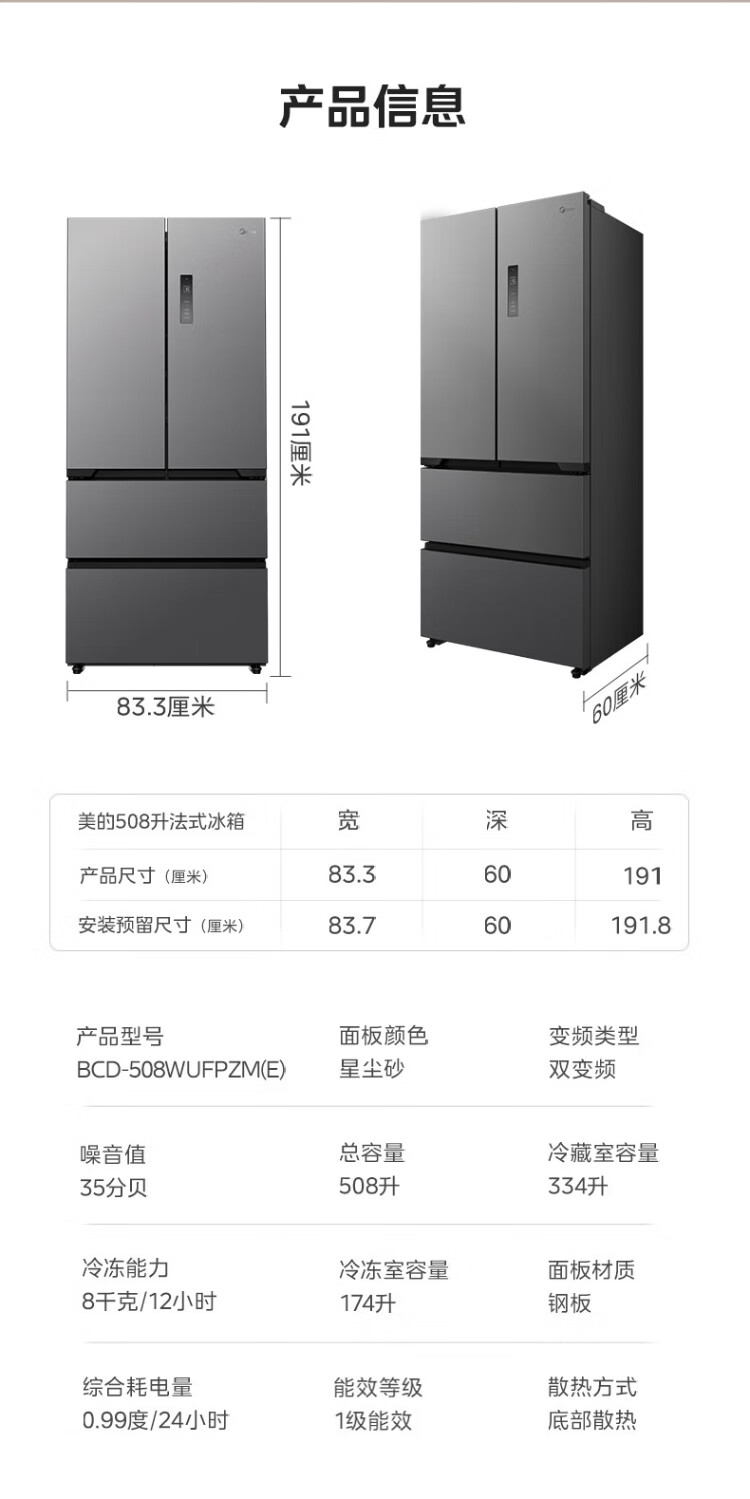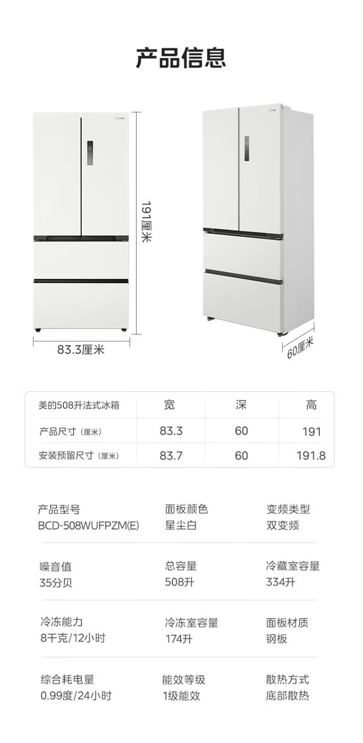 Midea 508 French style refrigerator multi-door Zhenxiang series M60 dual system double cycle ultra-thin flat bottom cooling cross four-door household refrigerator BCD-508WUFPZM(E) French丨embedded dual system丨Stardust White