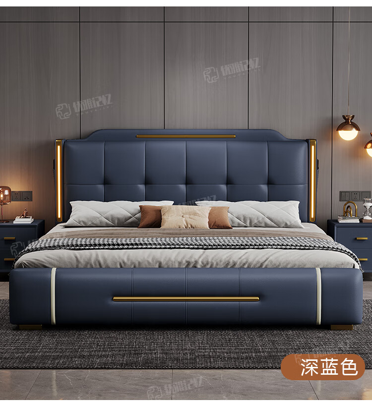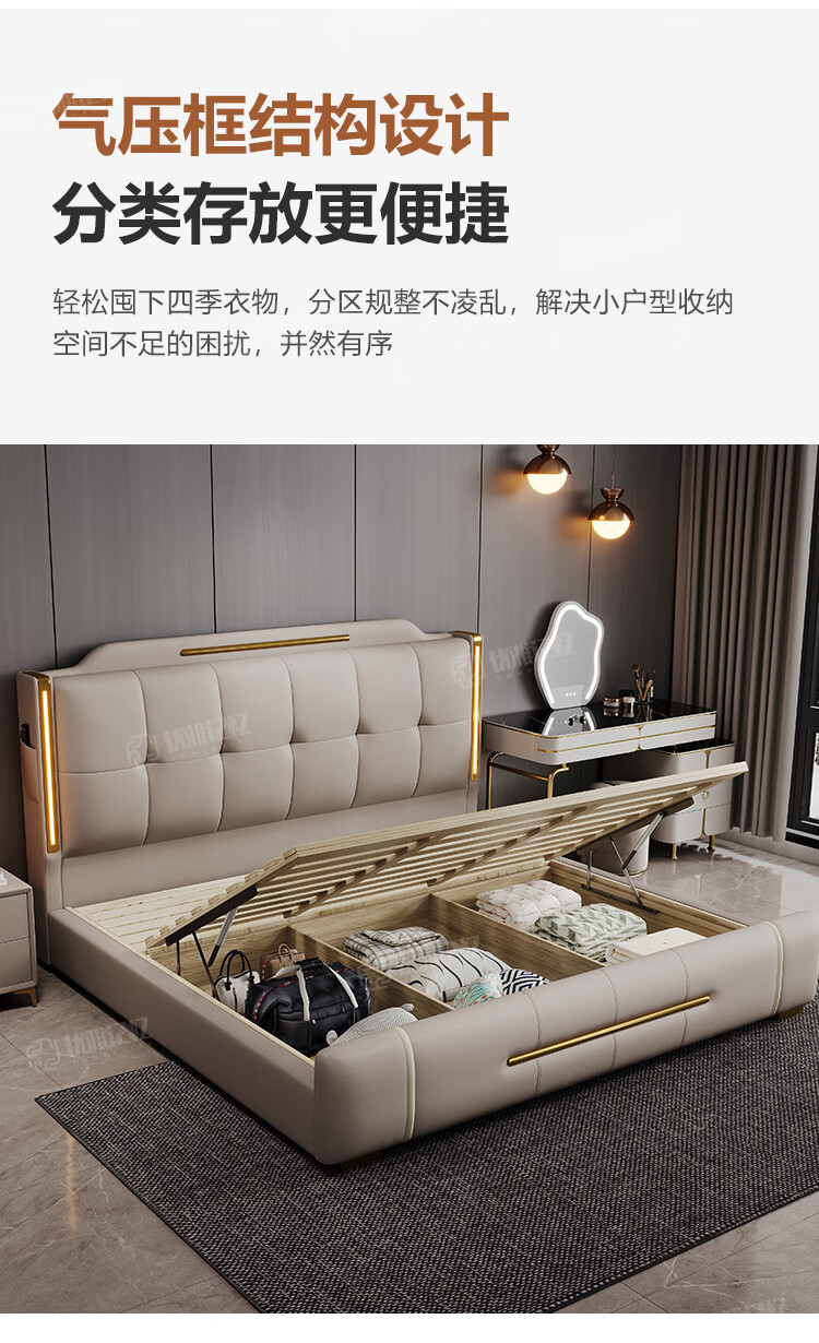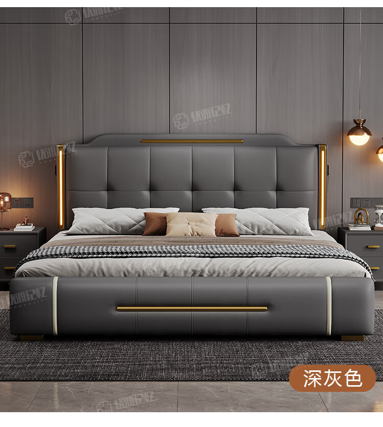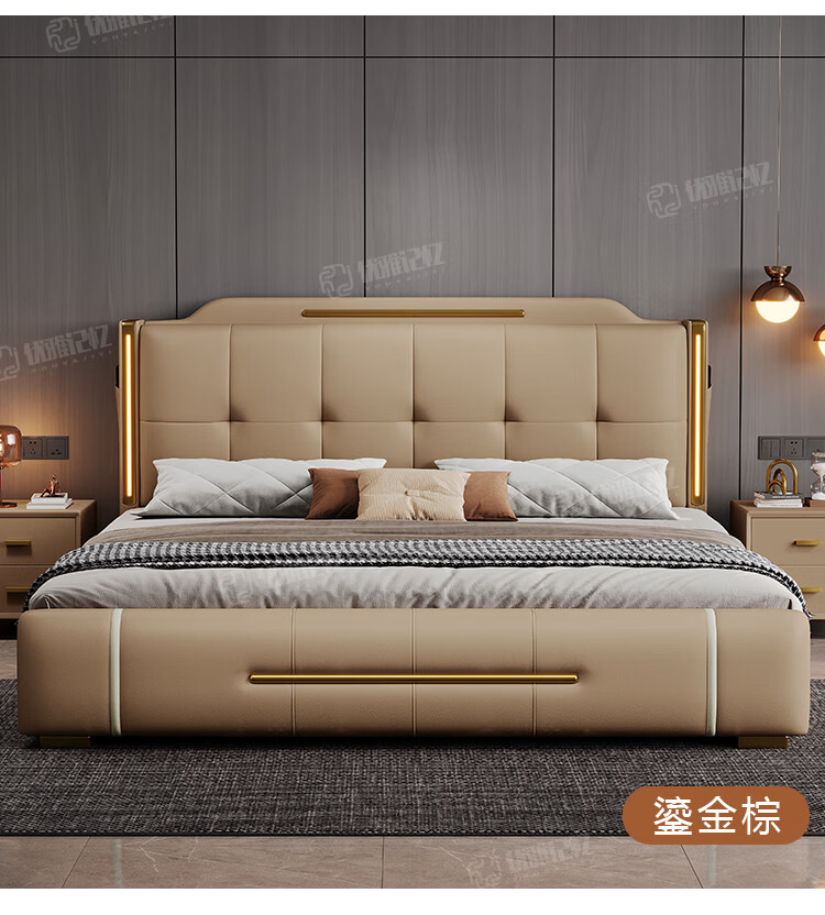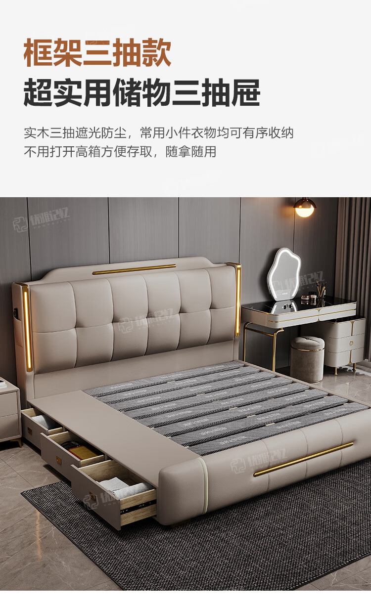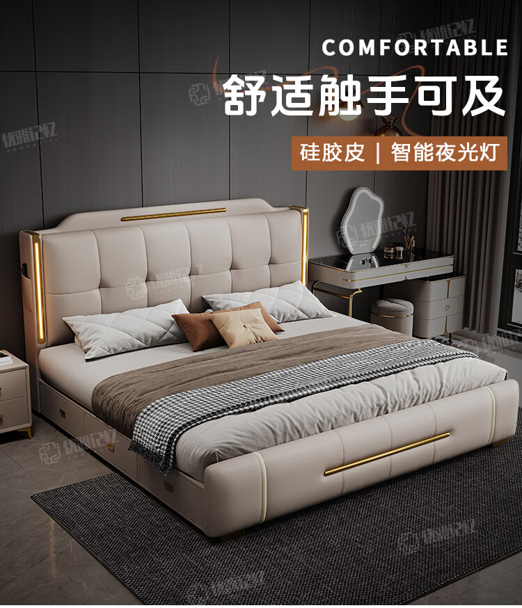 Postscript National Subsidized Bed Double Bed 2m 2.2m Leather Bed Modern Light Luxury Master Bedroom King Bed Storage Marriage Bed Leather Art Bed 1800mm*2000mm Frame Bed Leather Sheet Bed
