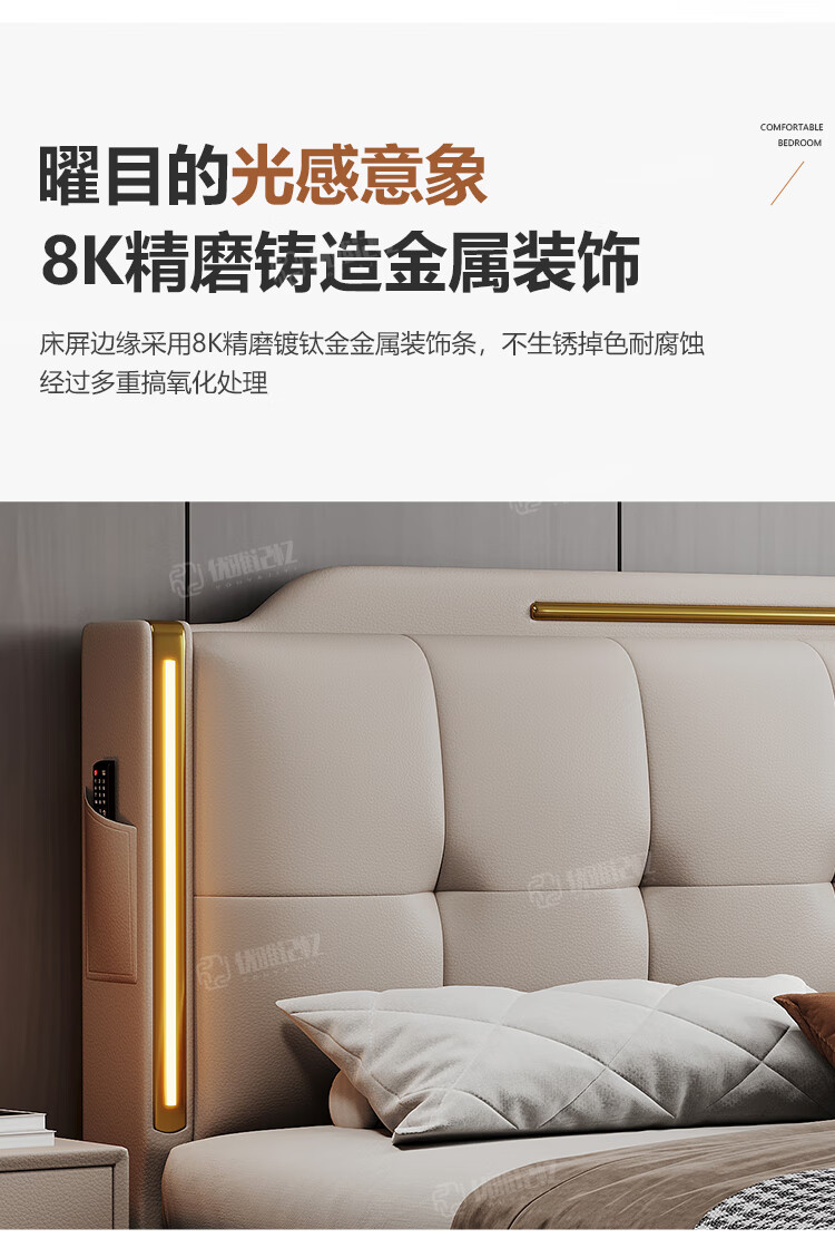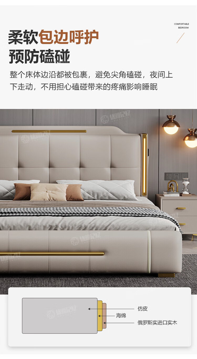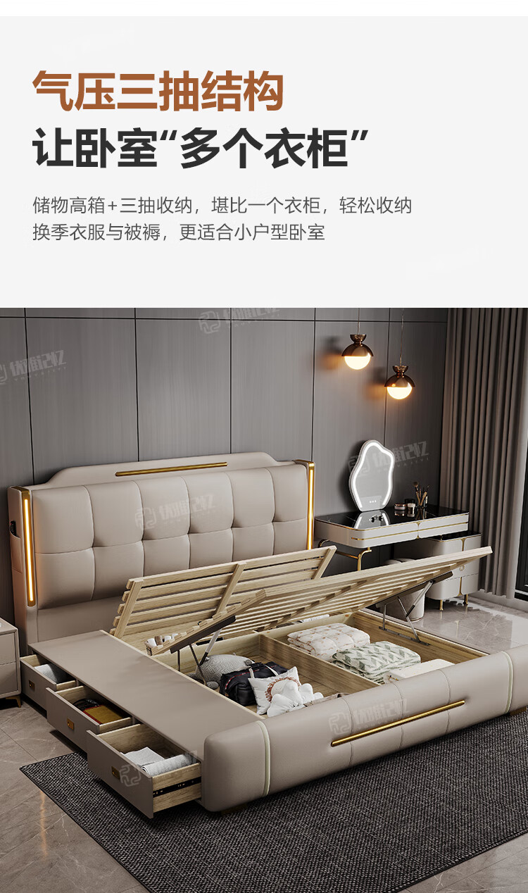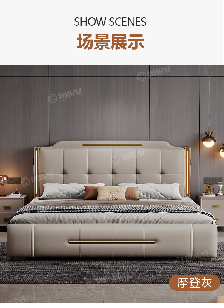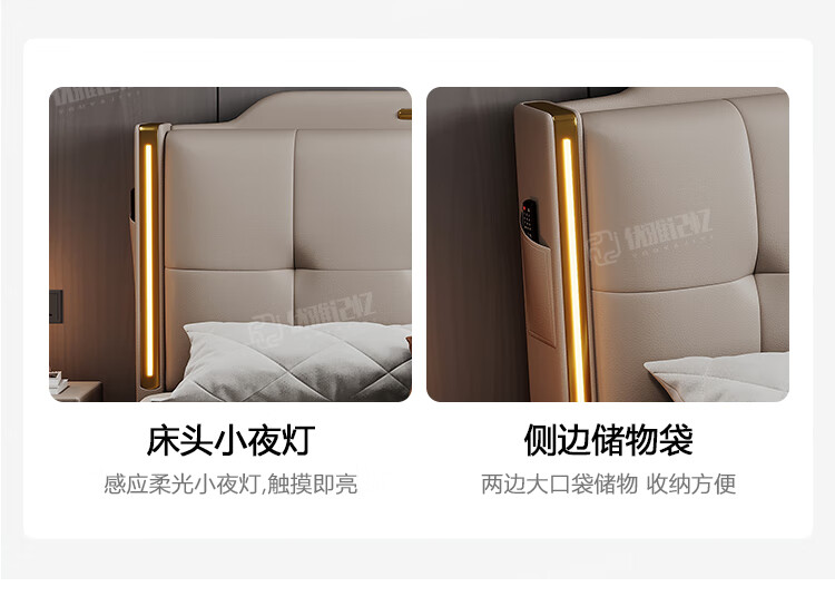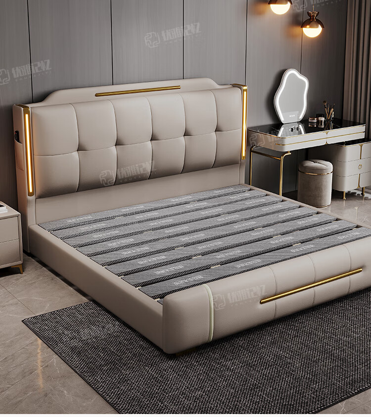 Postscript National Subsidized Bed Double Bed 2m 2.2m Leather Bed Modern Light Luxury Master Bedroom King Bed Storage Marriage Bed Leather Art Bed 1800mm*2000mm Frame Bed Leather Sheet Bed