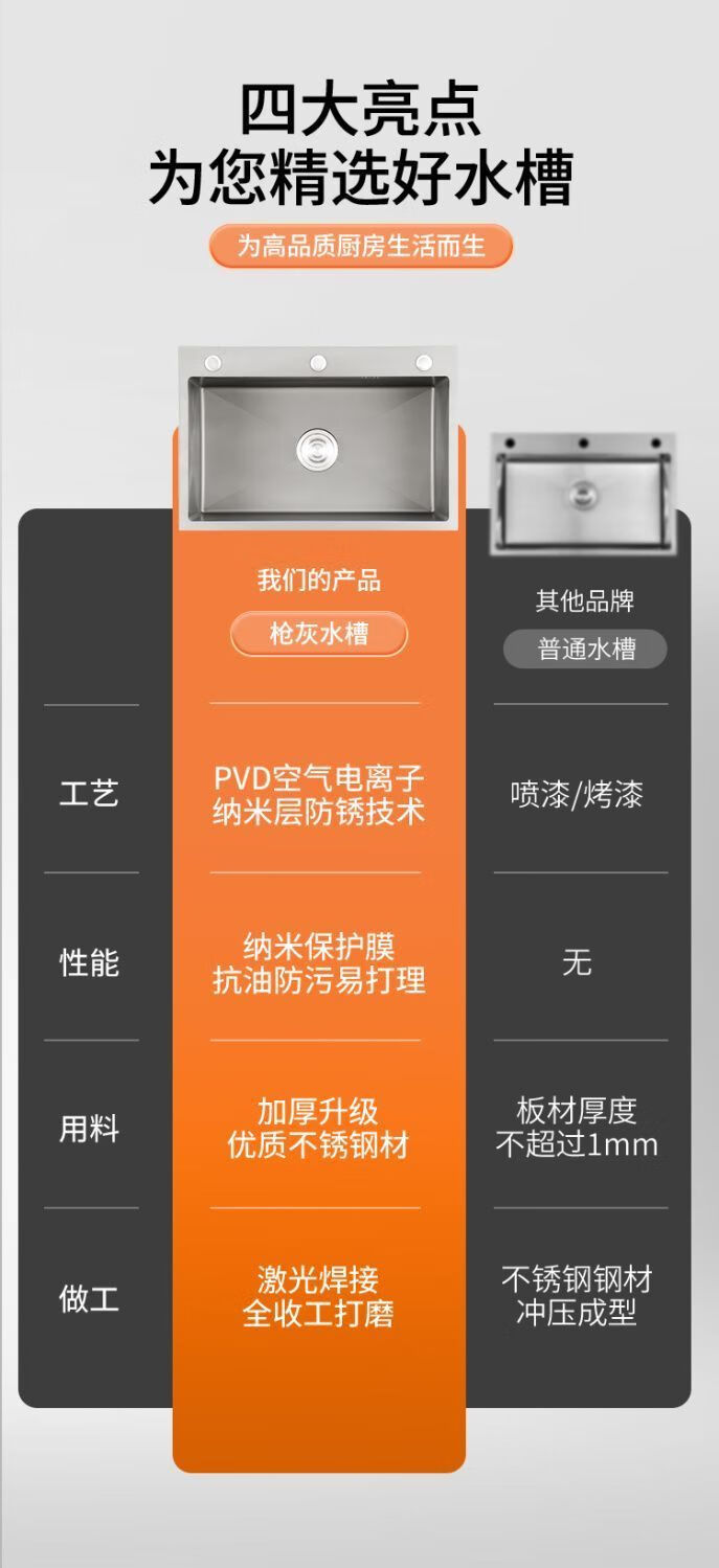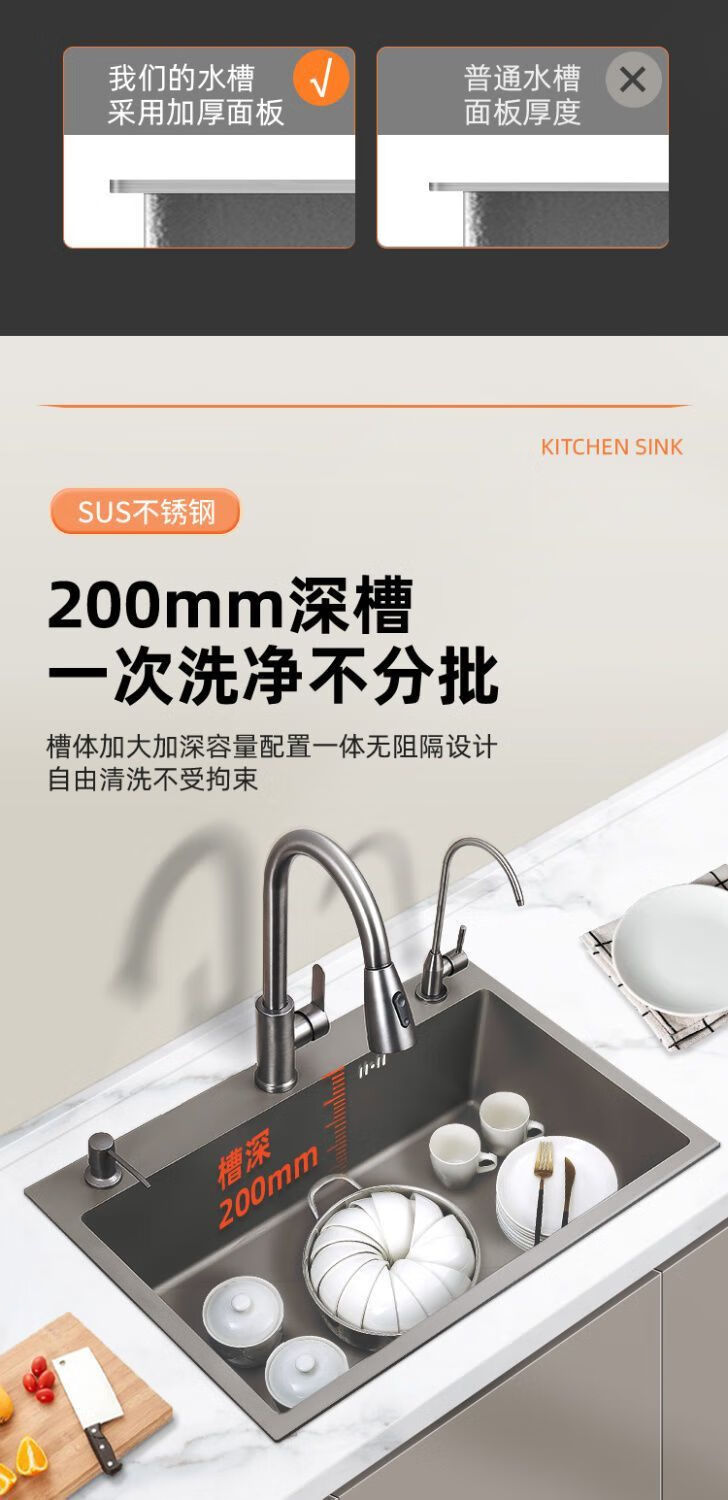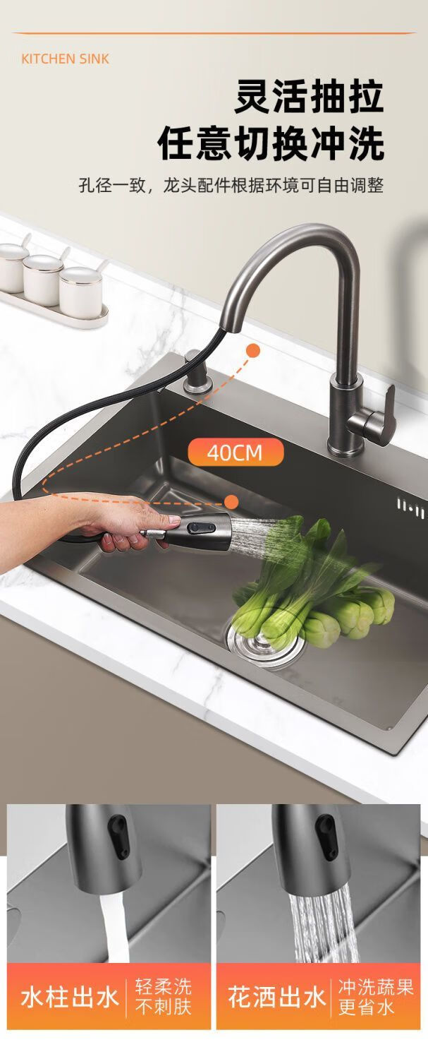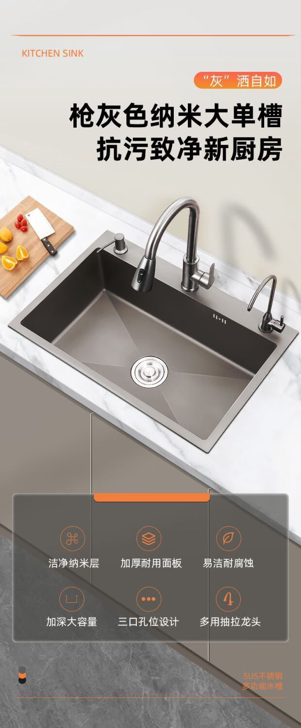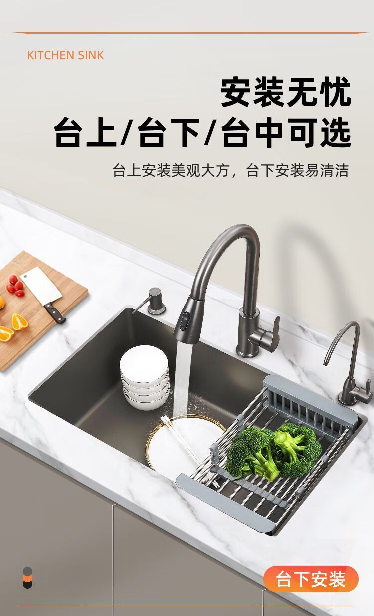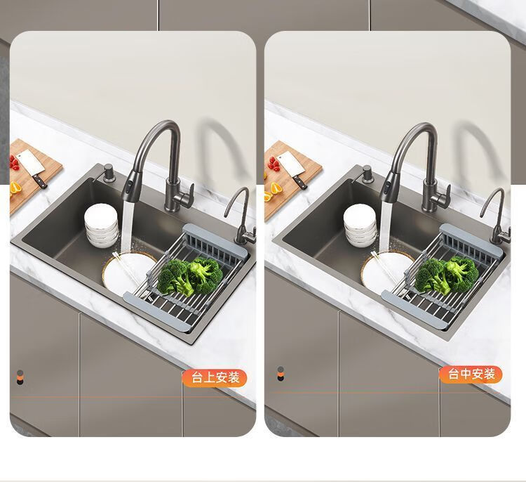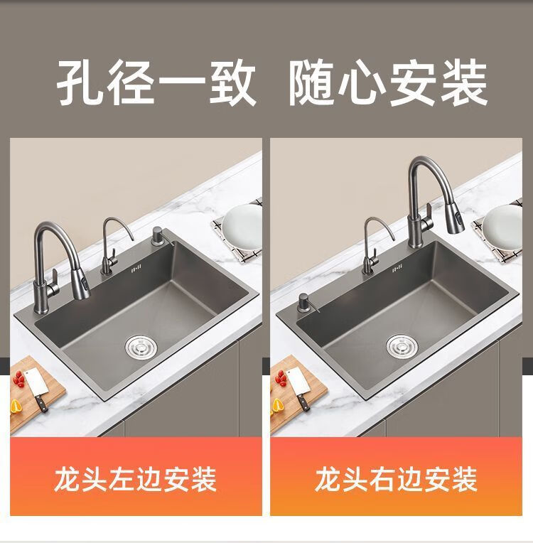 Fuyan 304 stainless steel thickened gun gray sink large single tank home kitchen countertop dishwashing sink dish basin stainless steel hot and cold pull-out faucet luxury package gun gray (length 37.5 width 25) thickened stainless steel