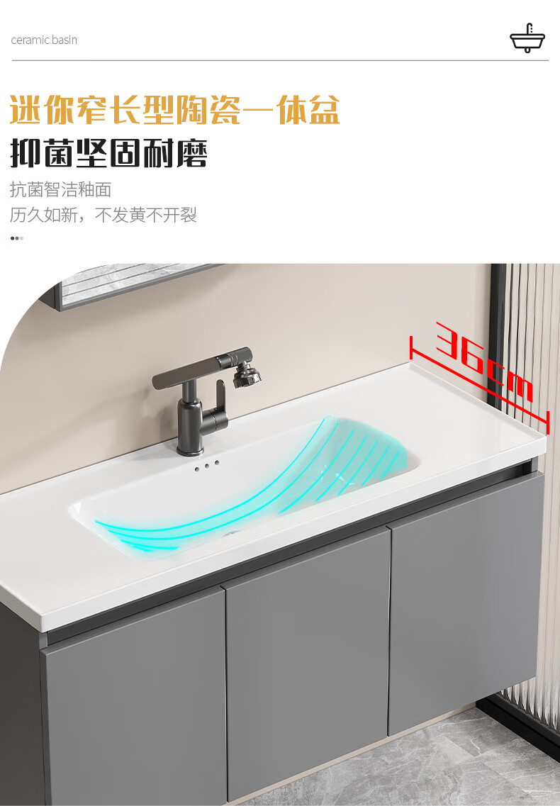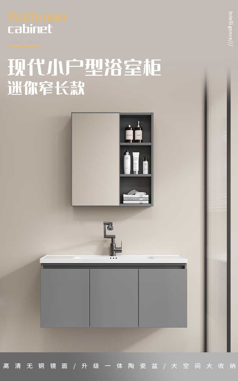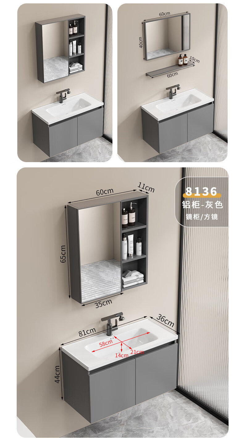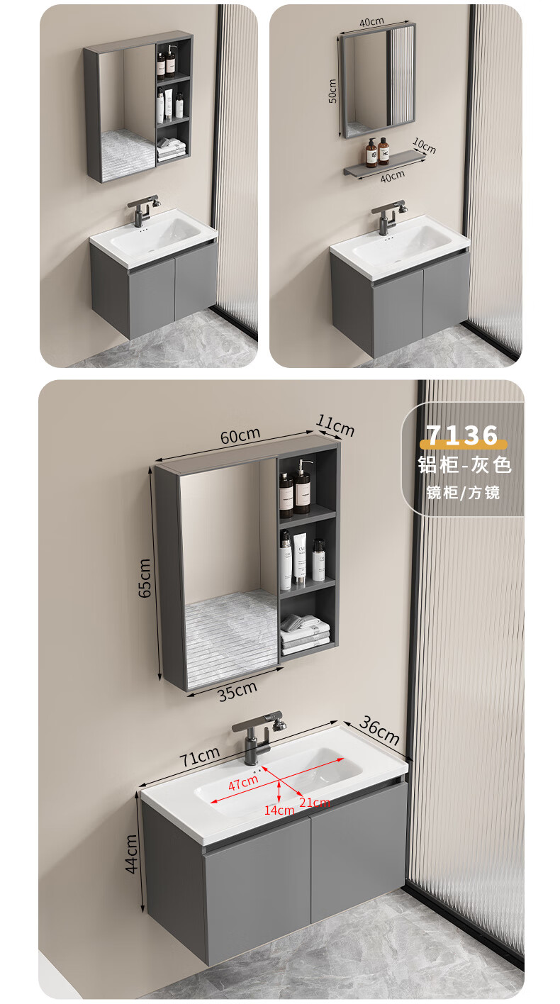 Shenghu 35cm wide and narrow long honeycomb aluminum bathroom cabinet combination washbasin small apartment bathroom washbasin integrated basin pure gray 6136+60 gray mirror cabinet + faucet gray door panel