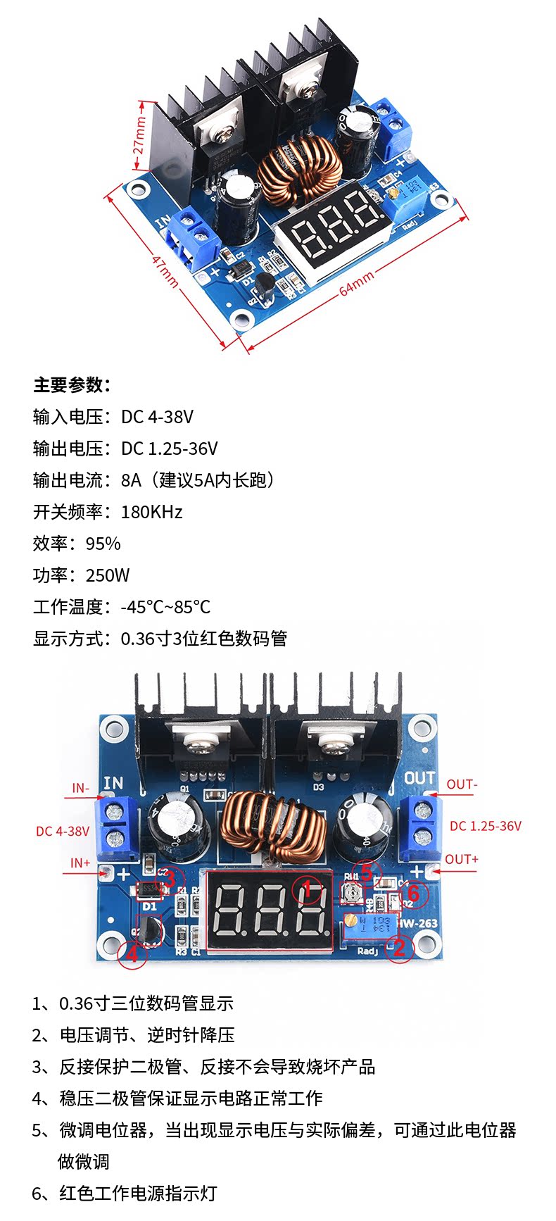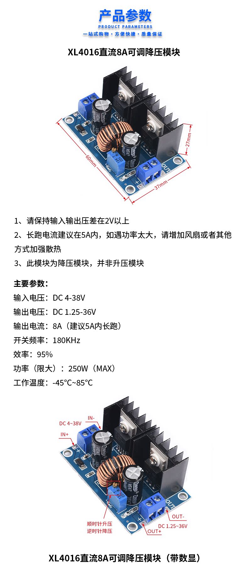 XL4016E1 adjustable voltage regulator and step-down module with digital display DC-DC high-power DC voltage regulator board 8A current XL4016 DC 8A adjustable step-down module