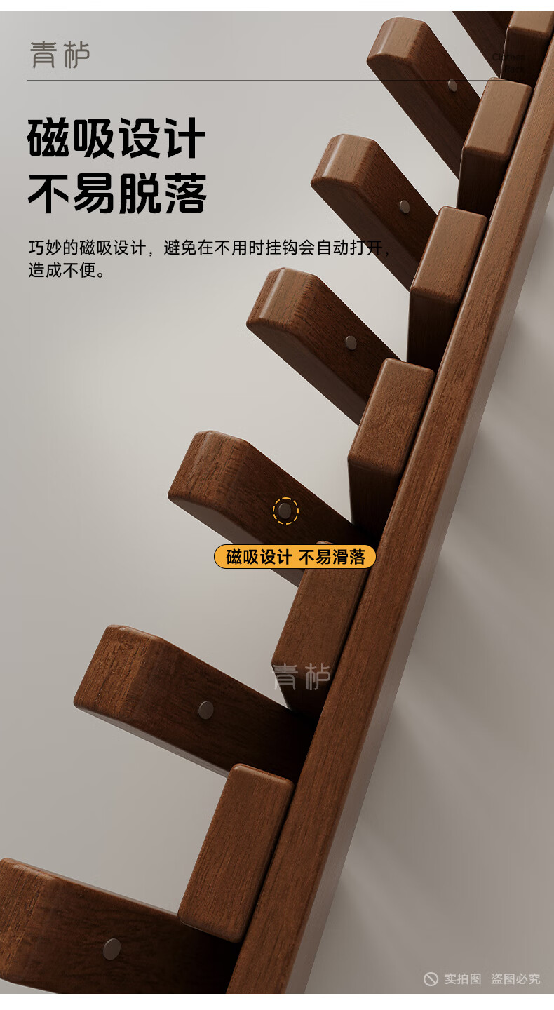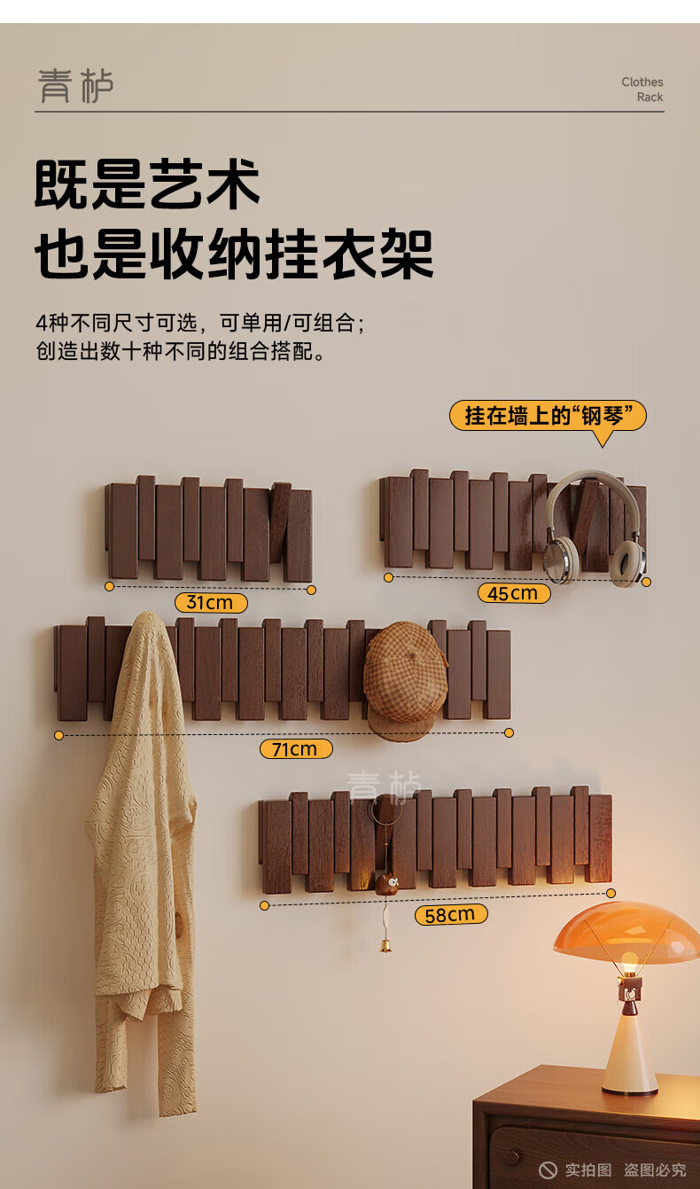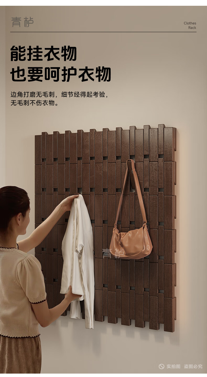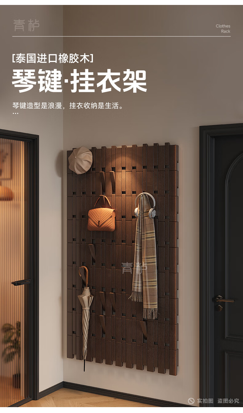 Qinggu solid wood piano key clothes hanger wall hanging coat rack wall hanging clothes hook bag rack entrance door wall clothes hook 35MM thickened walnut color 10 hooks 71CM*1