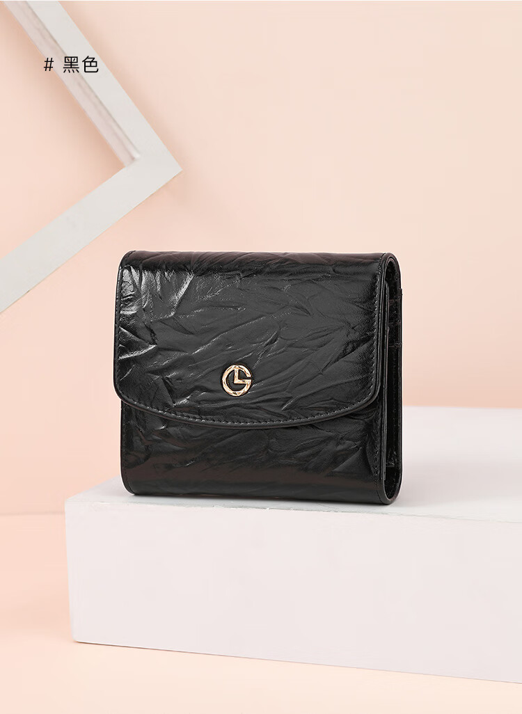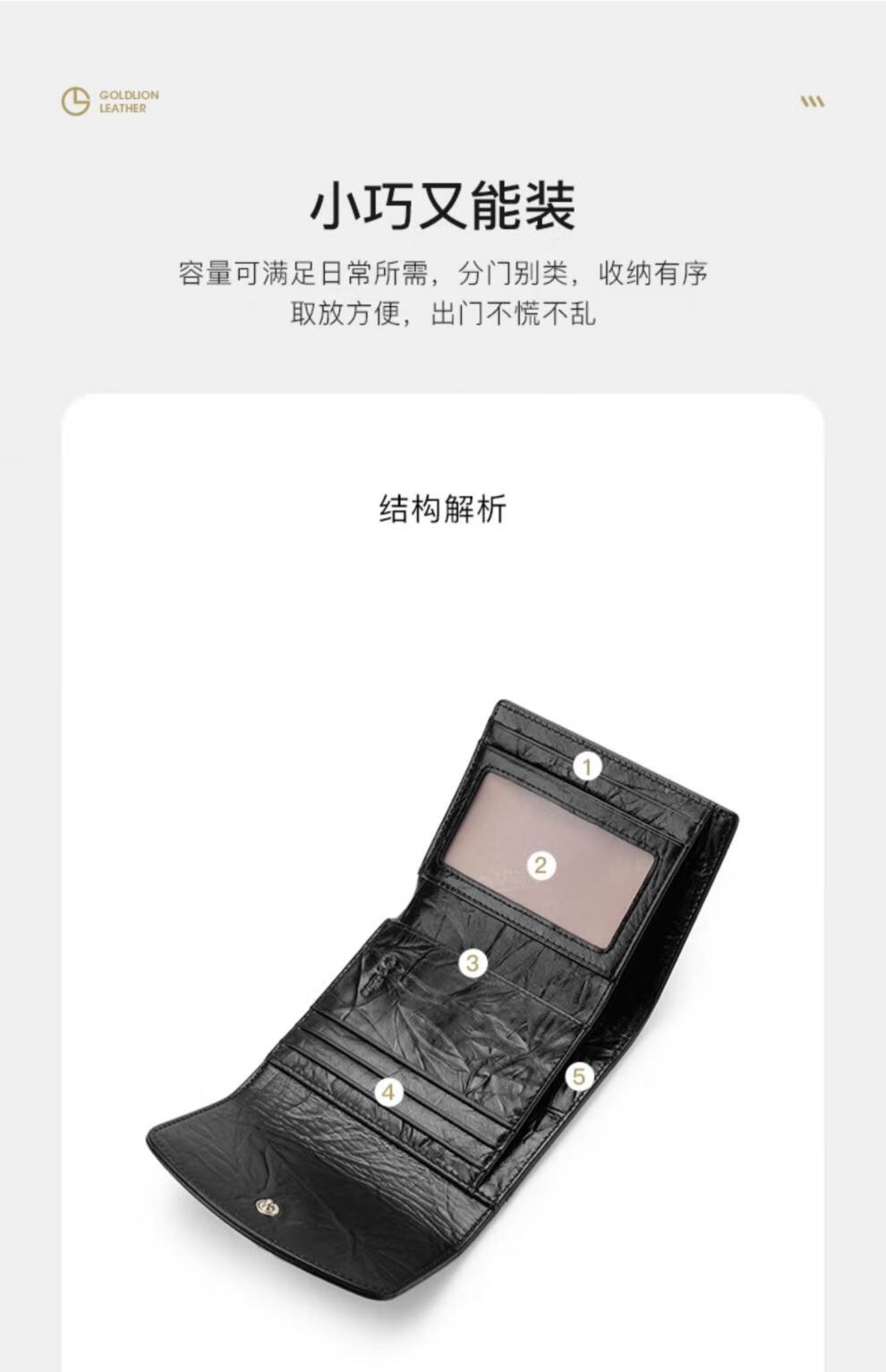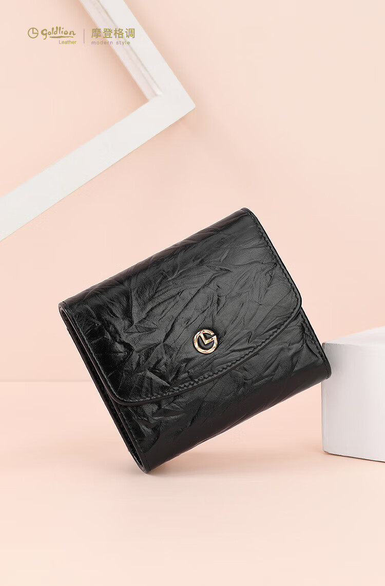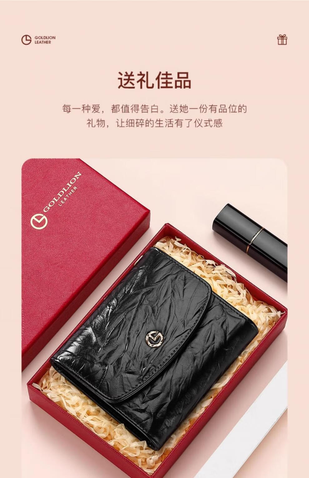 Goldlion 2025 Spring Hot Style Short Wallet Women's Trendy Niche Design Multi-Card Slot Wallet Cowhide Coin Purse Black
