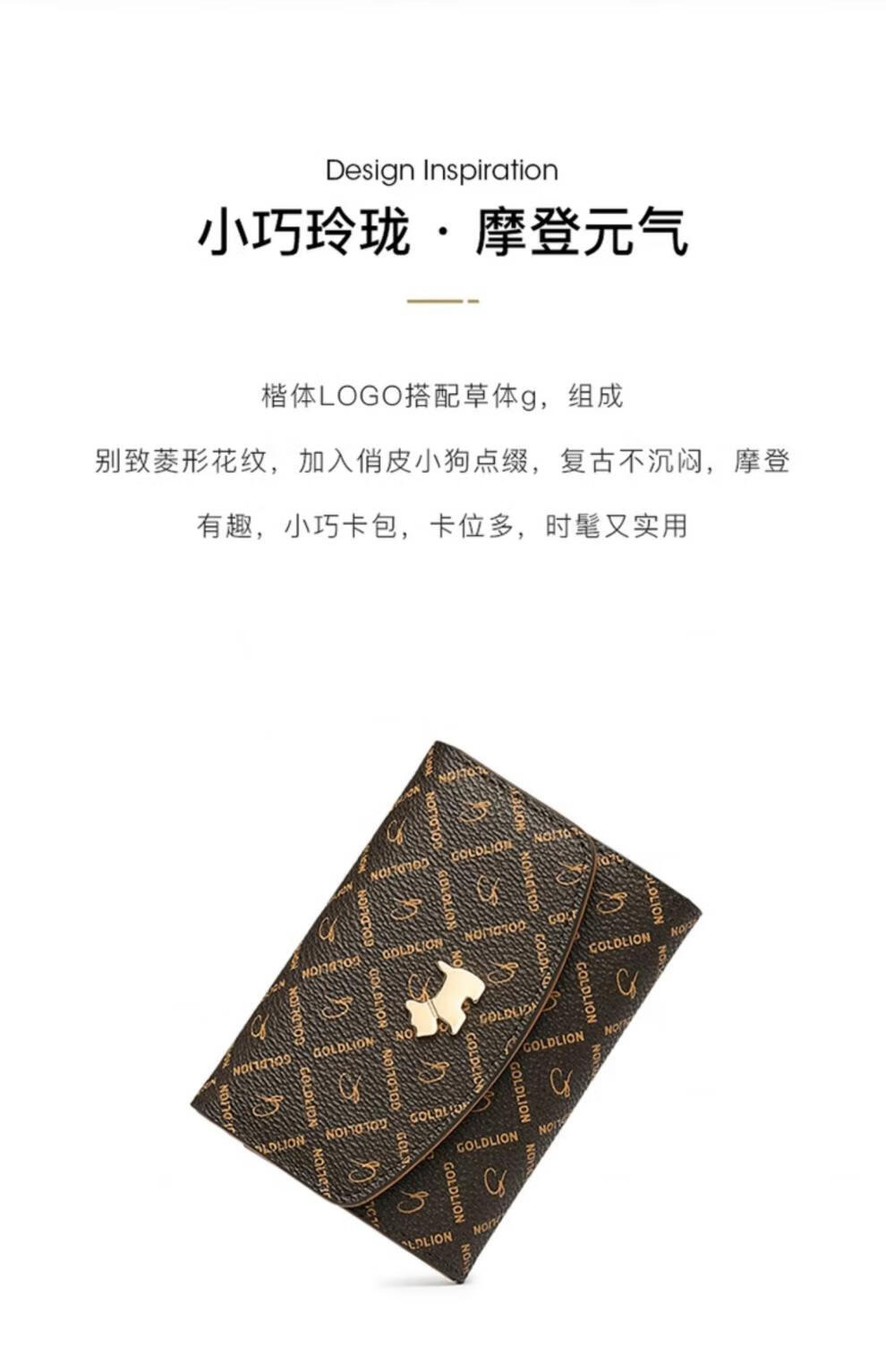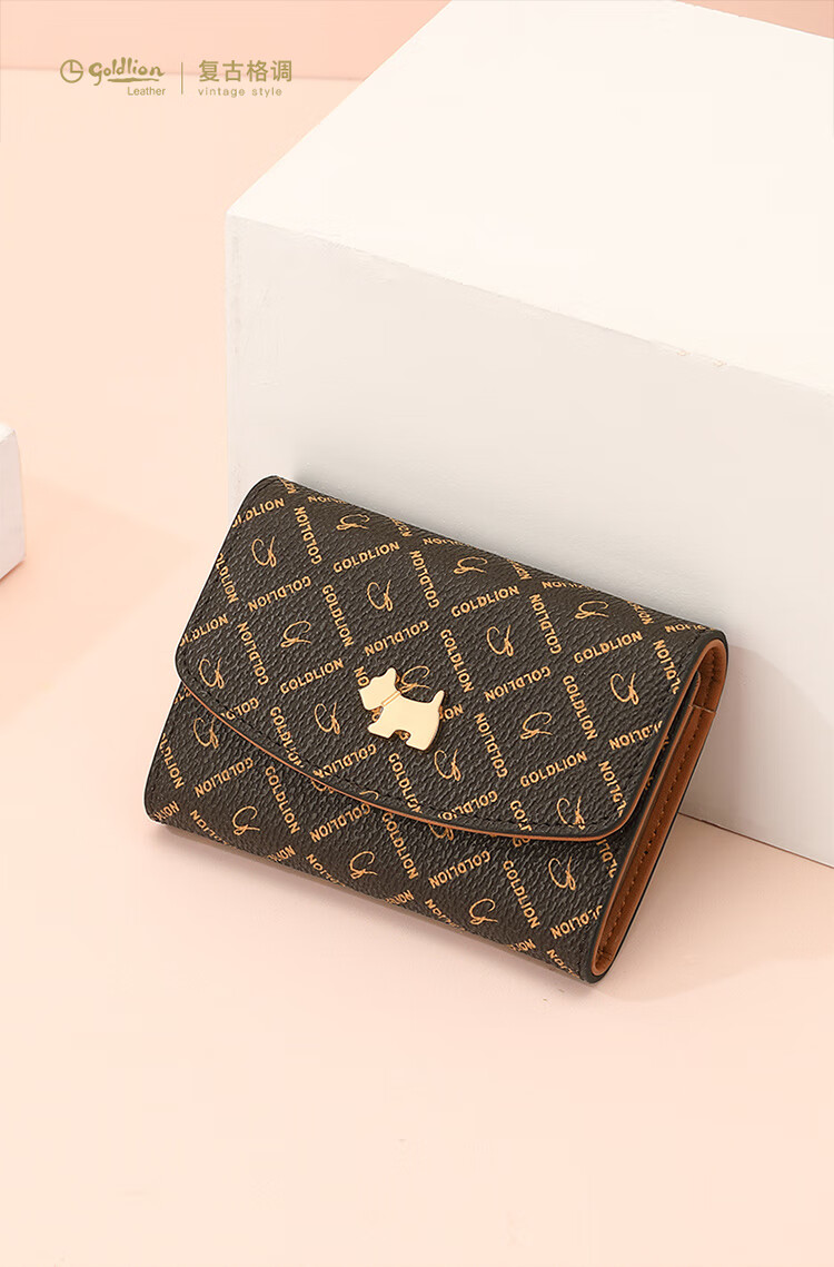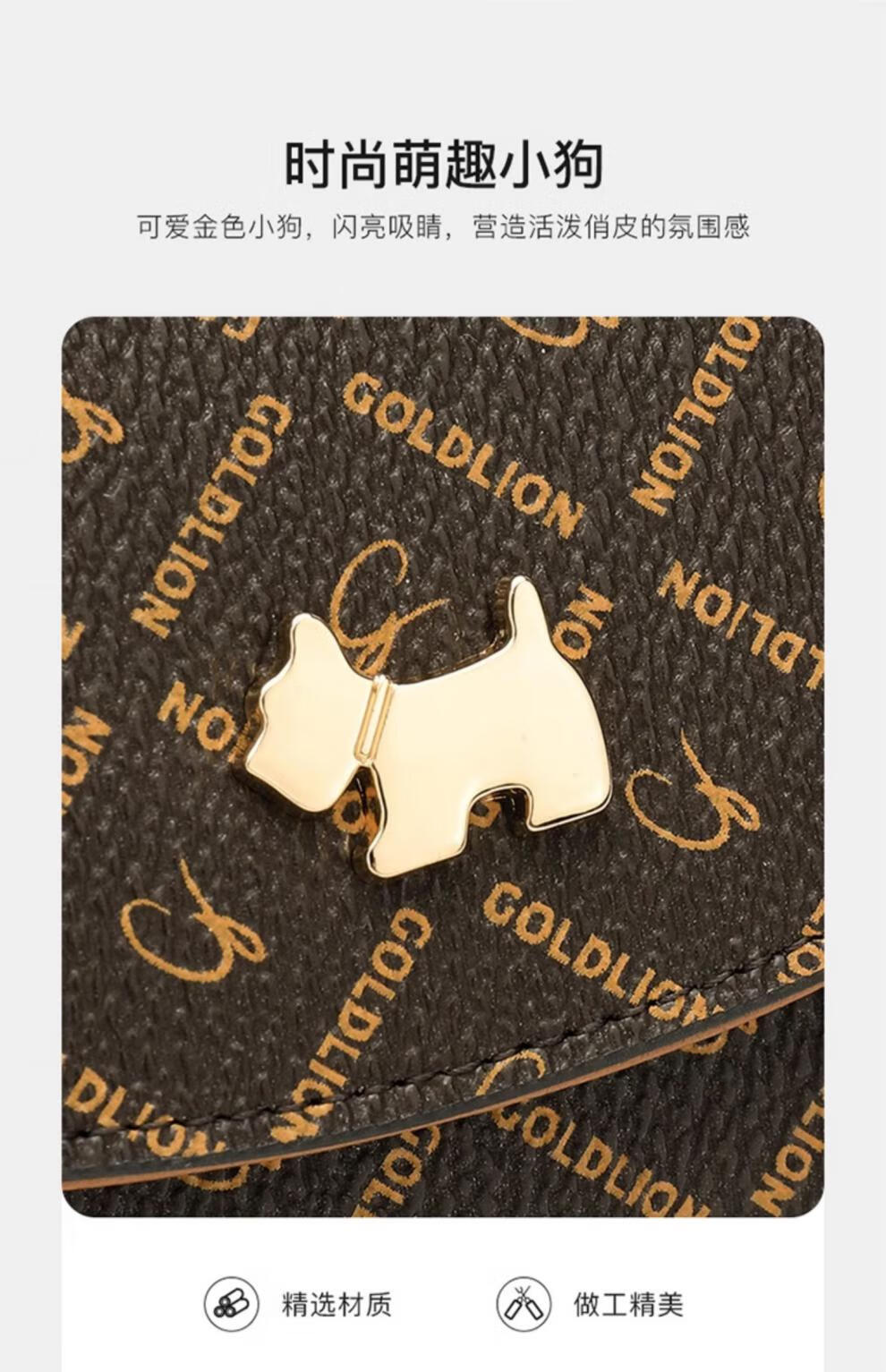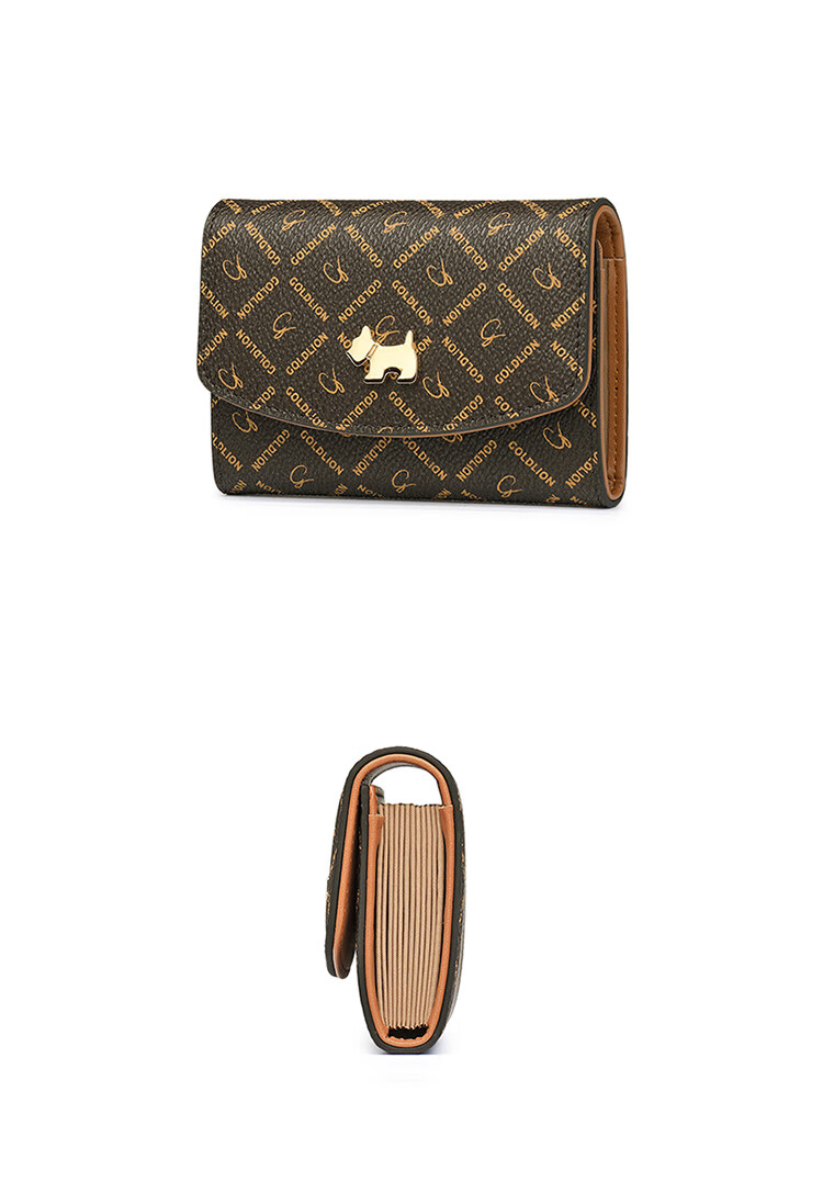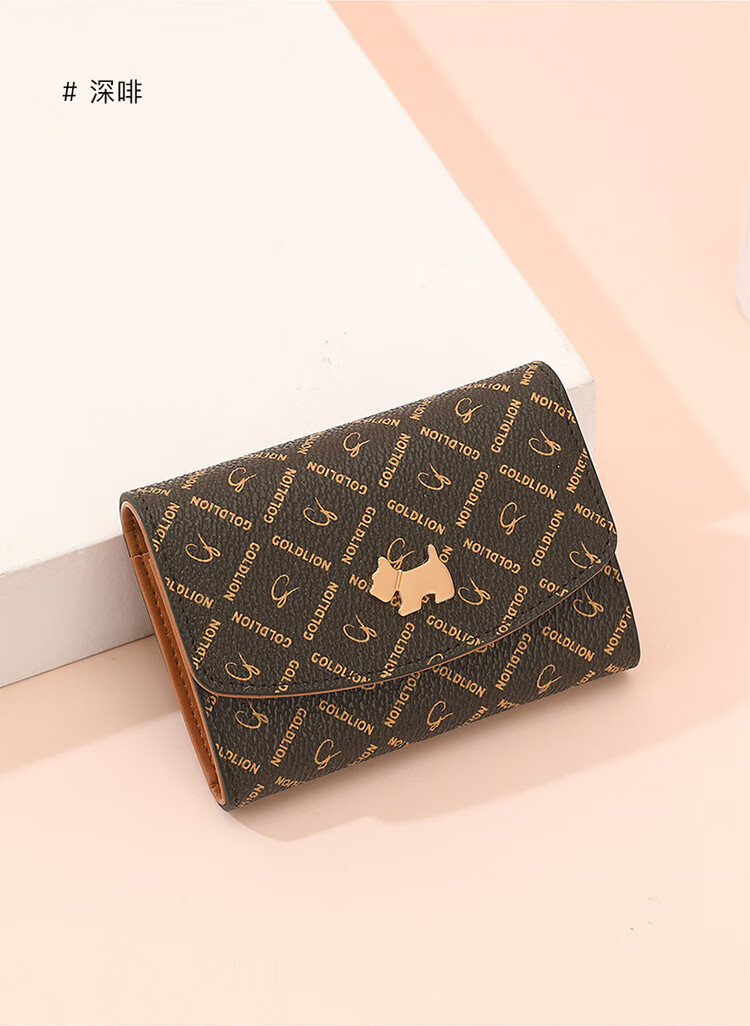 Goldlion 2025 Hot Women's Bag Fashion Printed Wallet Women's Short Cute Puppy Card Holder Multi-Card Slot Wallet Trendy Dark Brown