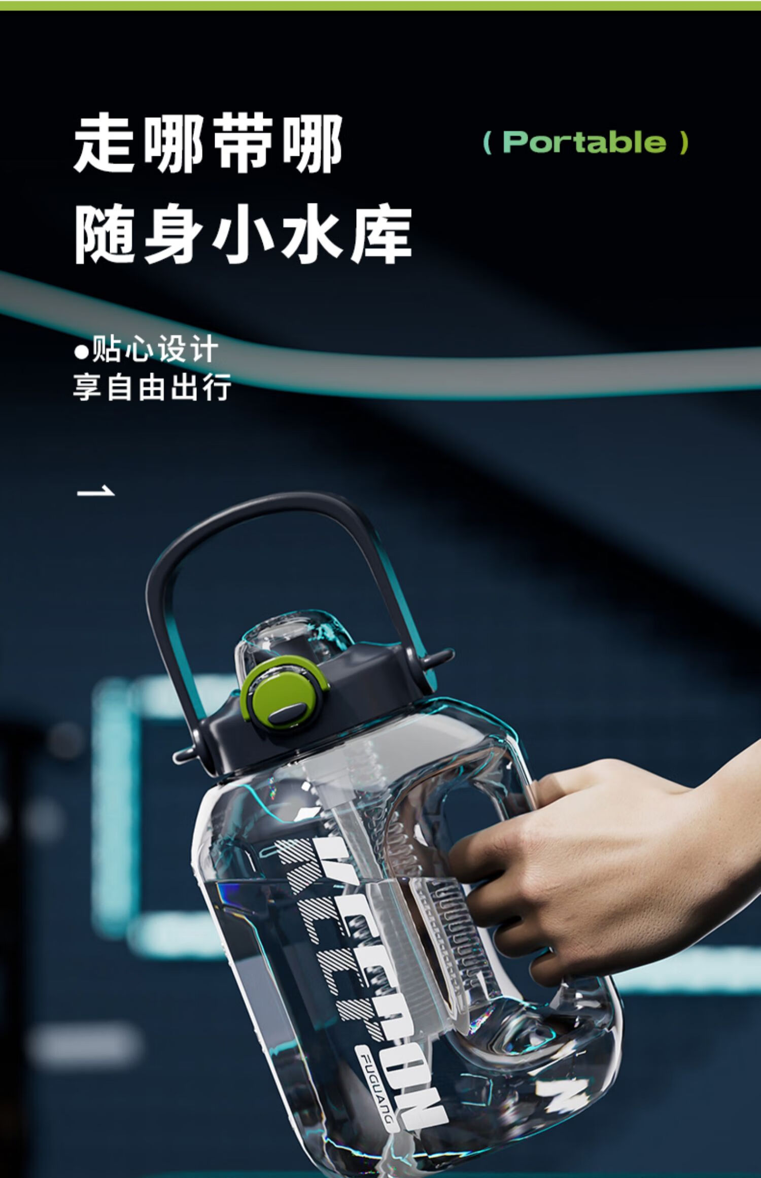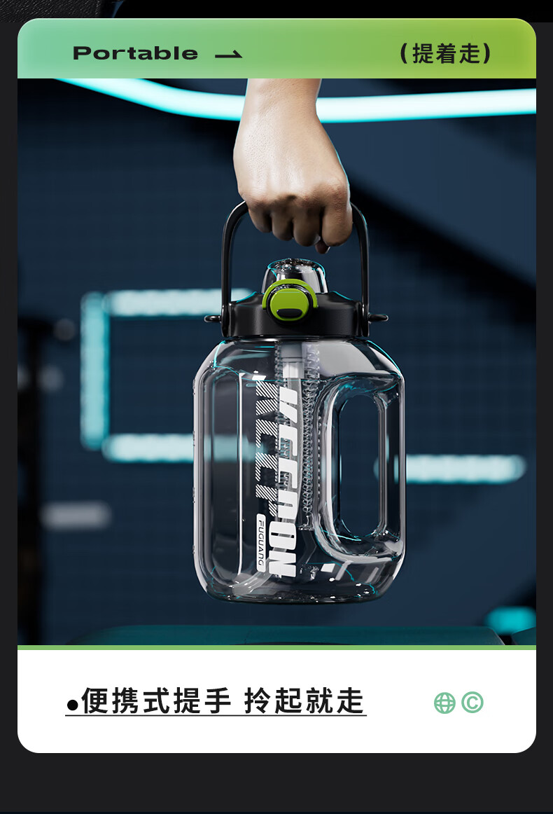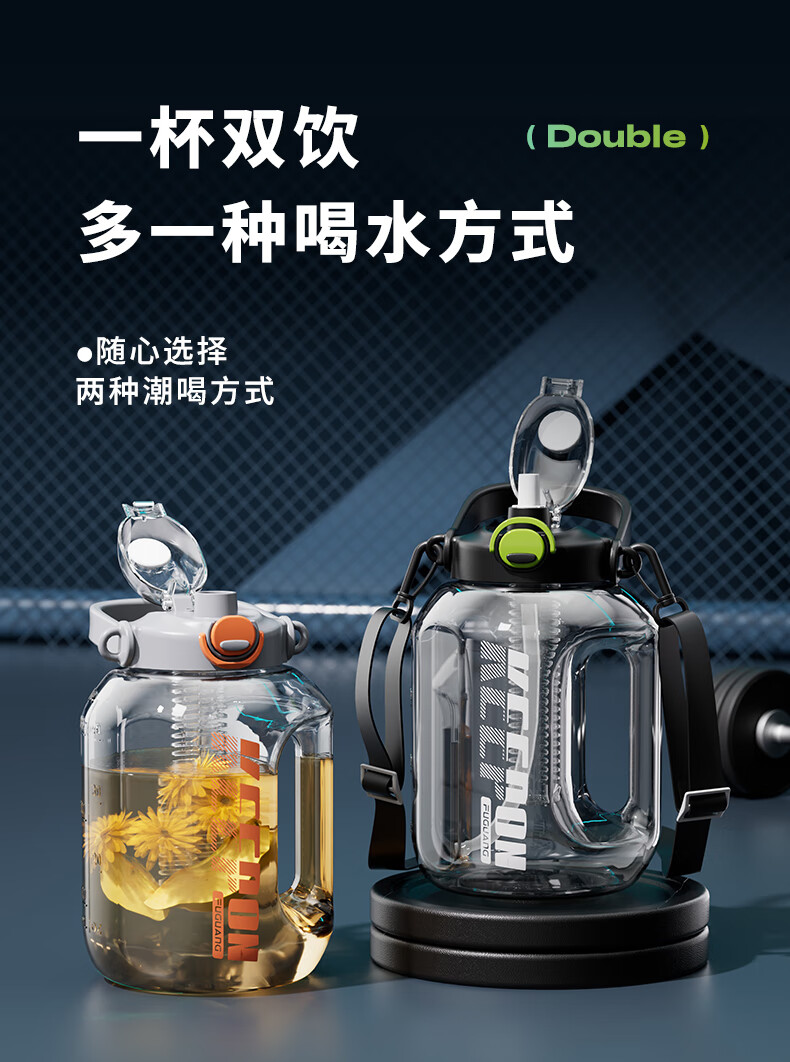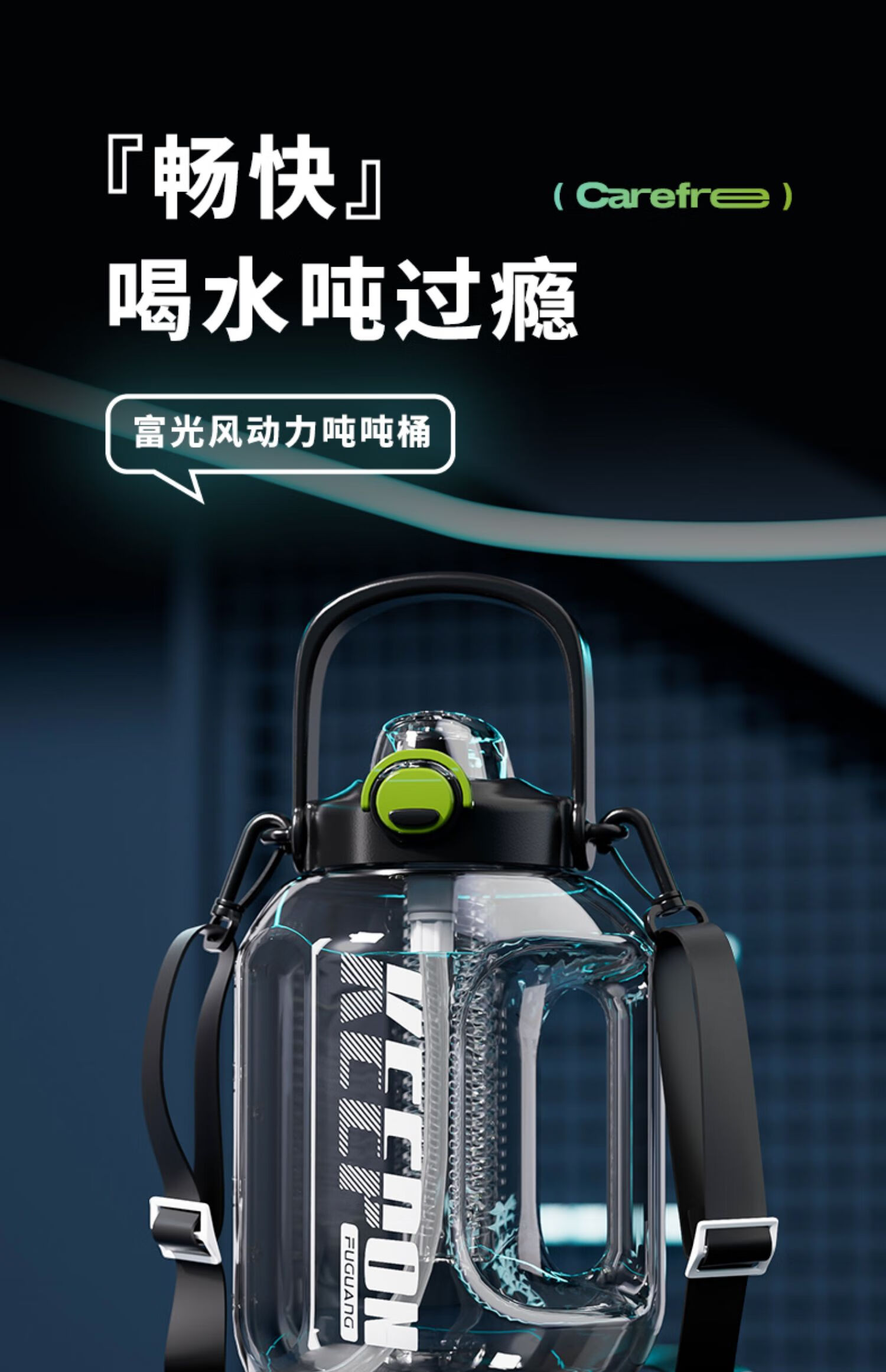 Fuguang large-capacity sports water cup men's ton bucket ton tritan summer straw kettle plastic fitness student high temperature resistant black 1600ml Tritan material + tea warehouse