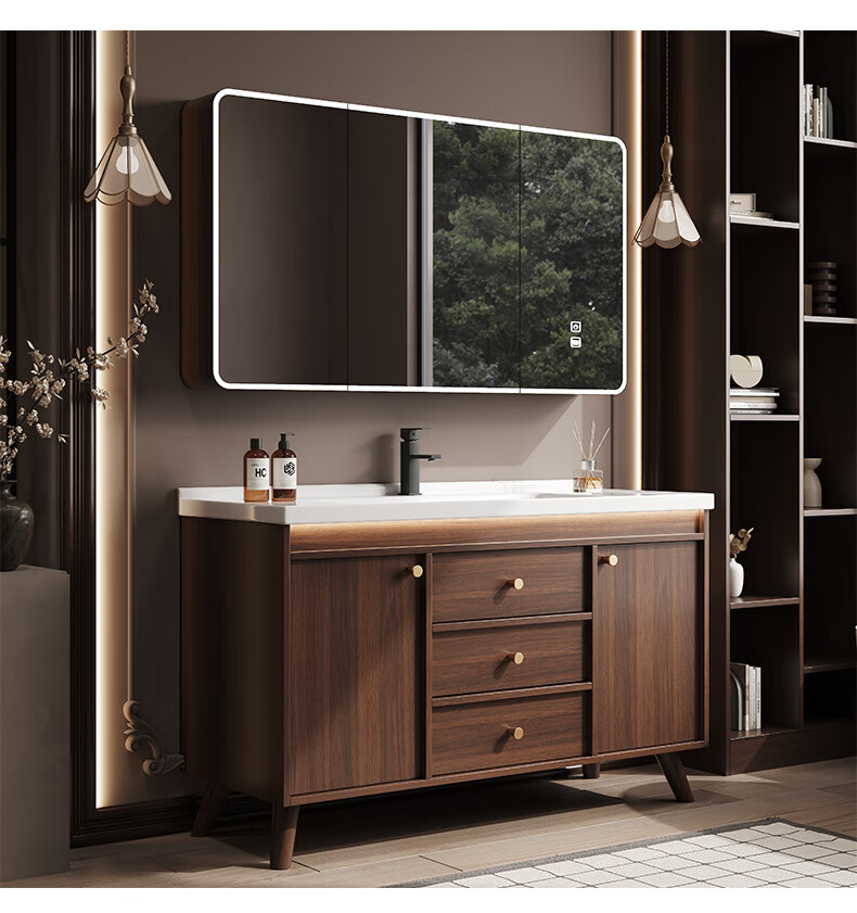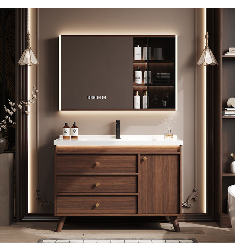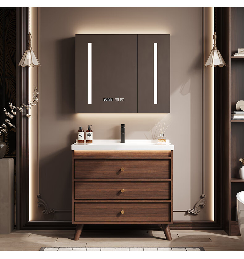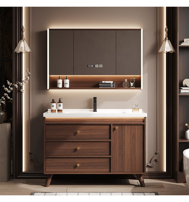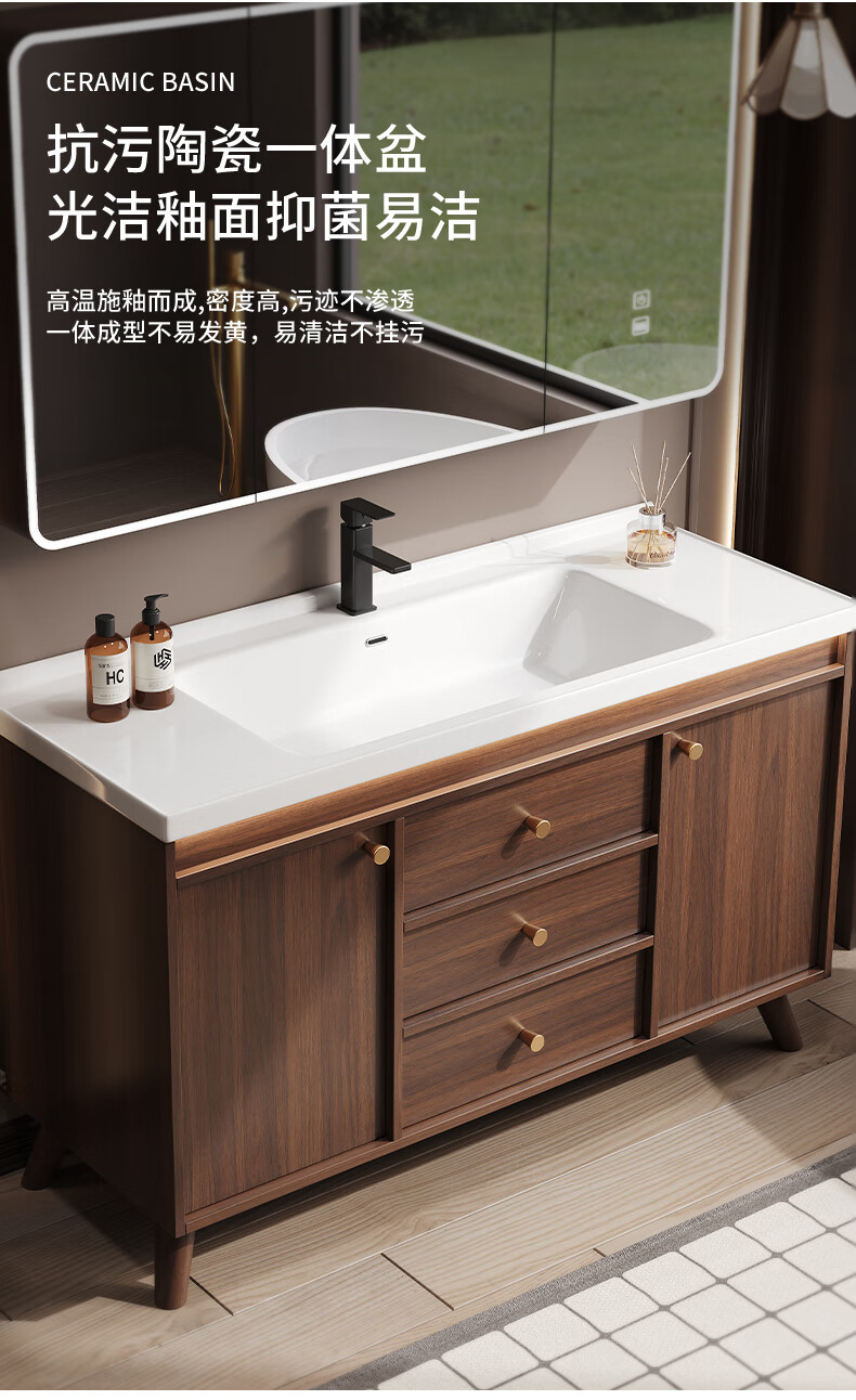 Hengjie new Chinese style walnut bathroom cabinet combination ceramic integrated basin floor-standing bathroom hand wash basin H08-80 walnut color/lower grid storage mirror cabinet (falling