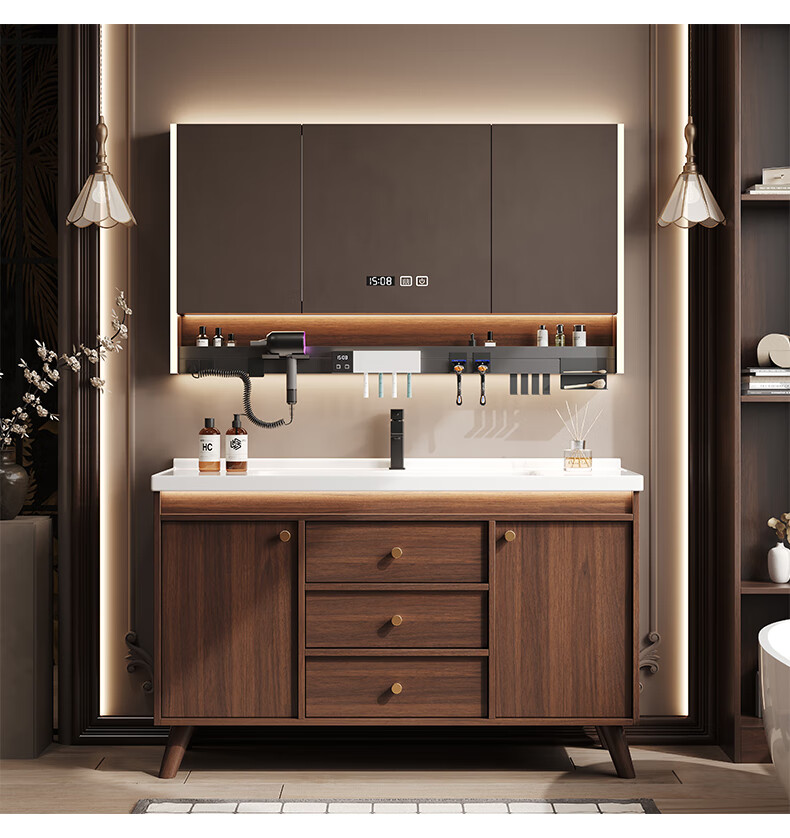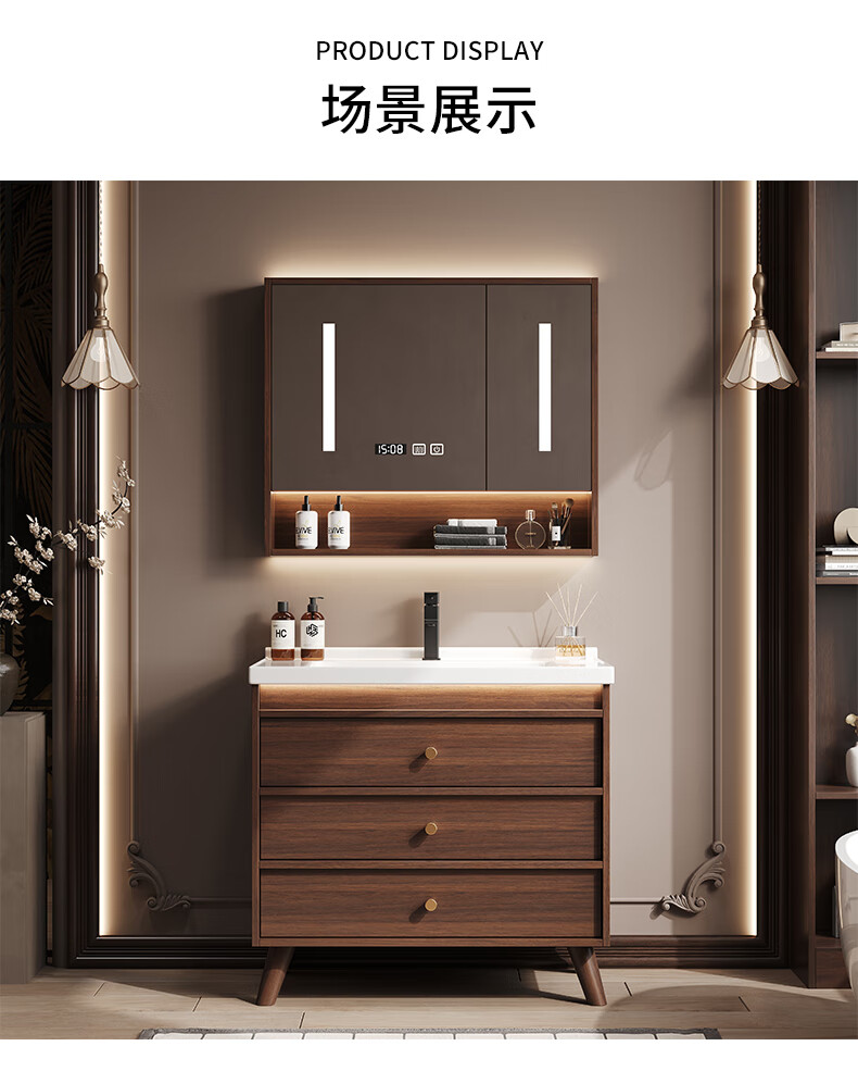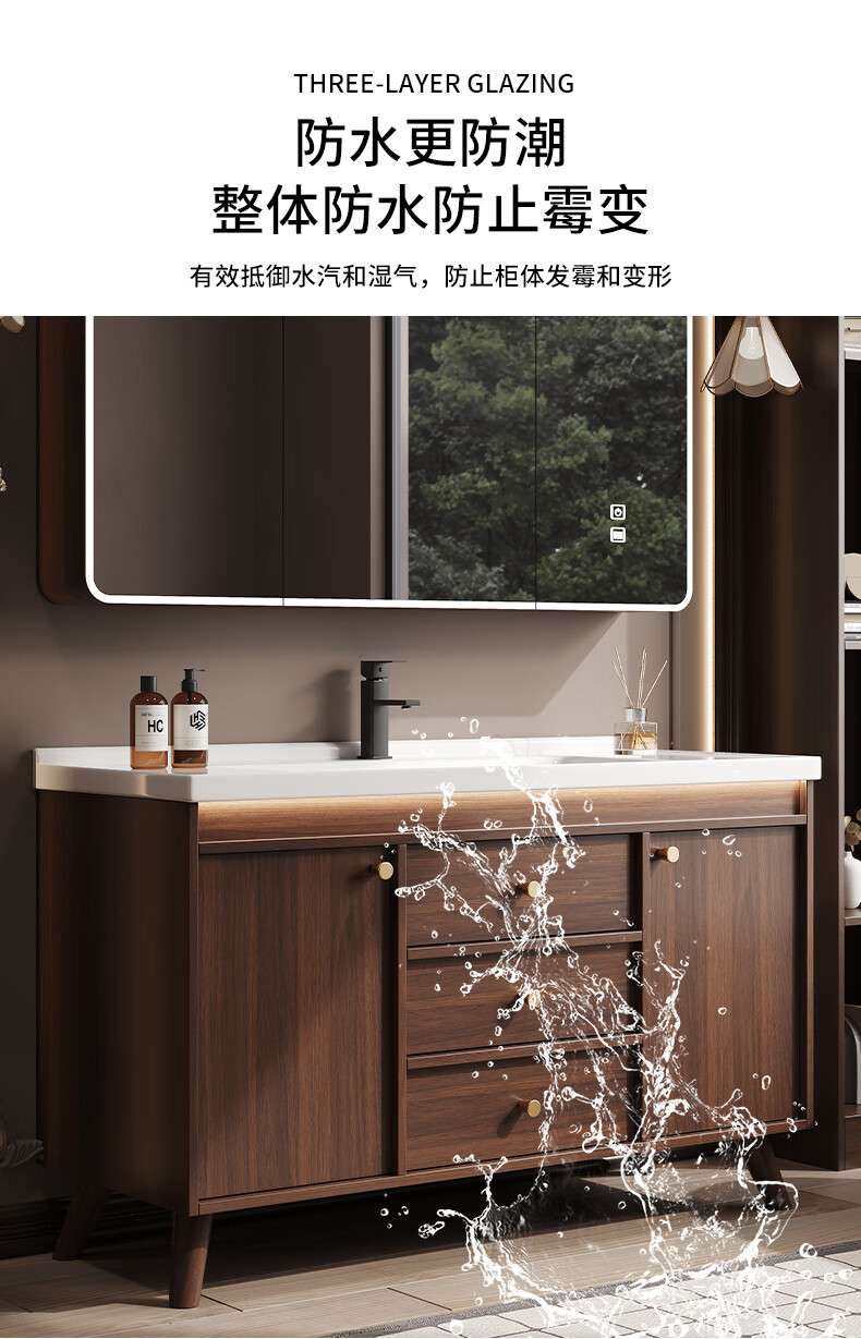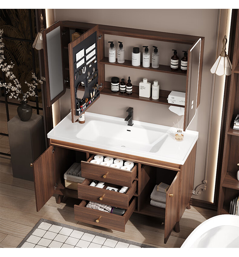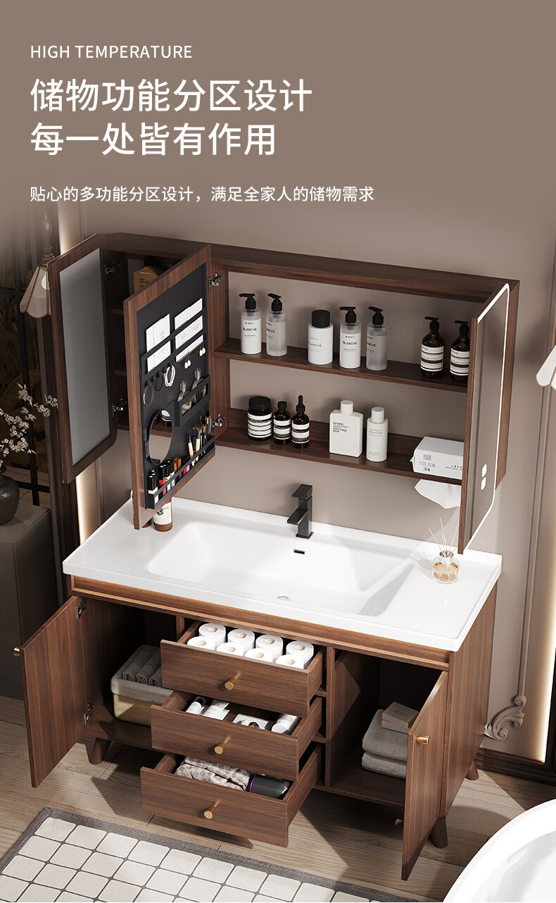 Hengjie new Chinese style walnut bathroom cabinet combination ceramic integrated basin floor-standing bathroom hand wash basin H08-80 walnut color/lower grid storage mirror cabinet (falling