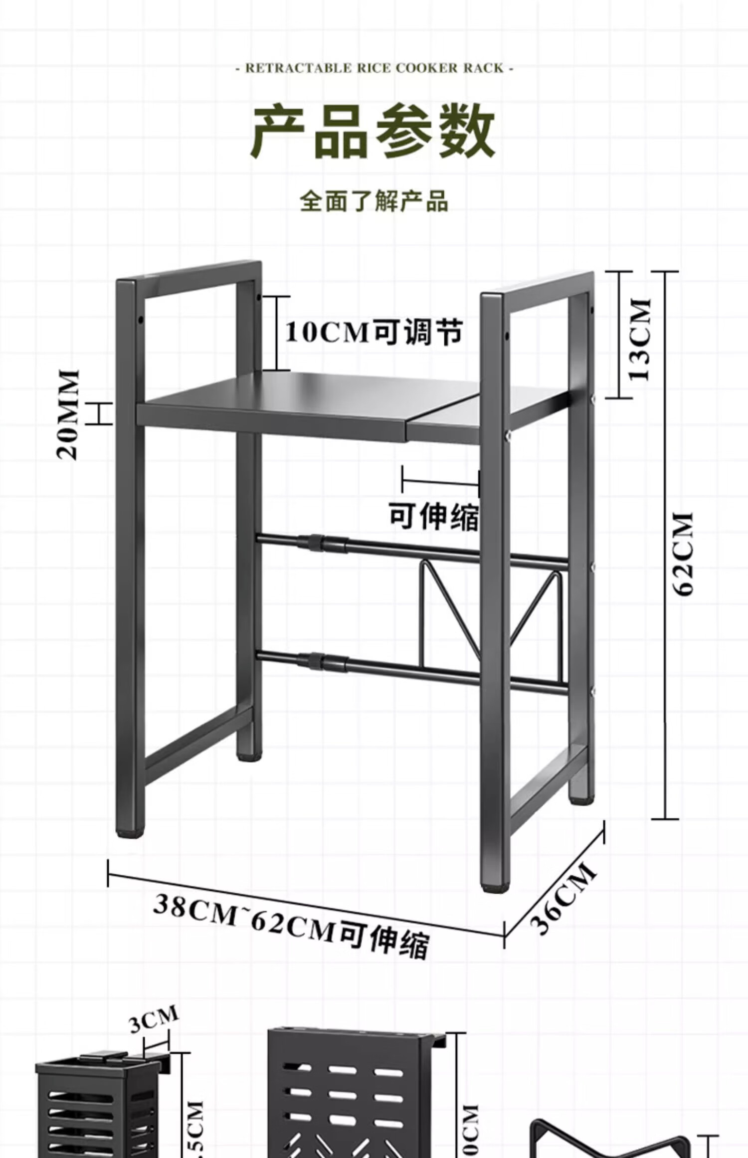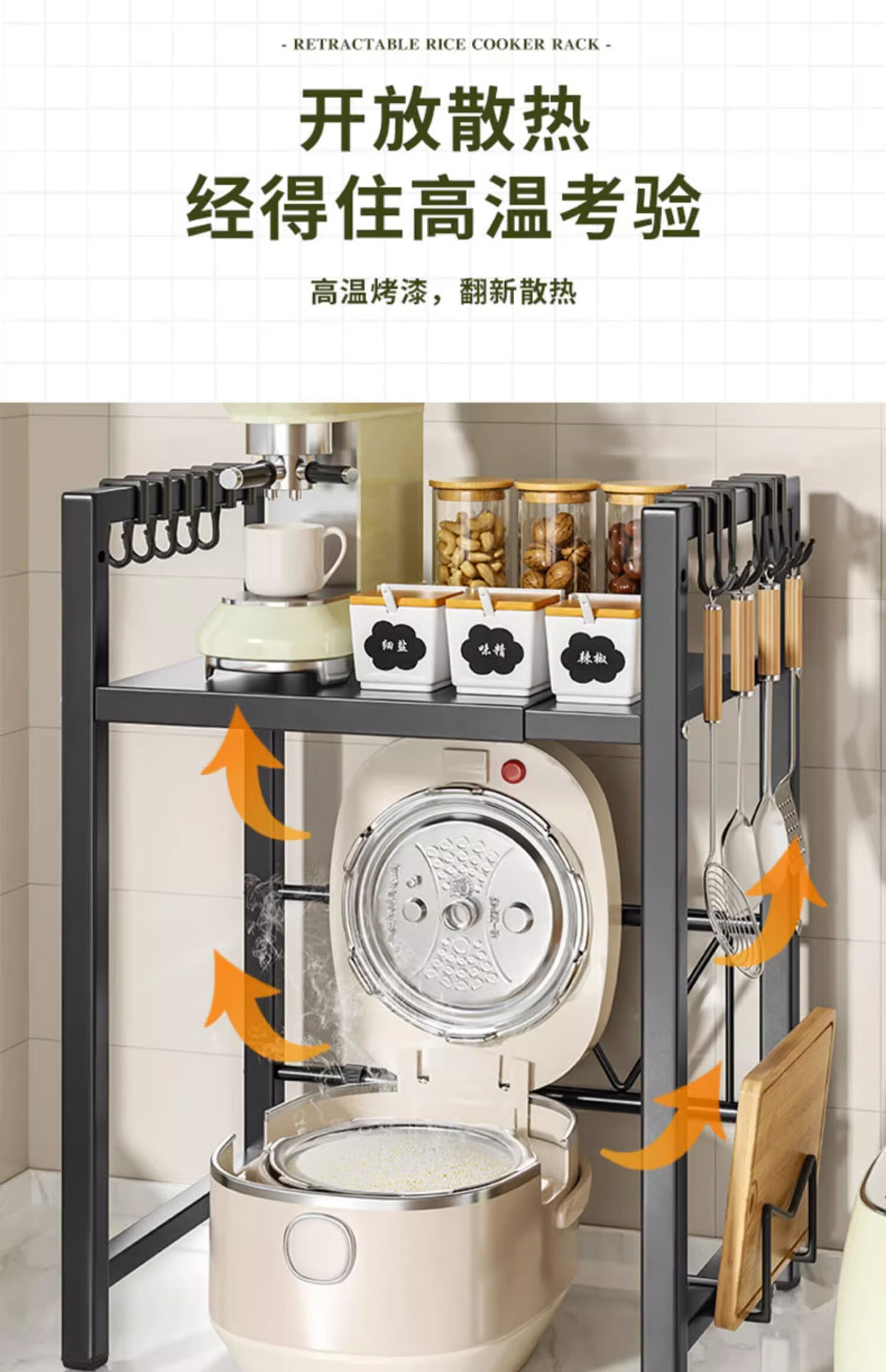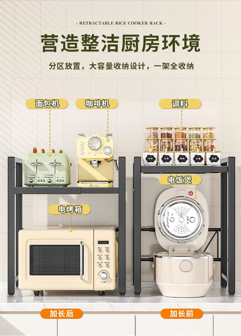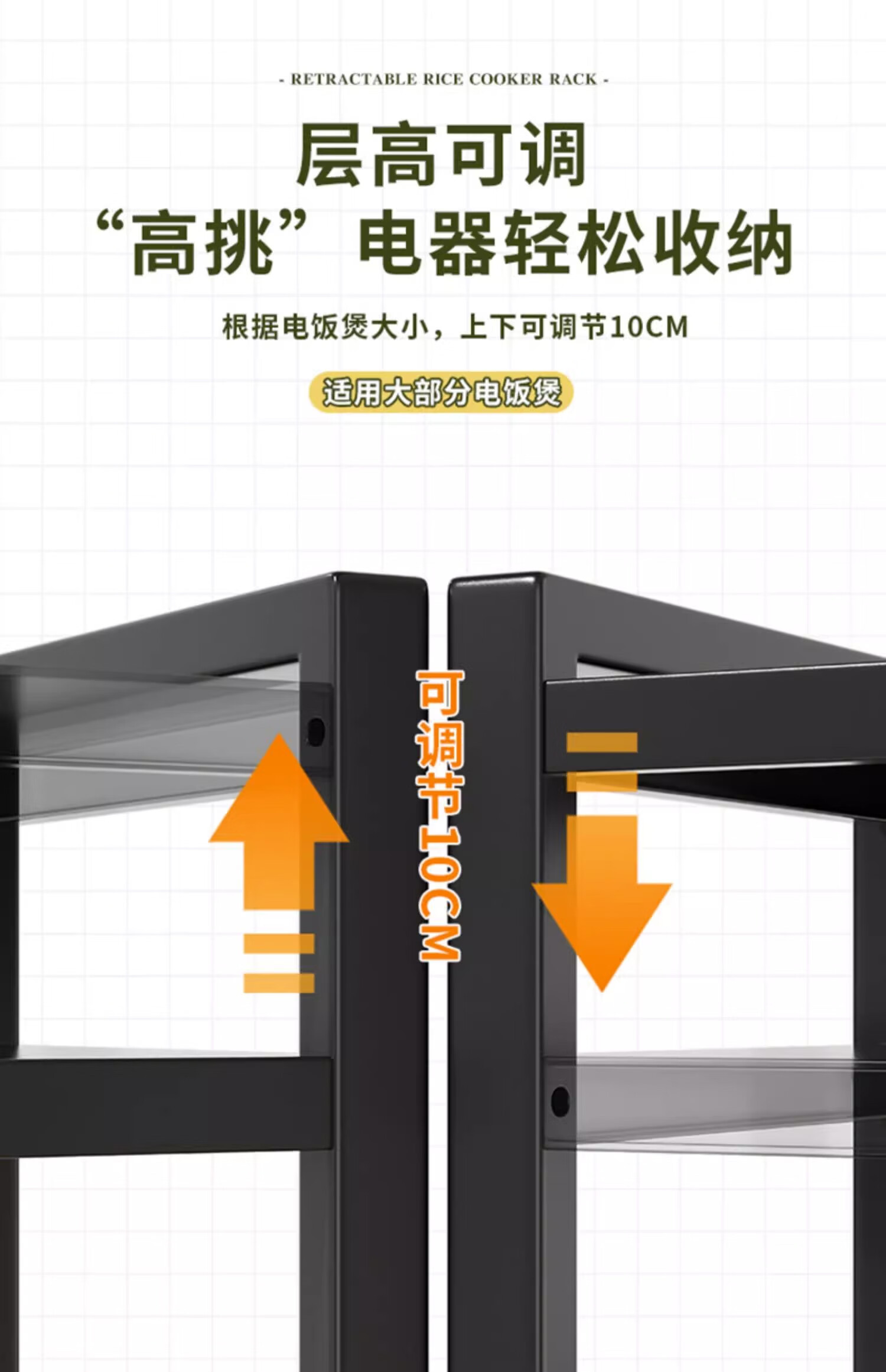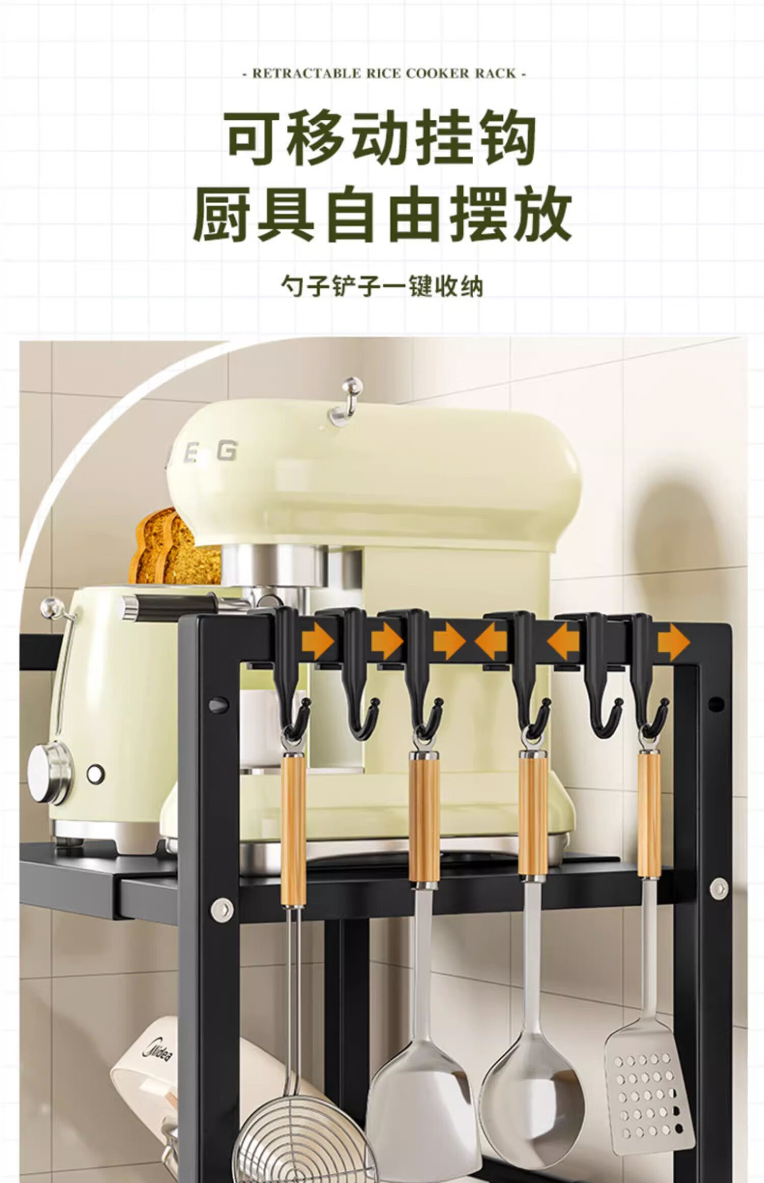 Home kitchen kitchen storage rack retractable rice cooker storage rack oven storage rack household countertop storage rack multi-function rack black 3-speed adjustment + hook