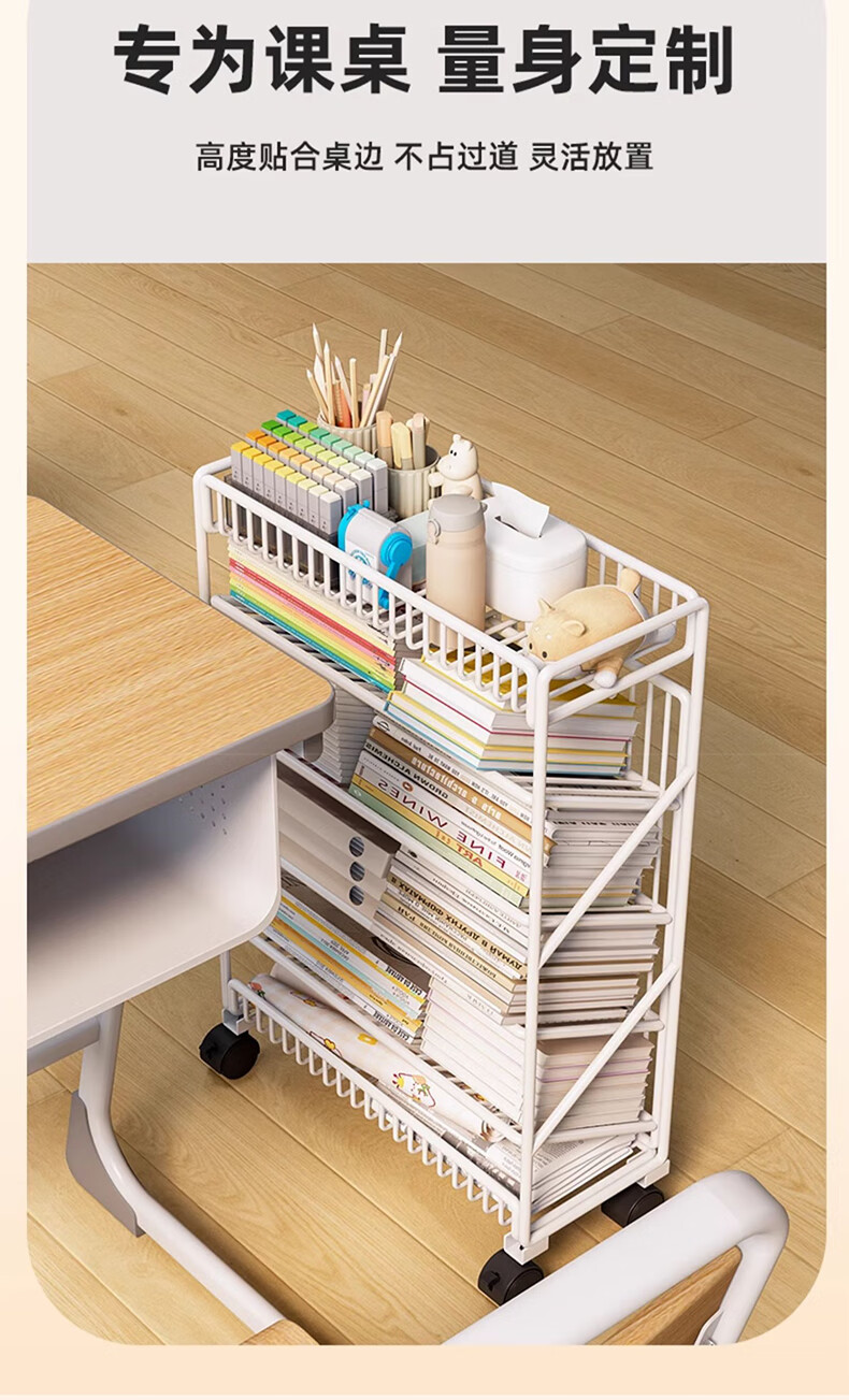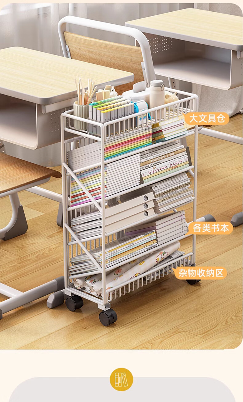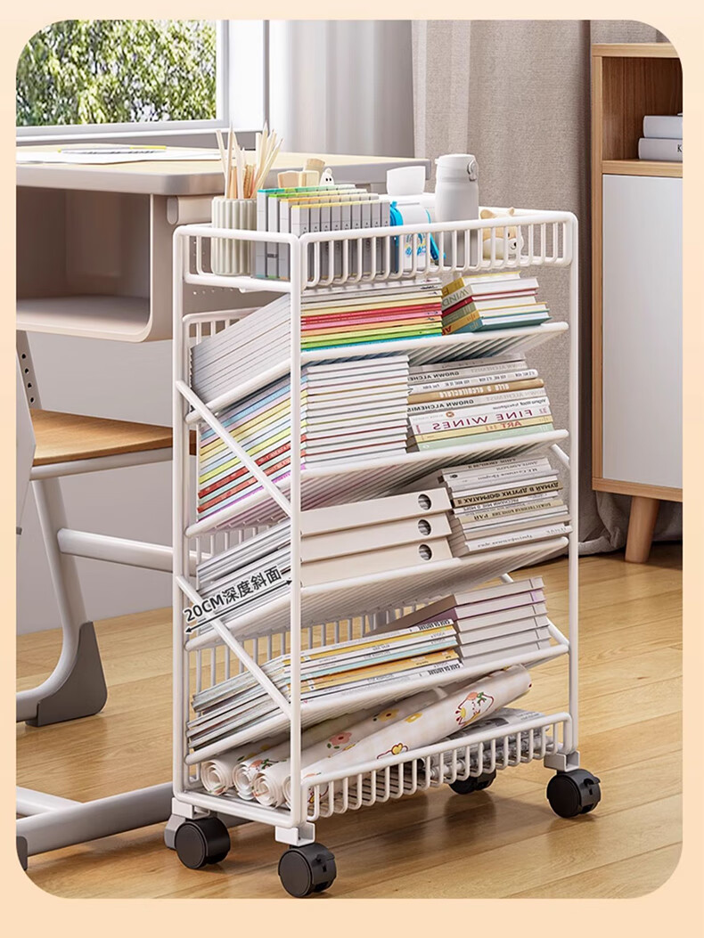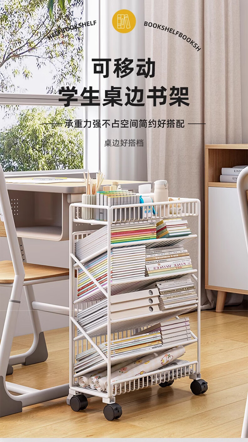 HALODN bookshelf movable tableside storage rack classroom desk for students to put books on the shelf with wheels, bookshelf, upgraded guardrail + pulleys*4, 6-layer black
