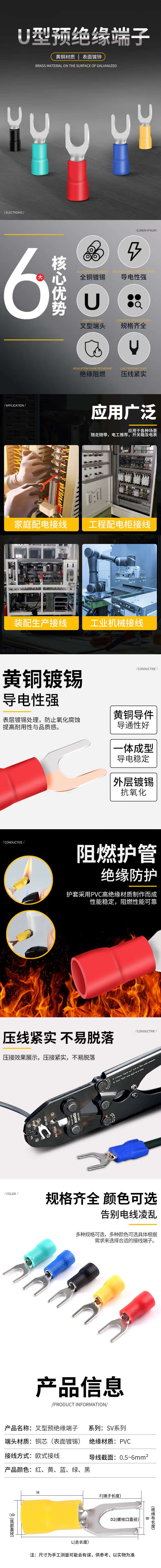SV1.25-3.2/4 European-style pre-insulated cold-pressed terminal block SV2/3.5-4/5 copper nose U/Y fork yellow brass SV1.25-3.2 (50 pieces)