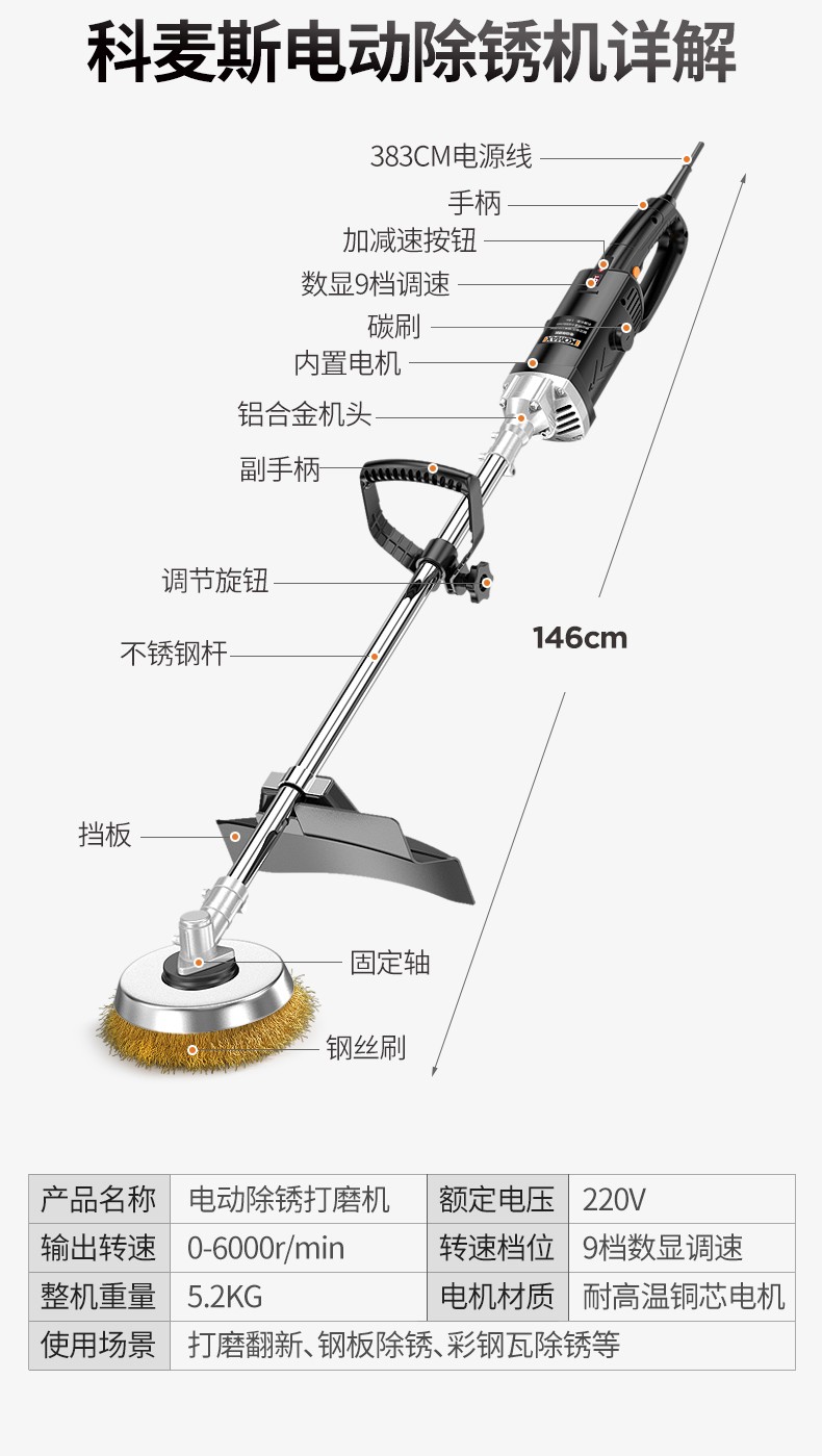 KEMAISI KEMAISI handheld electric rust remover grinder color steel tile cement floor steel wire 9-speed rust remover + 5 small wire wheels