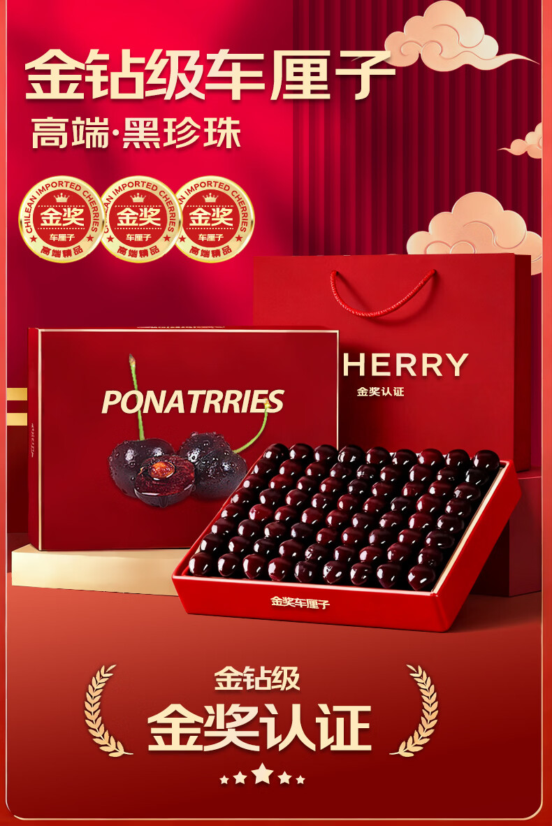 Guoxuan Chilean cherries JD - next-day delivery to many places. Cherry imported fruit gift box packed with new year gifts for parents. 2 pounds (net weight) (cost-effective package) early adopter gift box. Luxury grade. Solid and crisp. 4J Golden Diamond Fruit King 32-34mm.